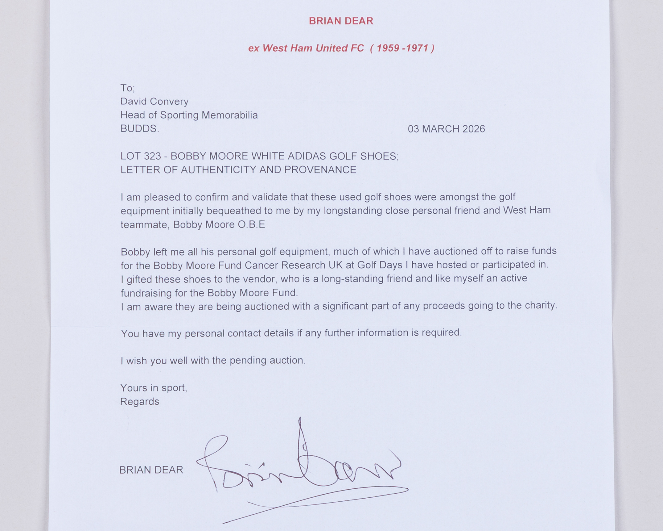 Bobby Moore white Adidas used golf shoes, with signs of wear, with letter of provenance from former West Ham United teammate Brian Dear