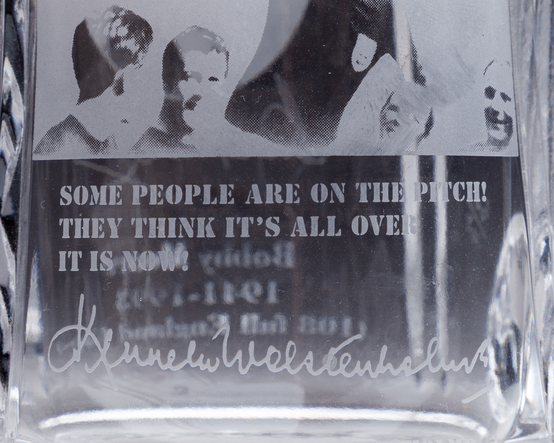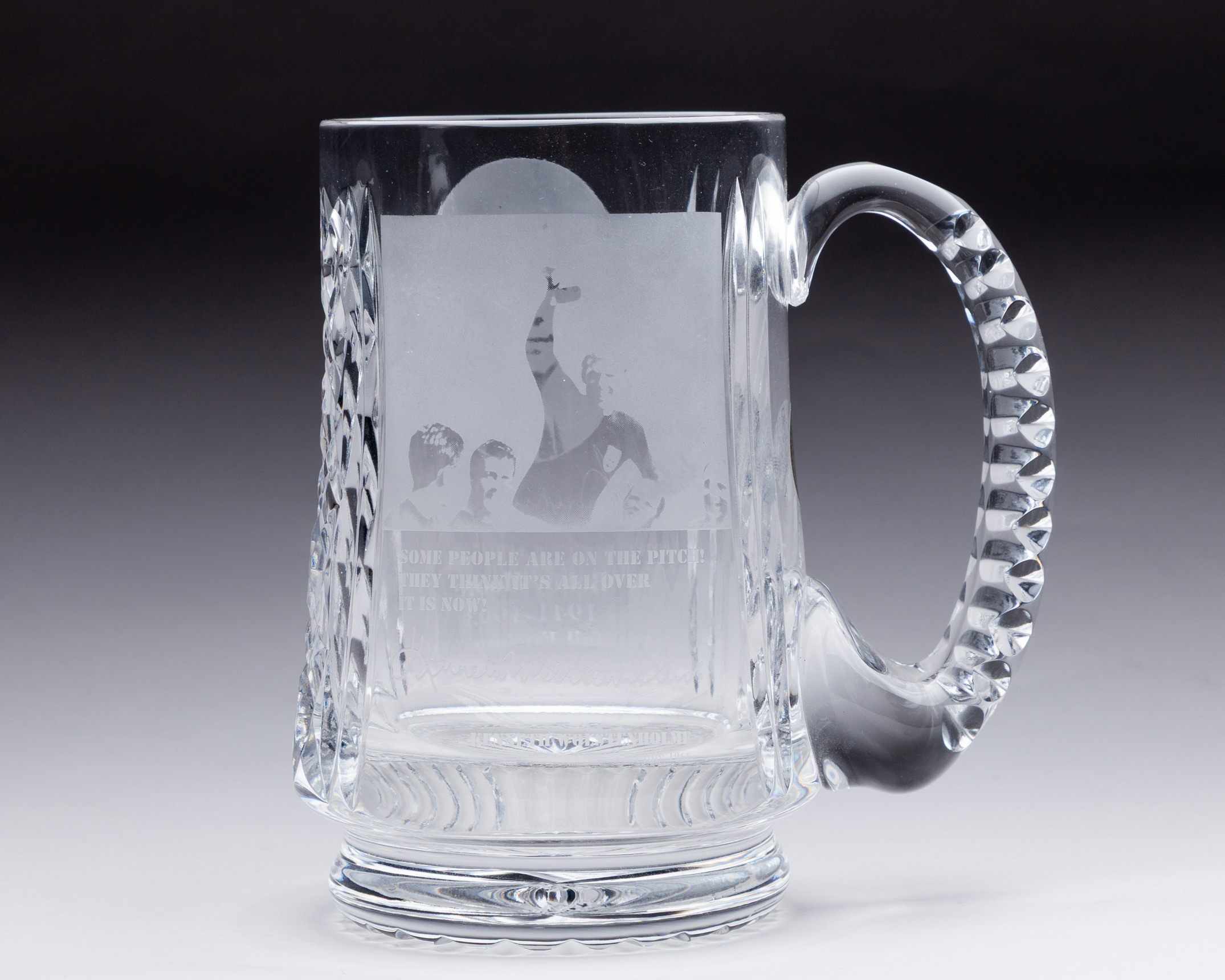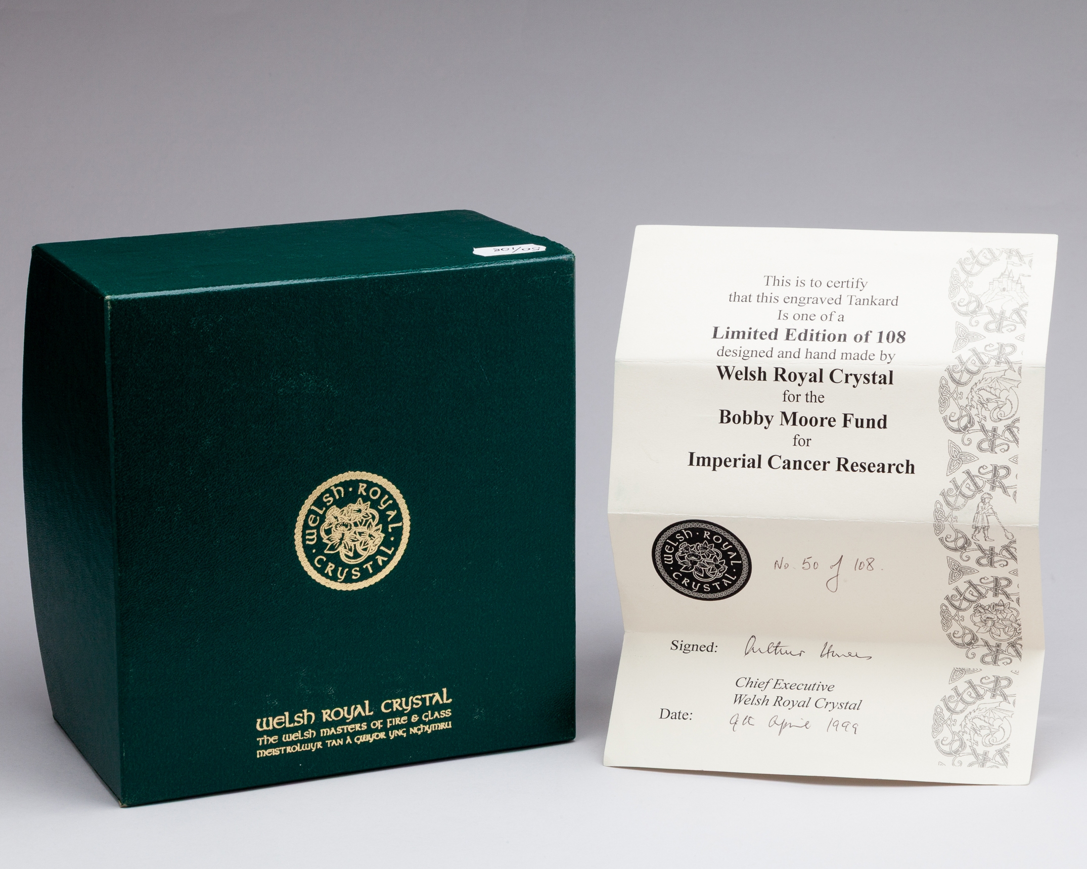 Bobby Moore Fund limited edition Welsh Royal Crystal tankard, 50 of 108, with Bobby Moore commemoration on one side and Kenneth Wolstenholme quote on the other, both accompanied with acid etched engraved signatures, with COA and original box