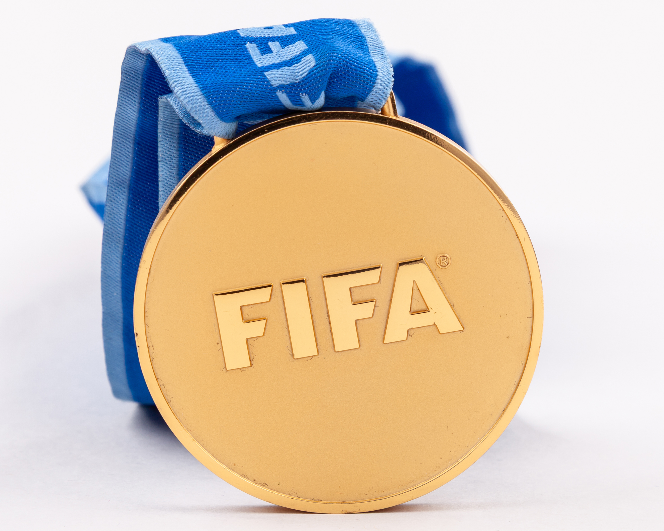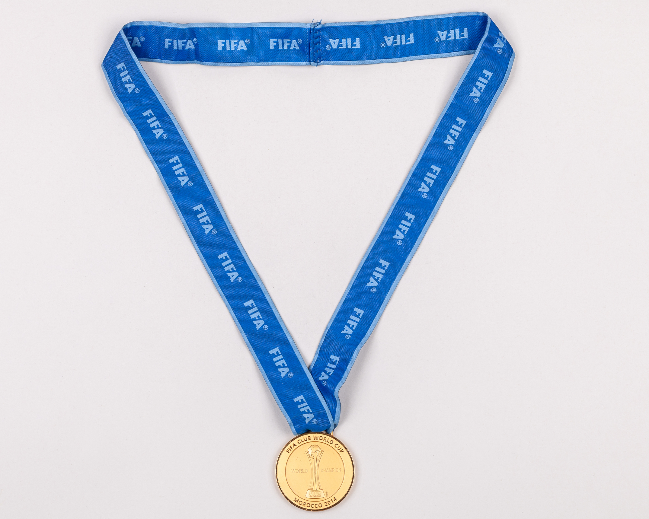2014 FIFA Club World Cup yellow-metal Real Madrid v. San Lorenzo winner's medal, the obverse inscribed FIFA CLUB WORLD CUP WORLD CHAMPION MOROCCO 2014, the reverse inscribed FIFA, with blue FIFA ribbon, recipient unknown