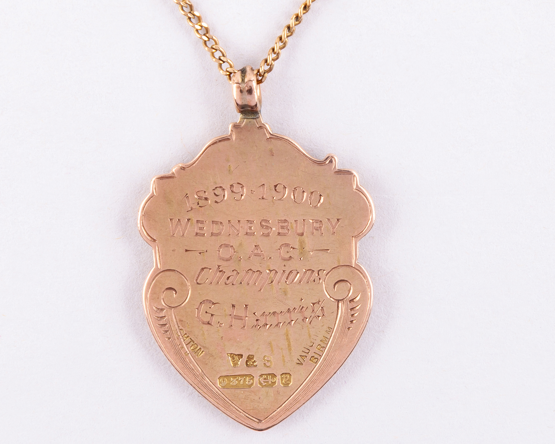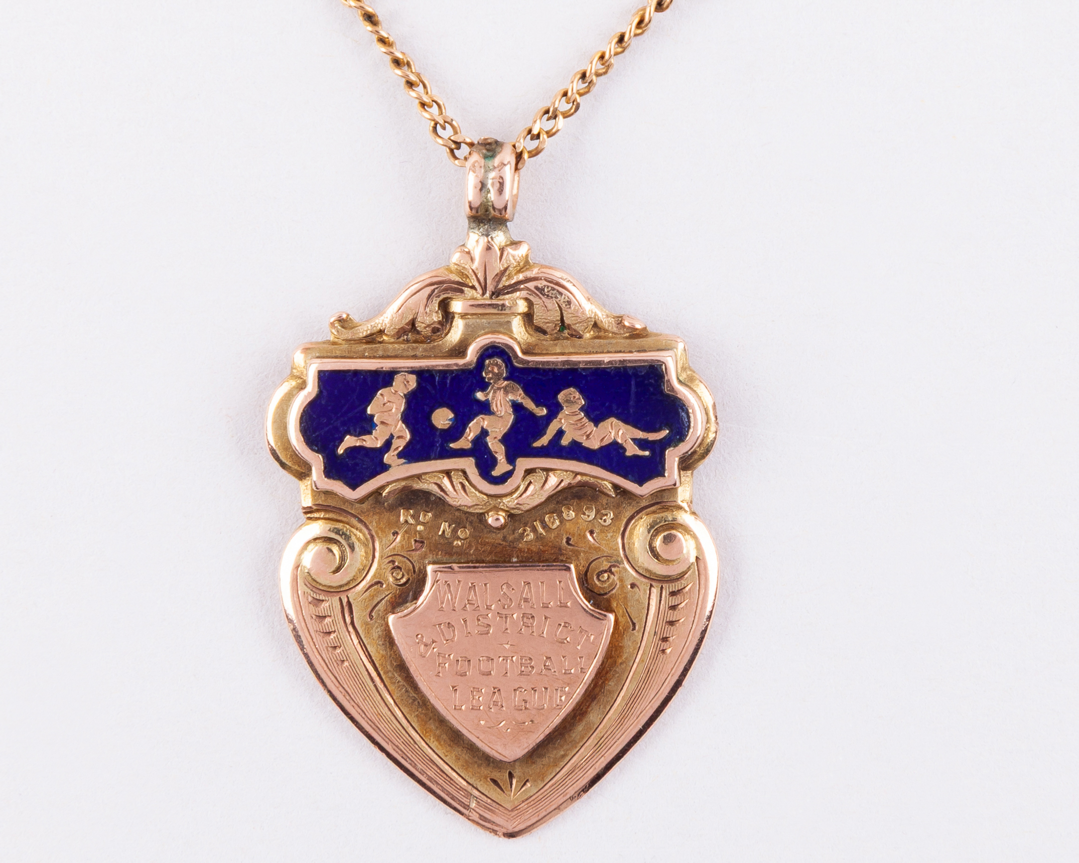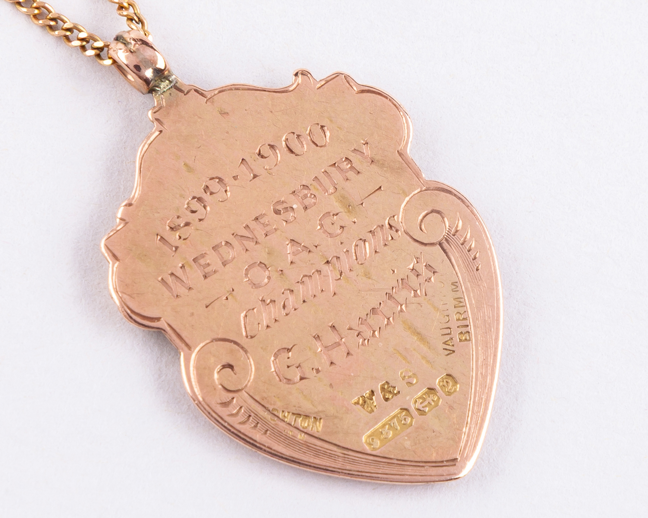 G. Harris 9ct gold and enamel Wednesbury Walsall & District Football League champions medal, 1899-1900, the observe inscribed WALSALL & DISTRICT FOOTBALL LEAGUE, the reverse inscribed 1899-1900 WEDNESBURY O.A.C. Champions G. Harris, with gold chain, 10g
