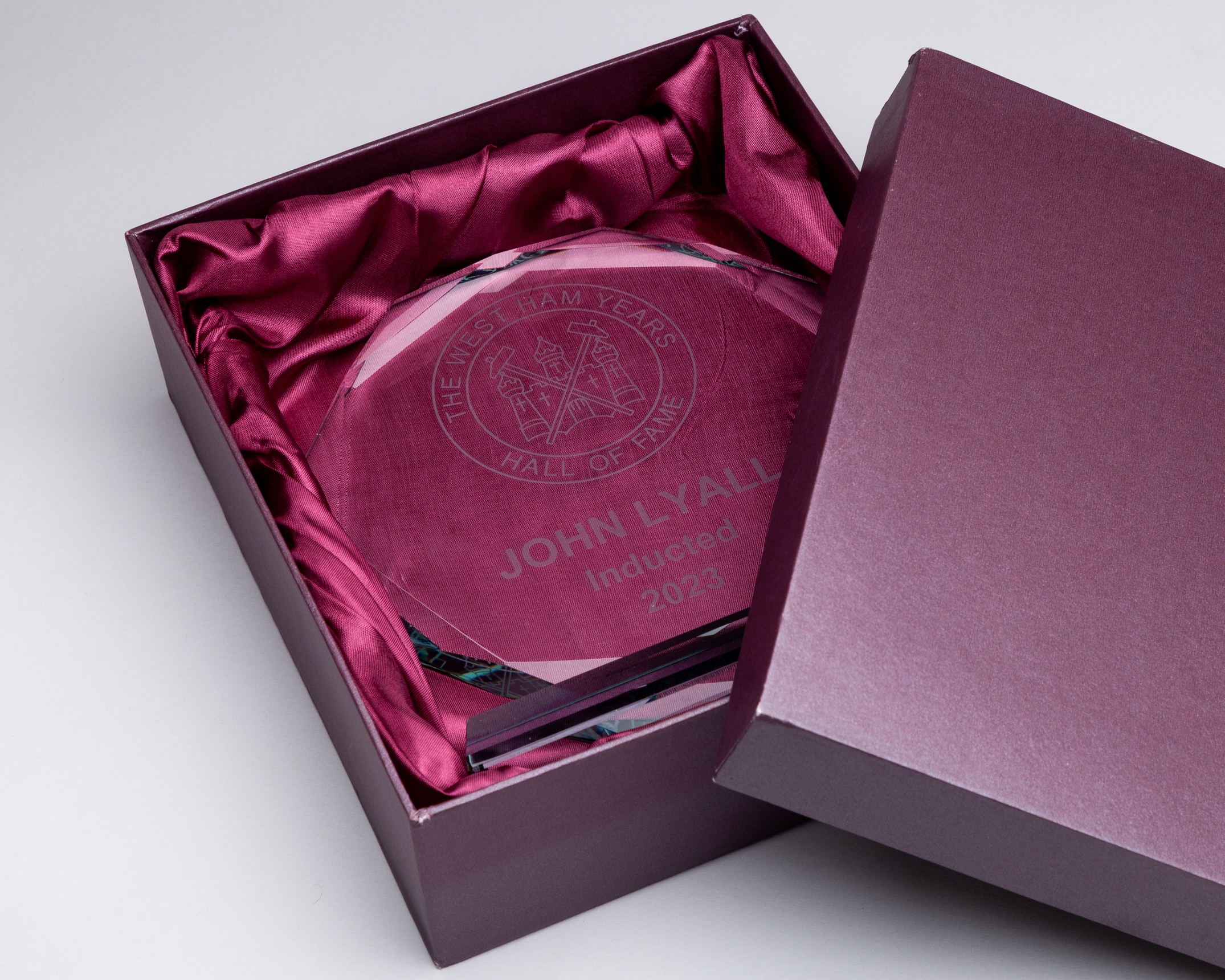 John Lyall "The West Ham Years" Hall of Fame prototype glass trophy, in original box