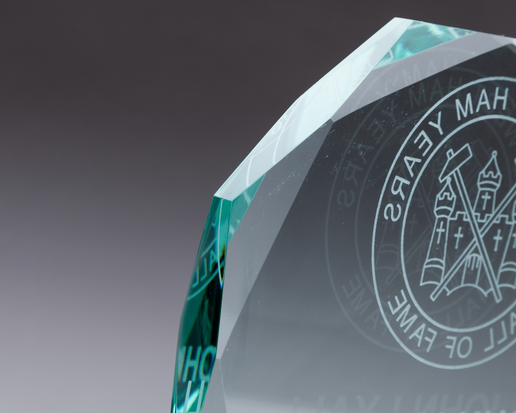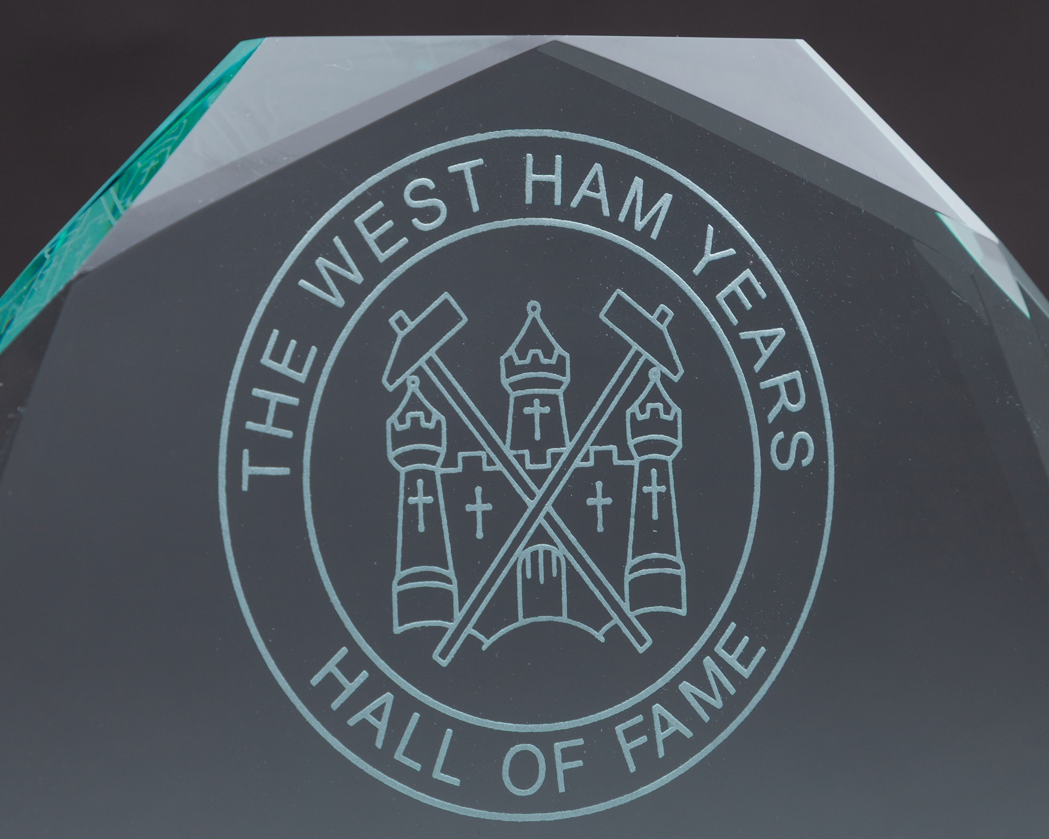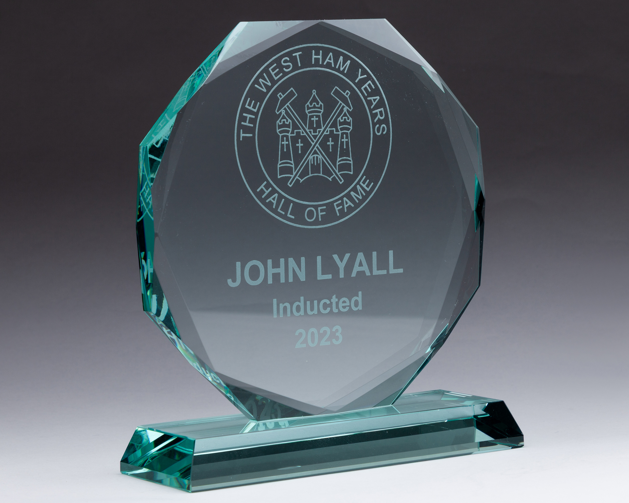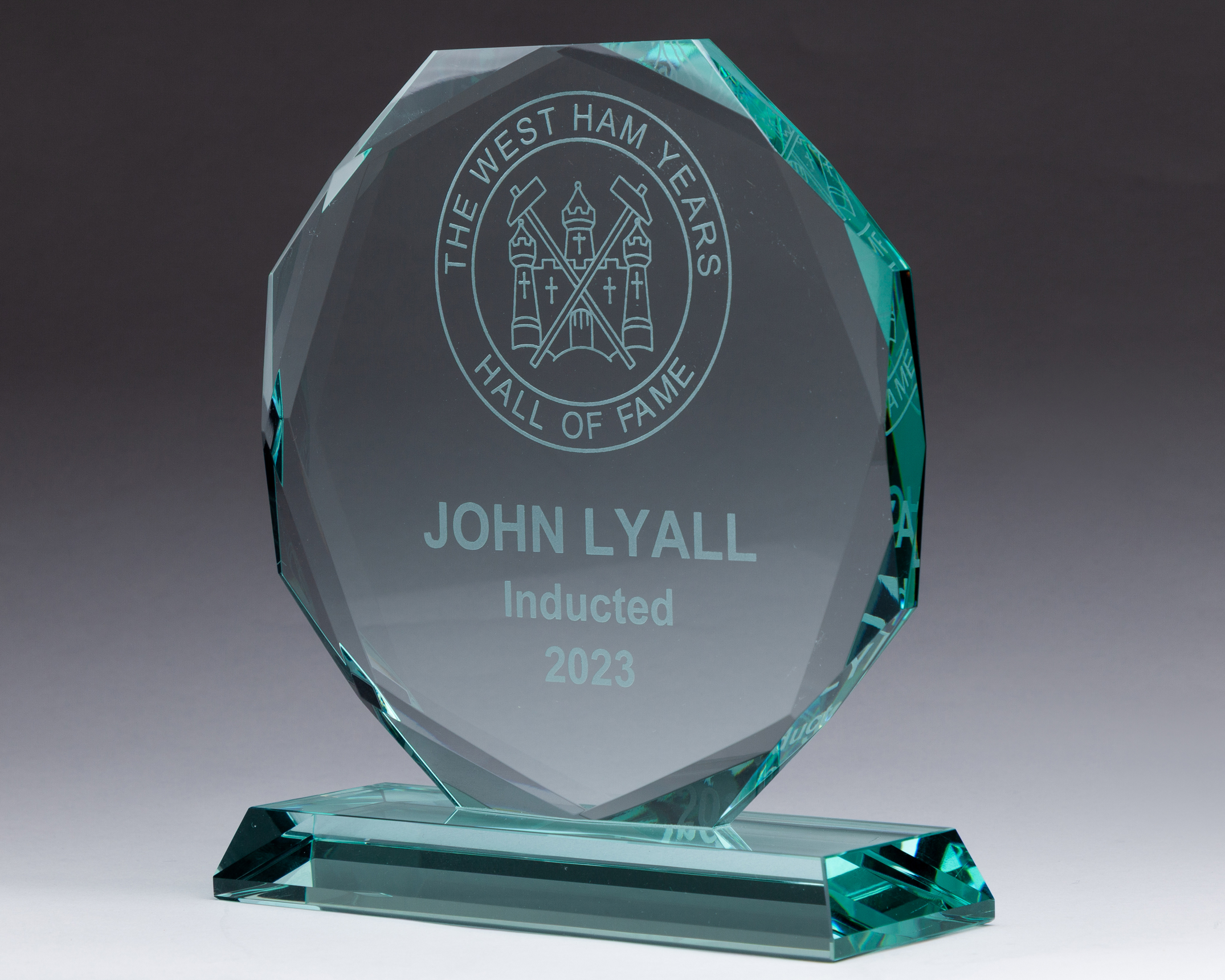 John Lyall "The West Ham Years" Hall of Fame prototype glass trophy