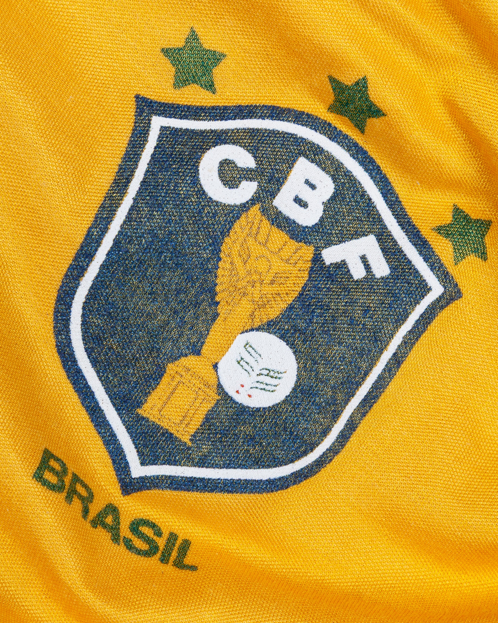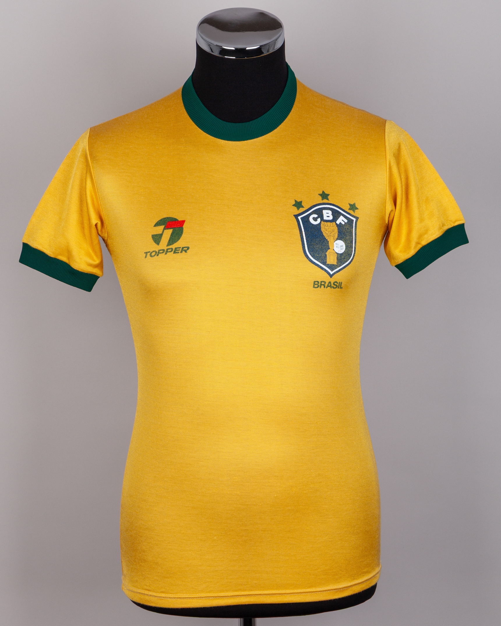 Roberto Dinamite yellow No.9 Brazil short-sleeved shirt, c.1983, Topper, with crew-neck collar and printed badge