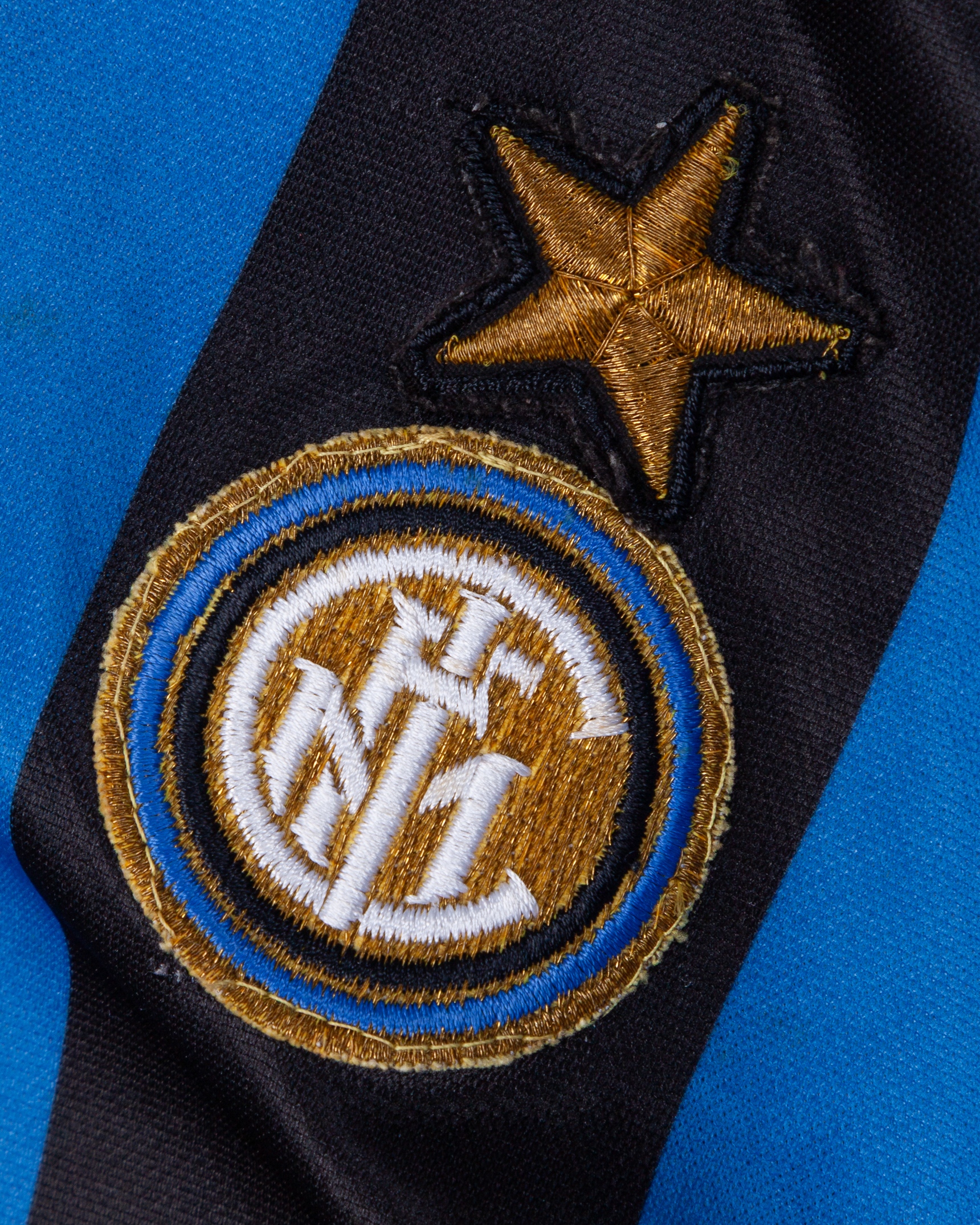 Lothar Matthaus autographed blue and black No.10 Inter Milan short-sleeved shirt, 1990-91, Uhlsport, XL, with v-neck collar and embroidered cloth badge, autographed on the number, with some pulls and staining