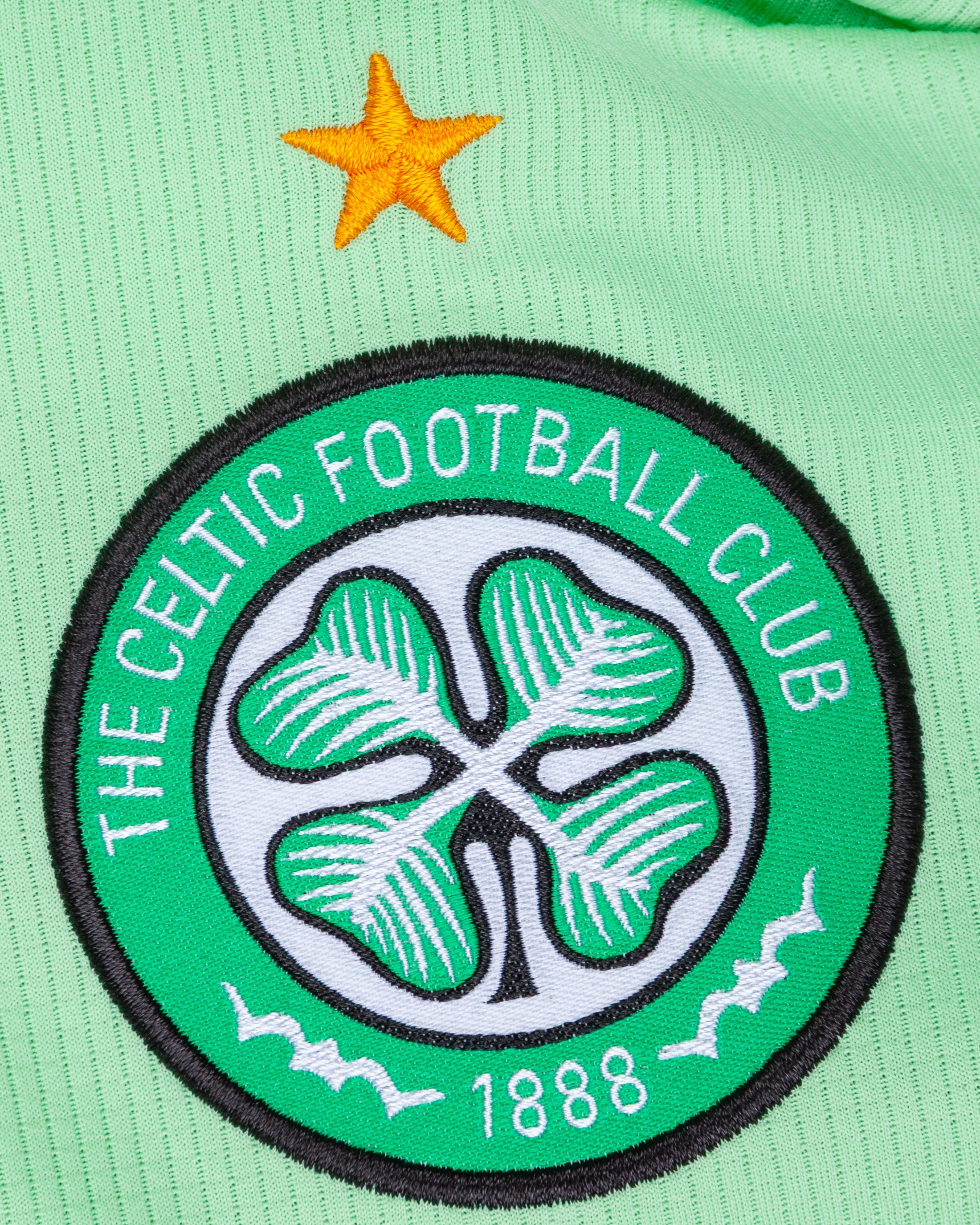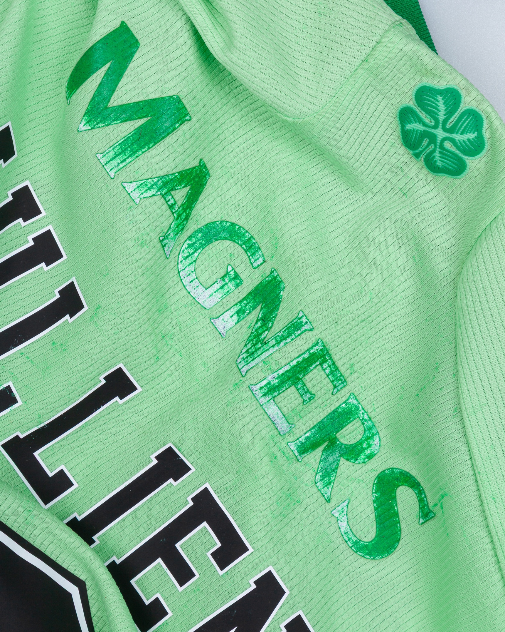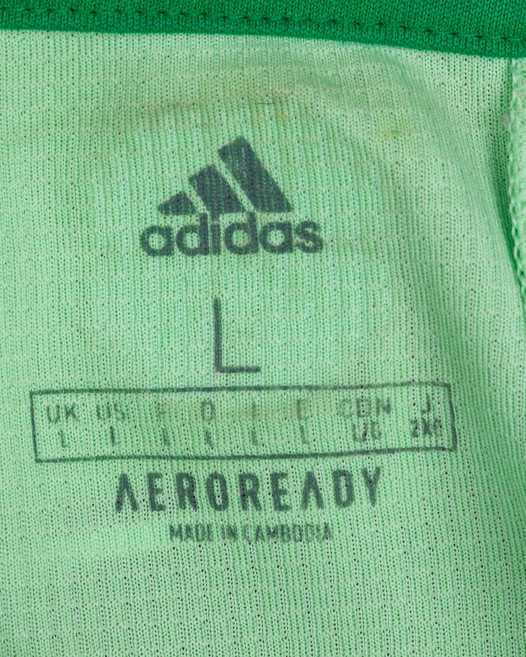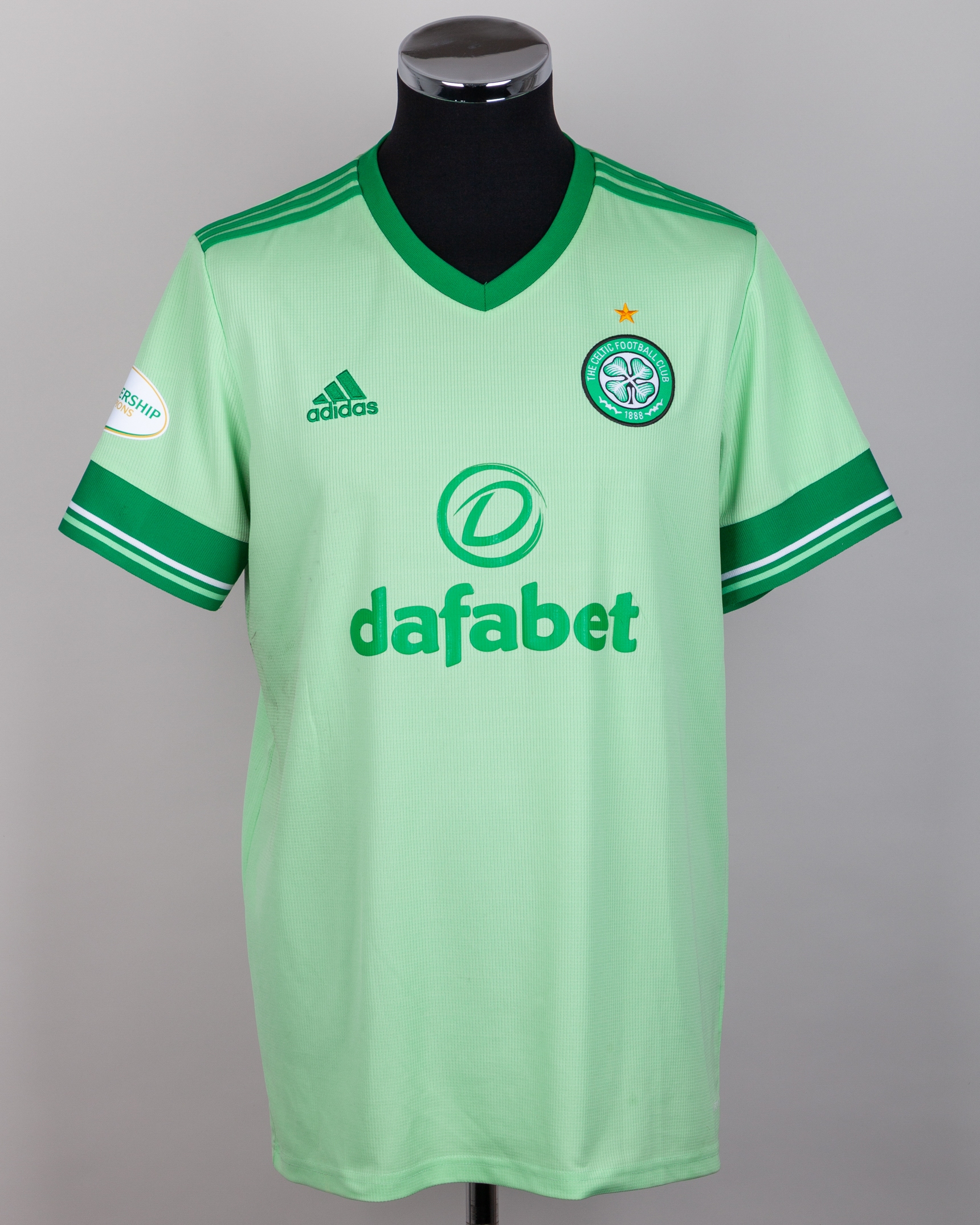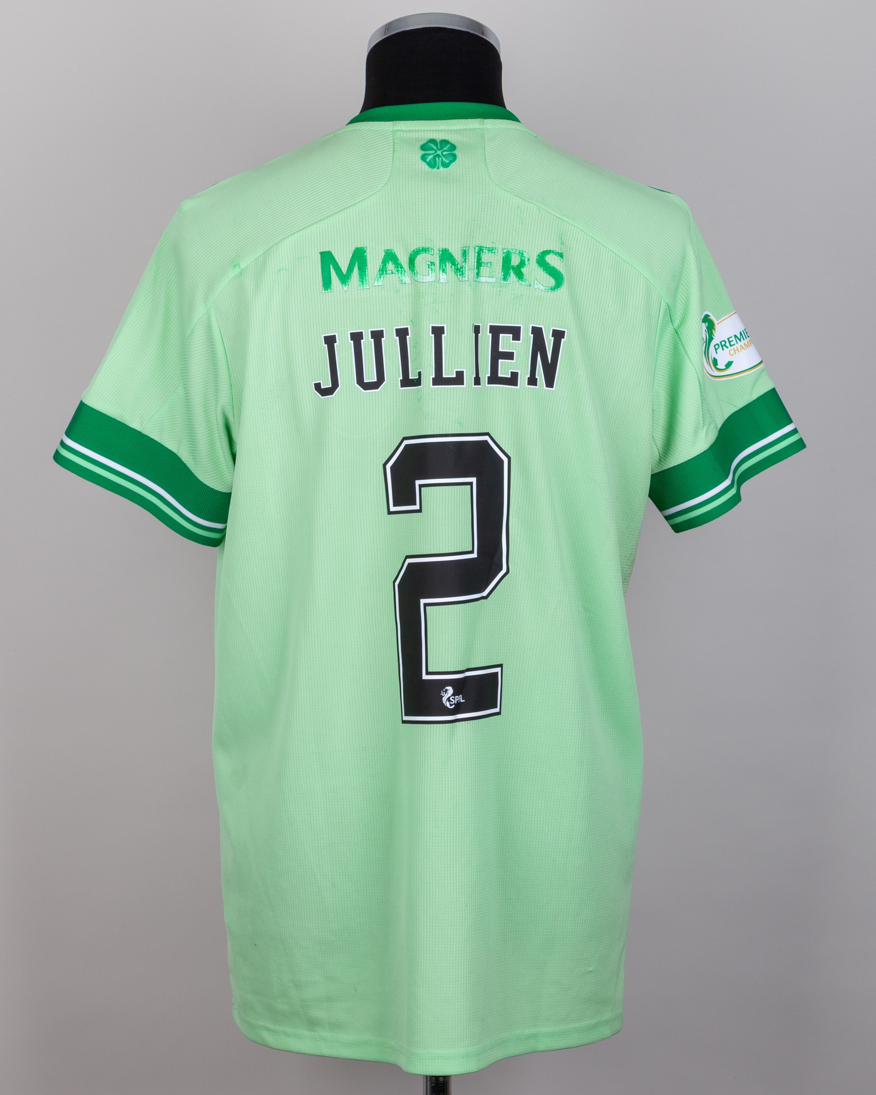 Christopher Jullien lime green No.2 Celtic match issued short-sleeved shirt, 2020-21, Adidas, L, with v-neck collar and embroidered cloth badge inscribed THE CELTIC FOOTBALL COMPNAY 1888, the reverse lettered JULLIEN, the right sleeve with Premiership Champions flash, wear to sponsor's logo on the reverse, staining front and back