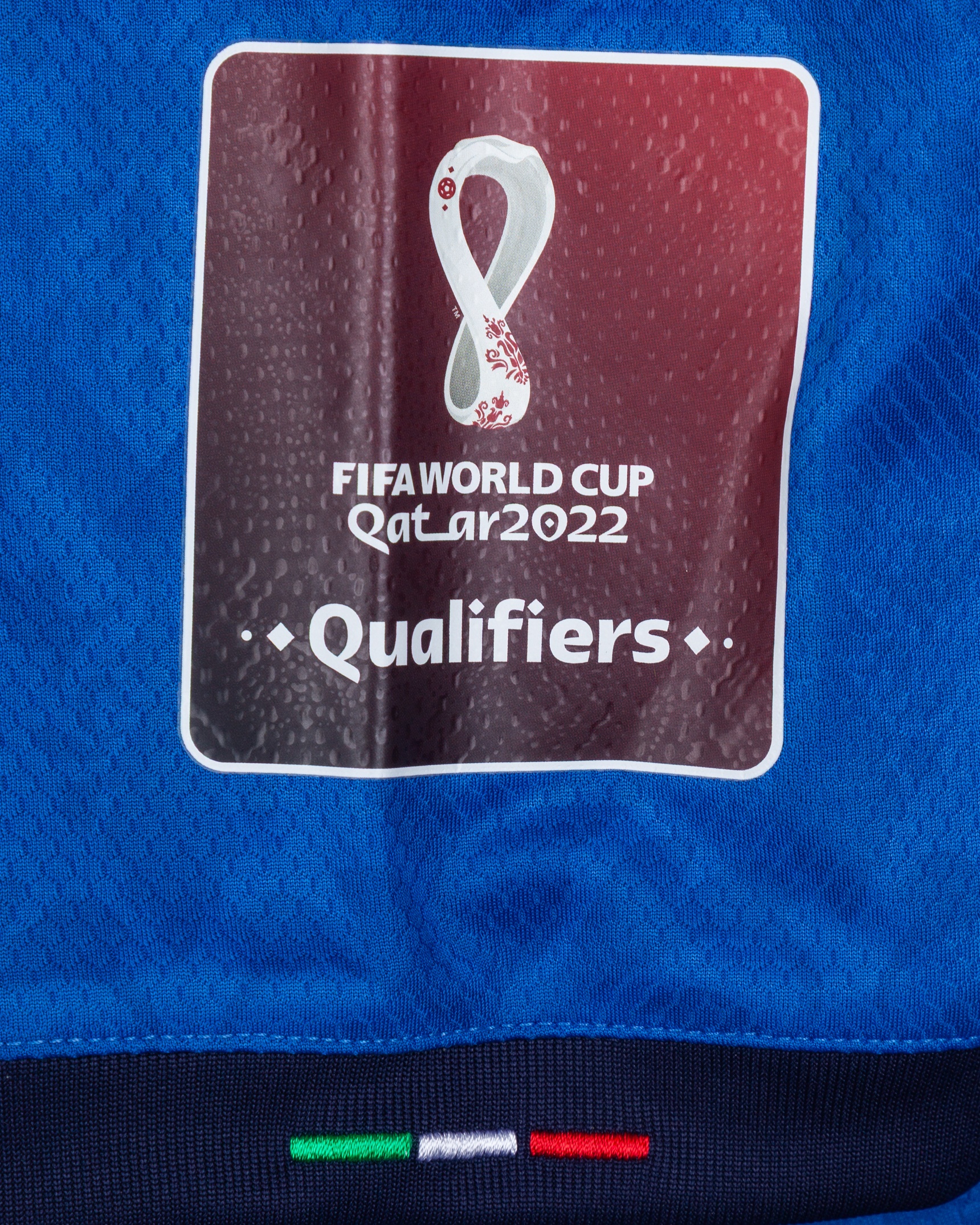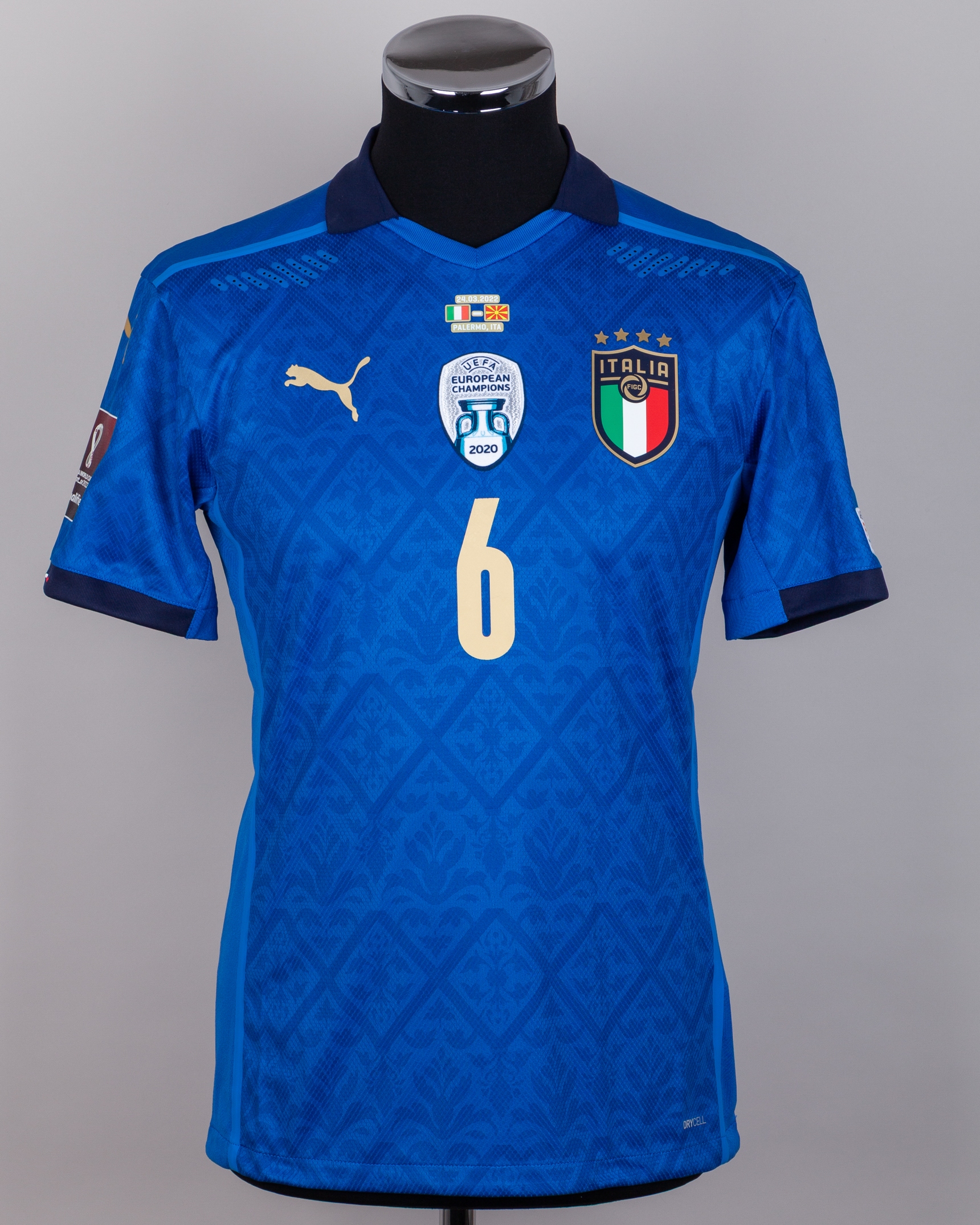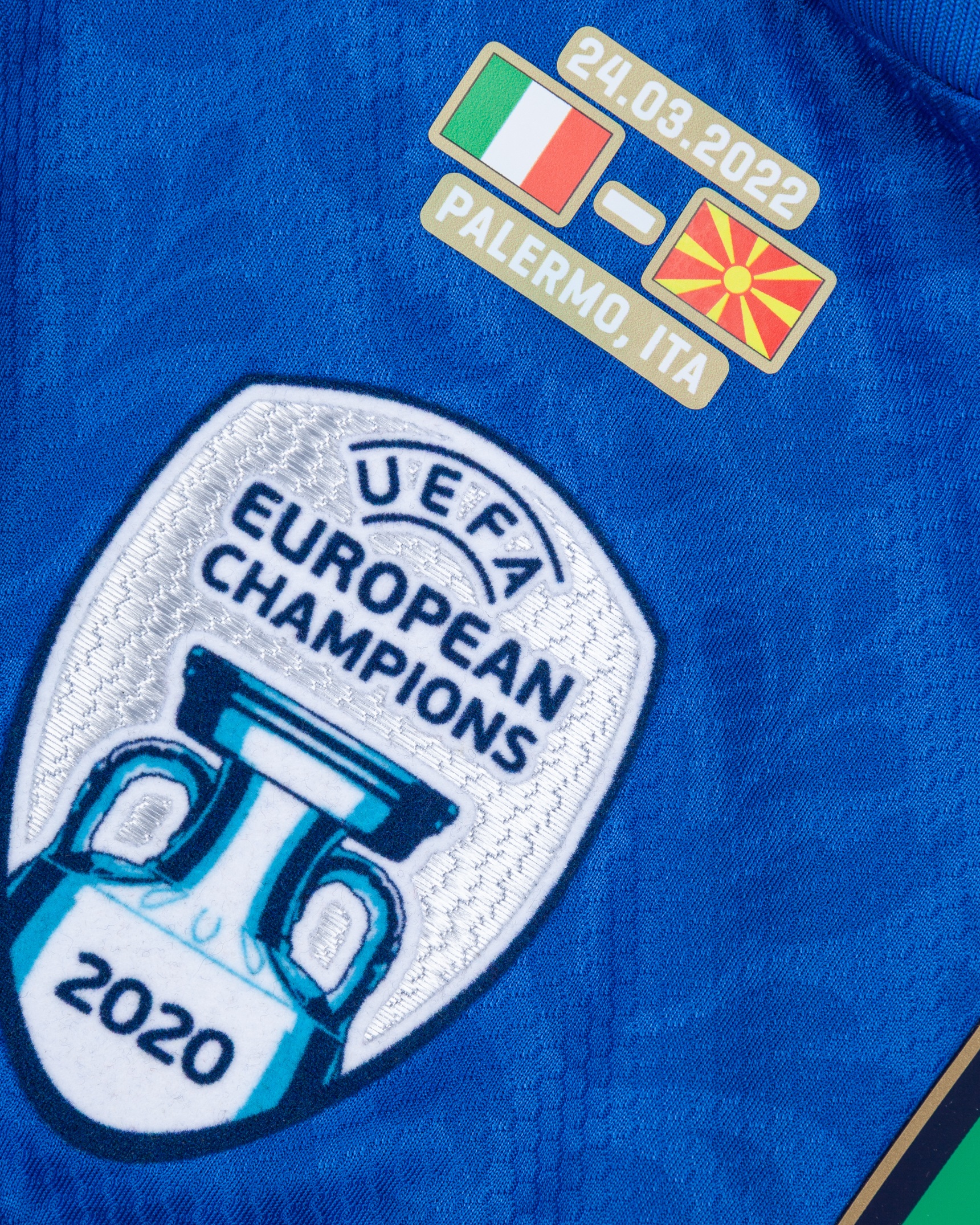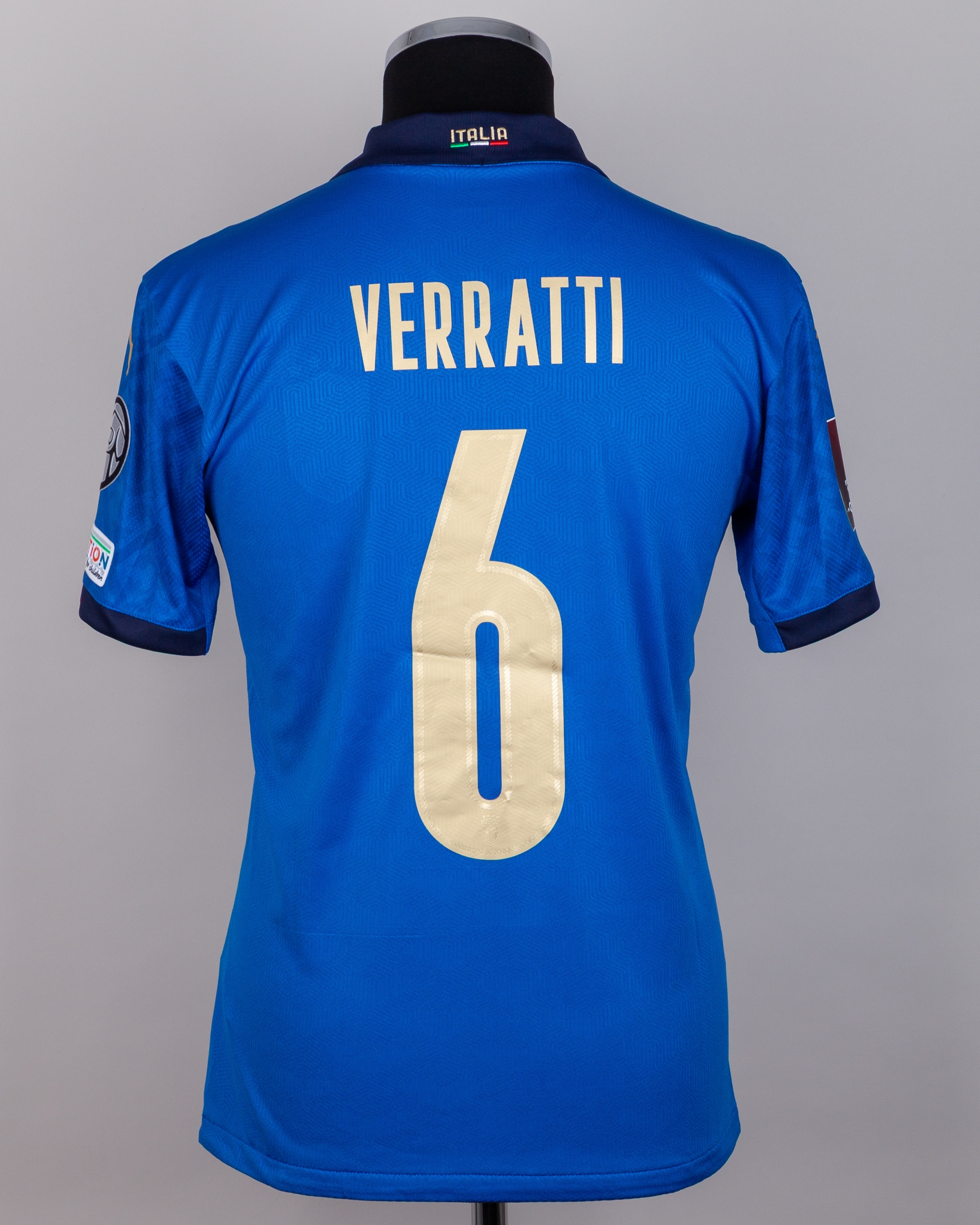 Marco Veratti blue No.6 Italy v. North Macedonia match issued short-sleeved shirt, 2022, Puma, M, with v-neck collar and printed badge, 24.03.2022 PALERMNO, ITA and flags of nations decal, with UEFA EUROPEAN CHAMPIONS 2020 badge, the reverse lettered VERRATTI, the right sleeve with FIFA World Cup Qatar 2022 Qualifiers flash, the other with UEFA Foundations for Children flash