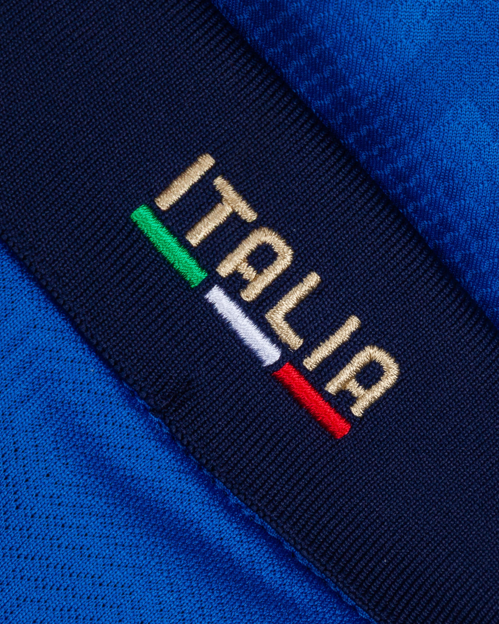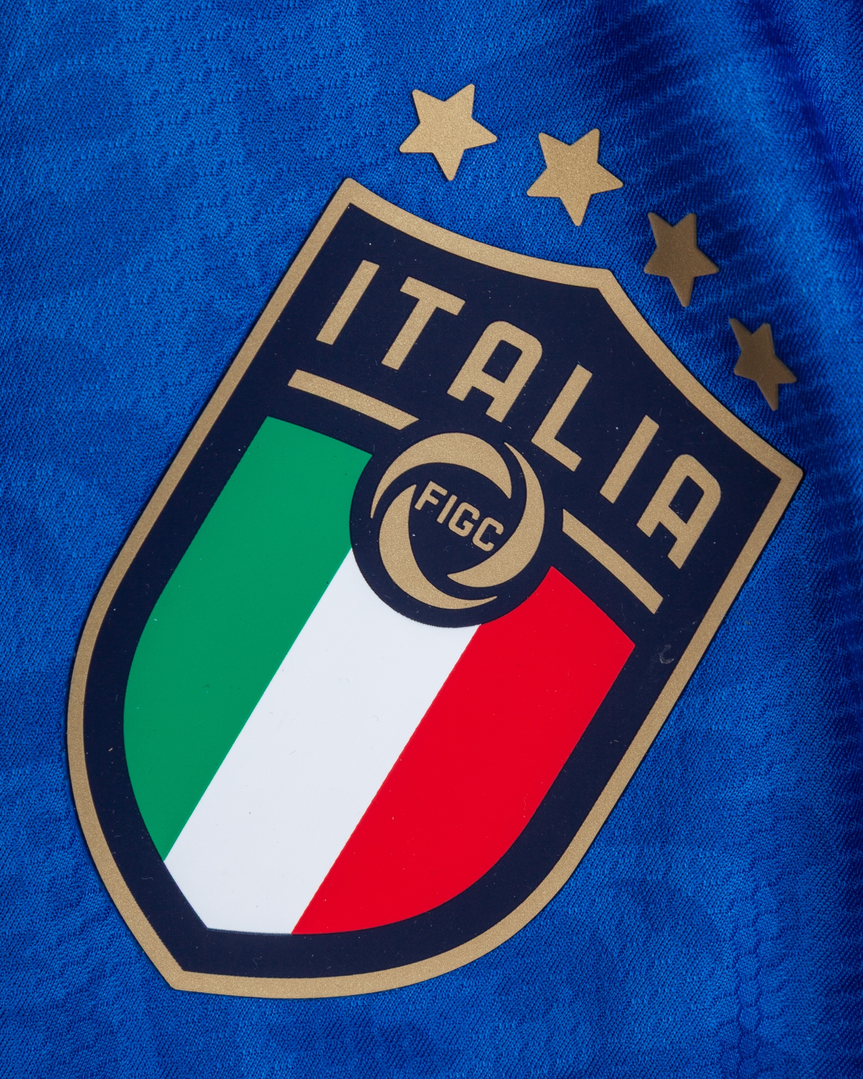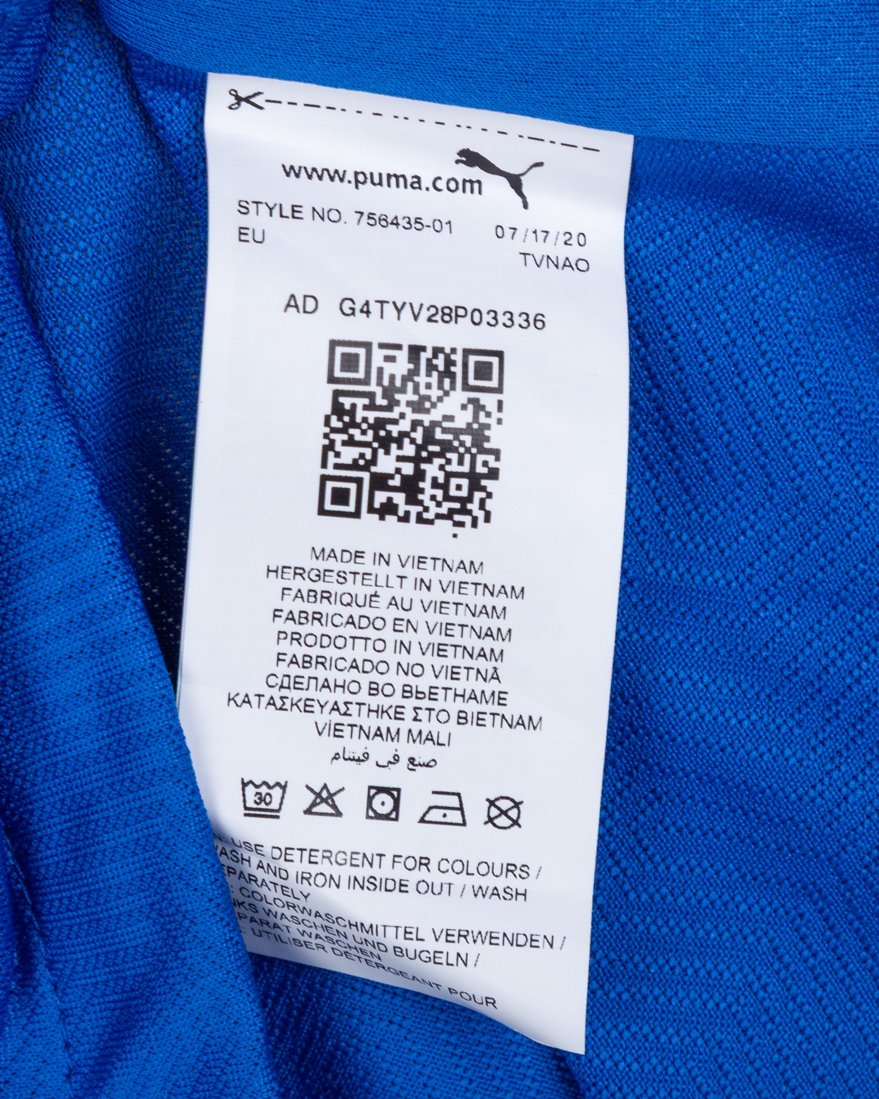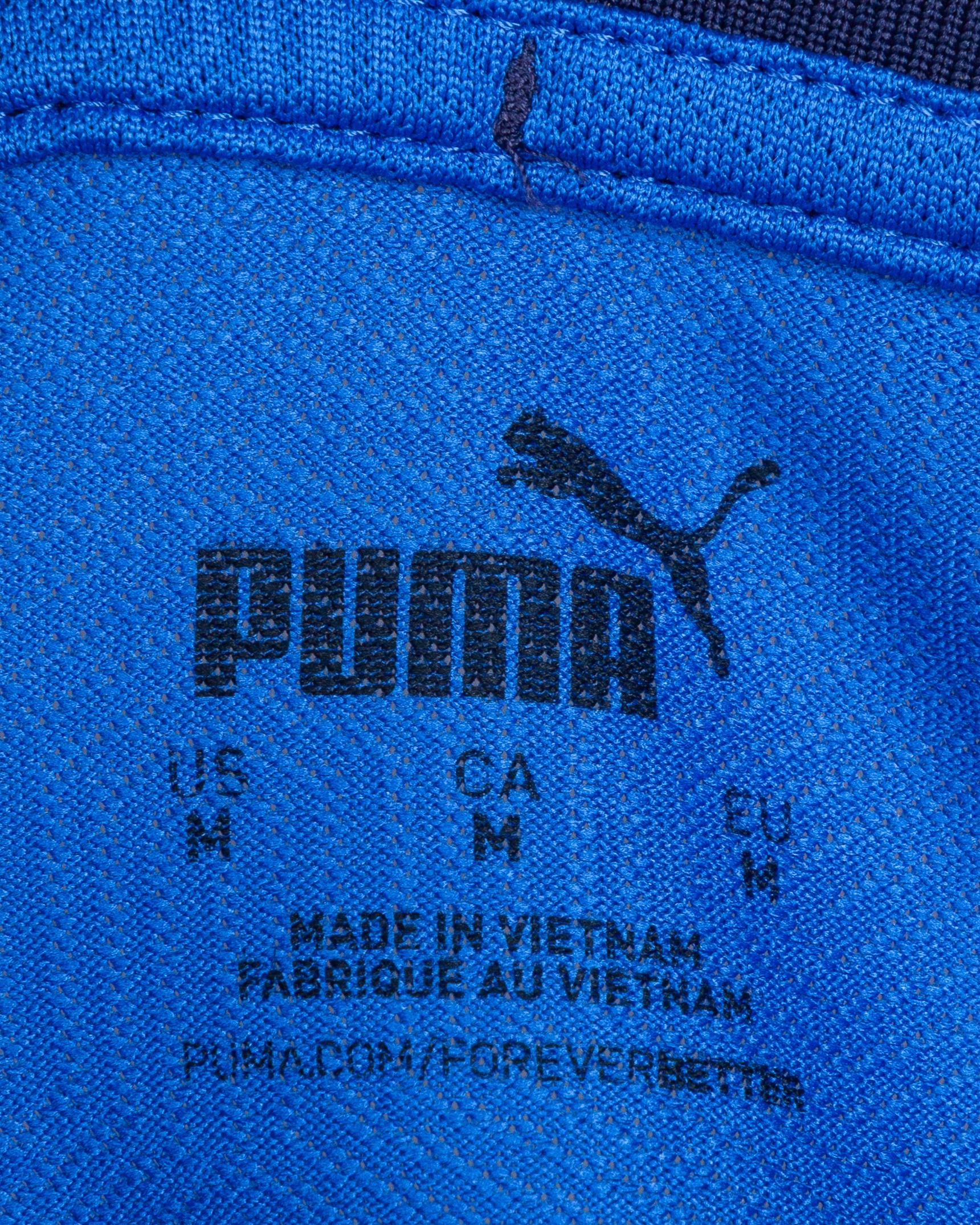 Marco Veratti blue No.6 Italy v. North Macedonia match issued short-sleeved shirt, 2022, Puma, M, with v-neck collar and printed badge, 24.03.2022 PALERMNO, ITA and flags of nations decal, with UEFA EUROPEAN CHAMPIONS 2020 badge, the reverse lettered VERRATTI, the right sleeve with FIFA World Cup Qatar 2022 Qualifiers flash, the other with UEFA Foundations for Children flash