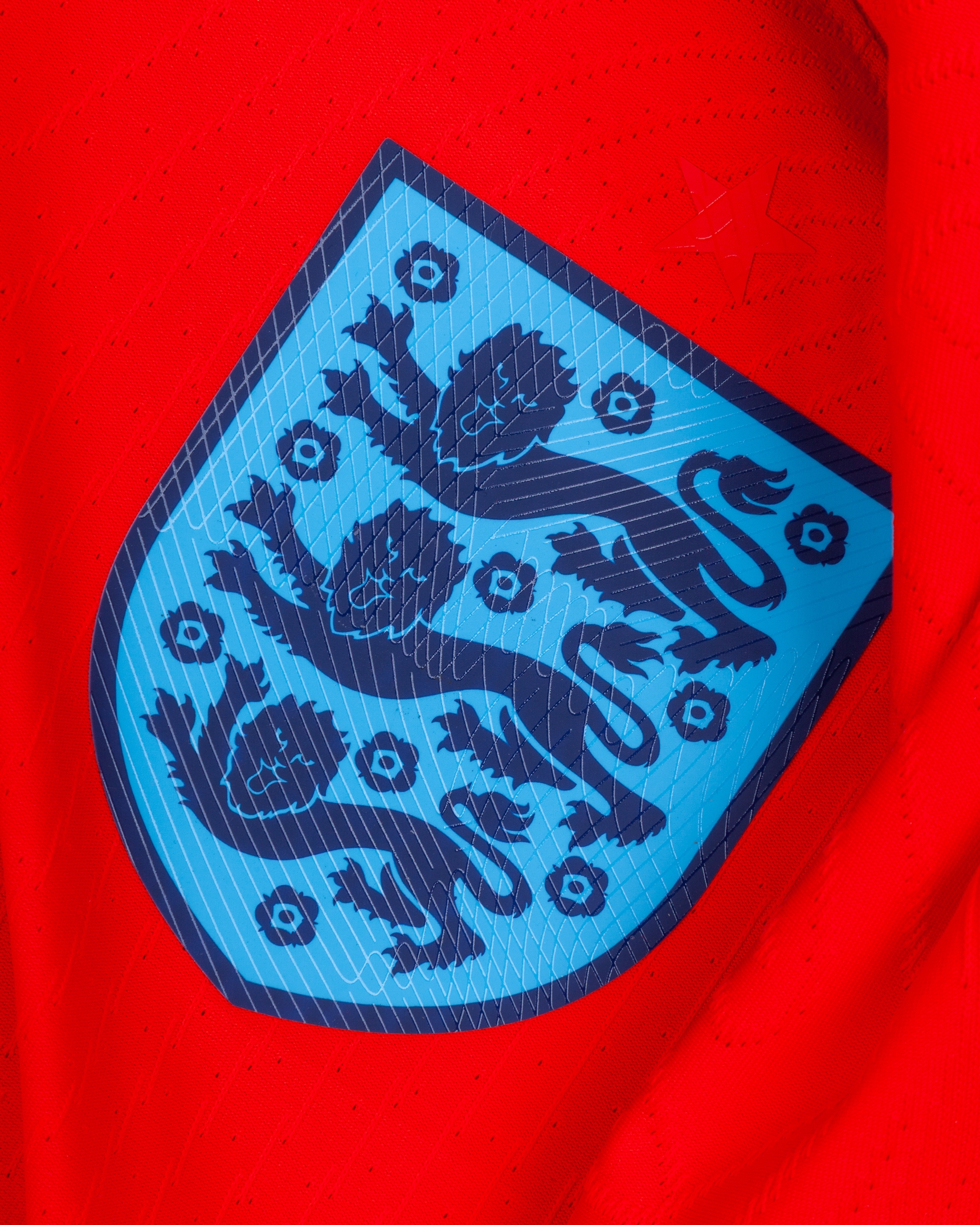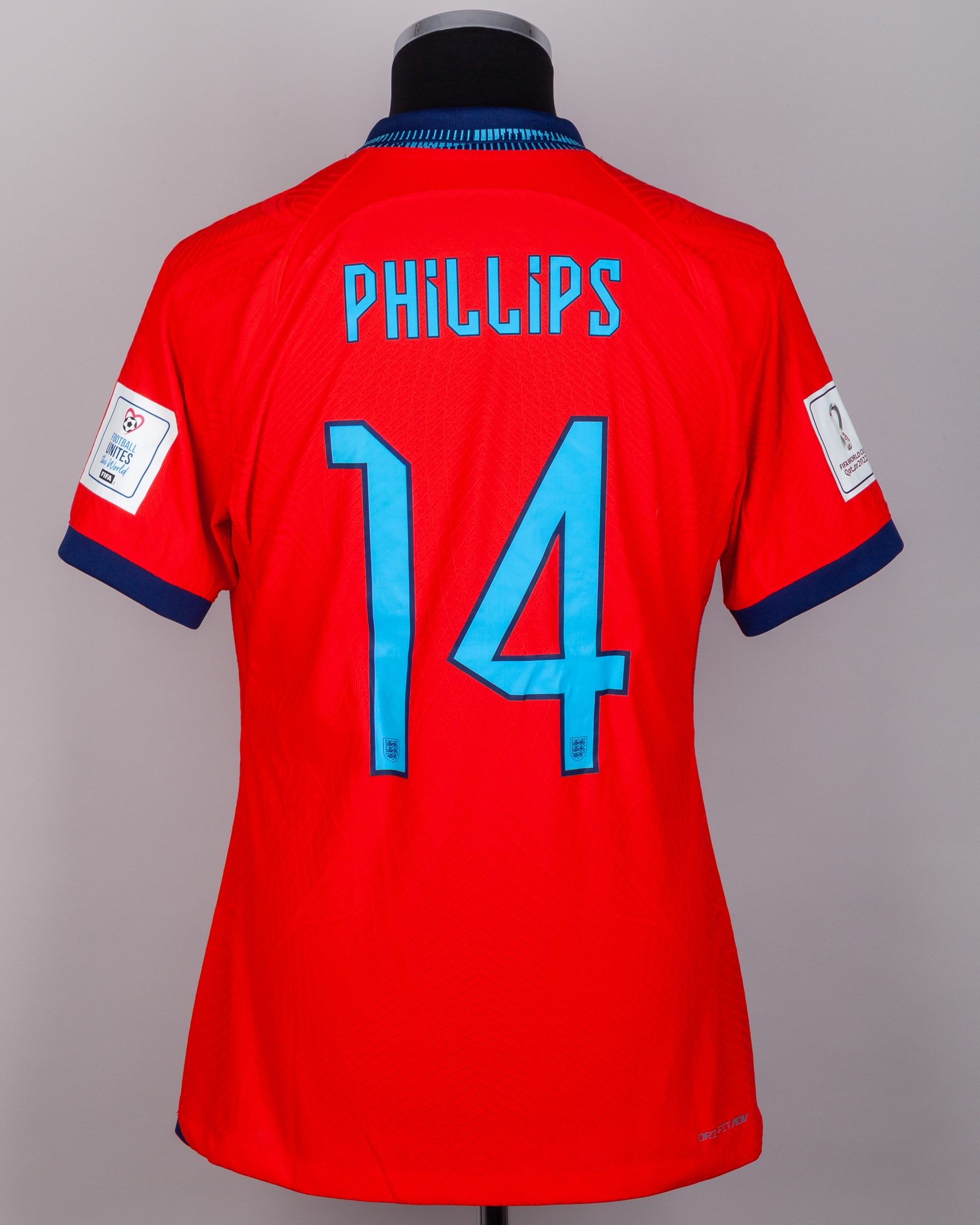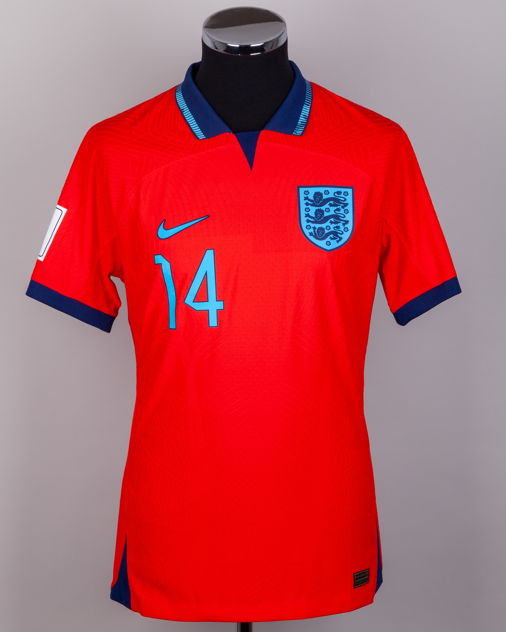 Kalvin Phillips red and blue No.14 England match issued short-sleeved shirt, Nike, L, with v-neck collar and printed badge, the reverse lettered PHILLIPS, the right sleeve with FIFA World Cup Qatar 2022 flash, the other with Football United flash