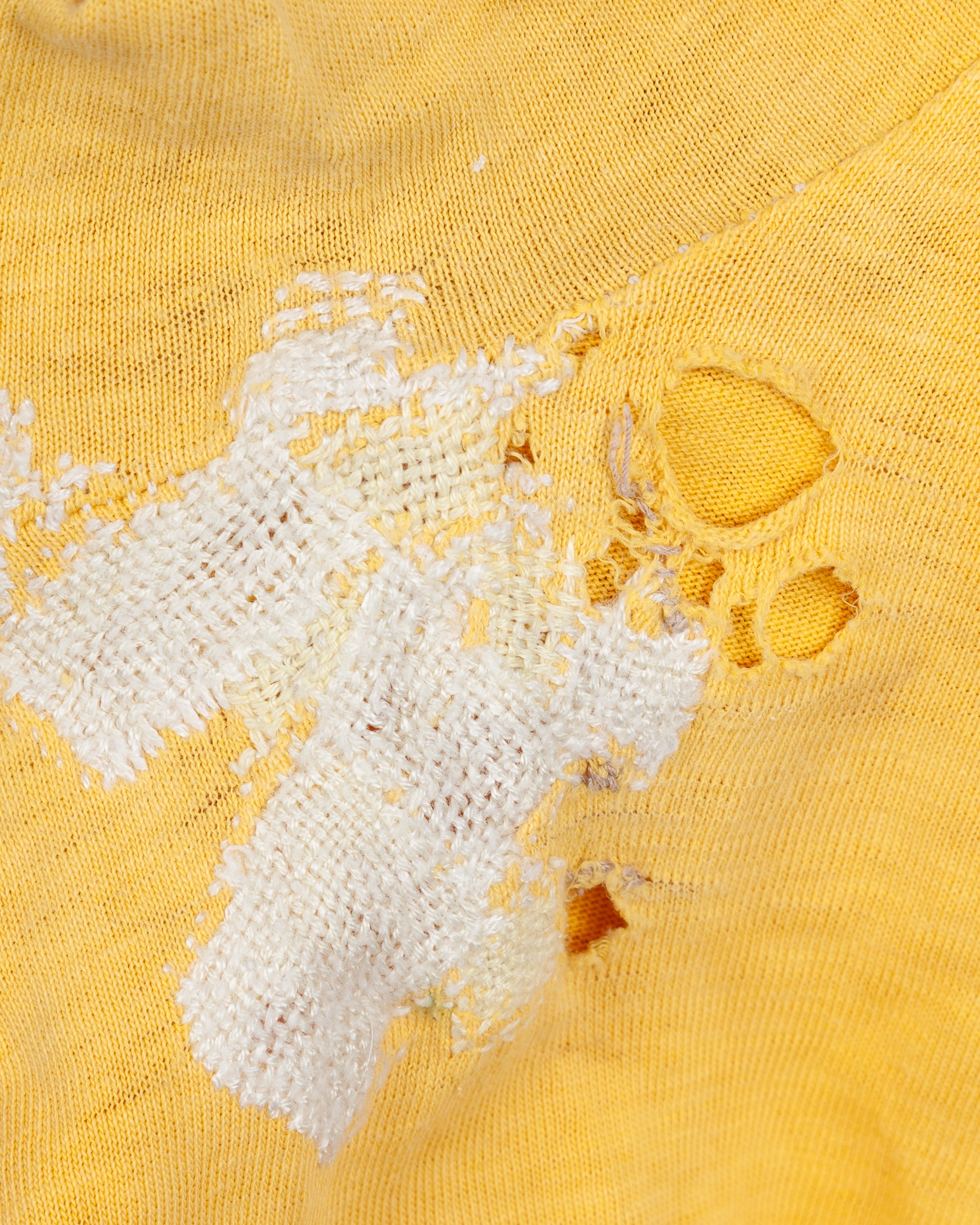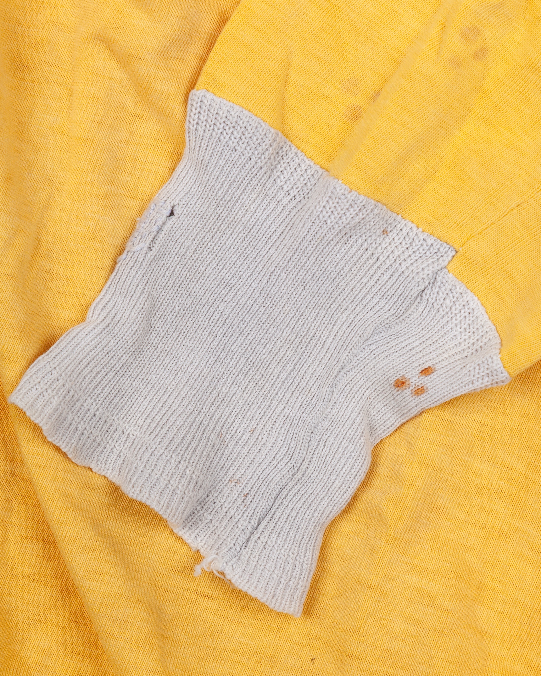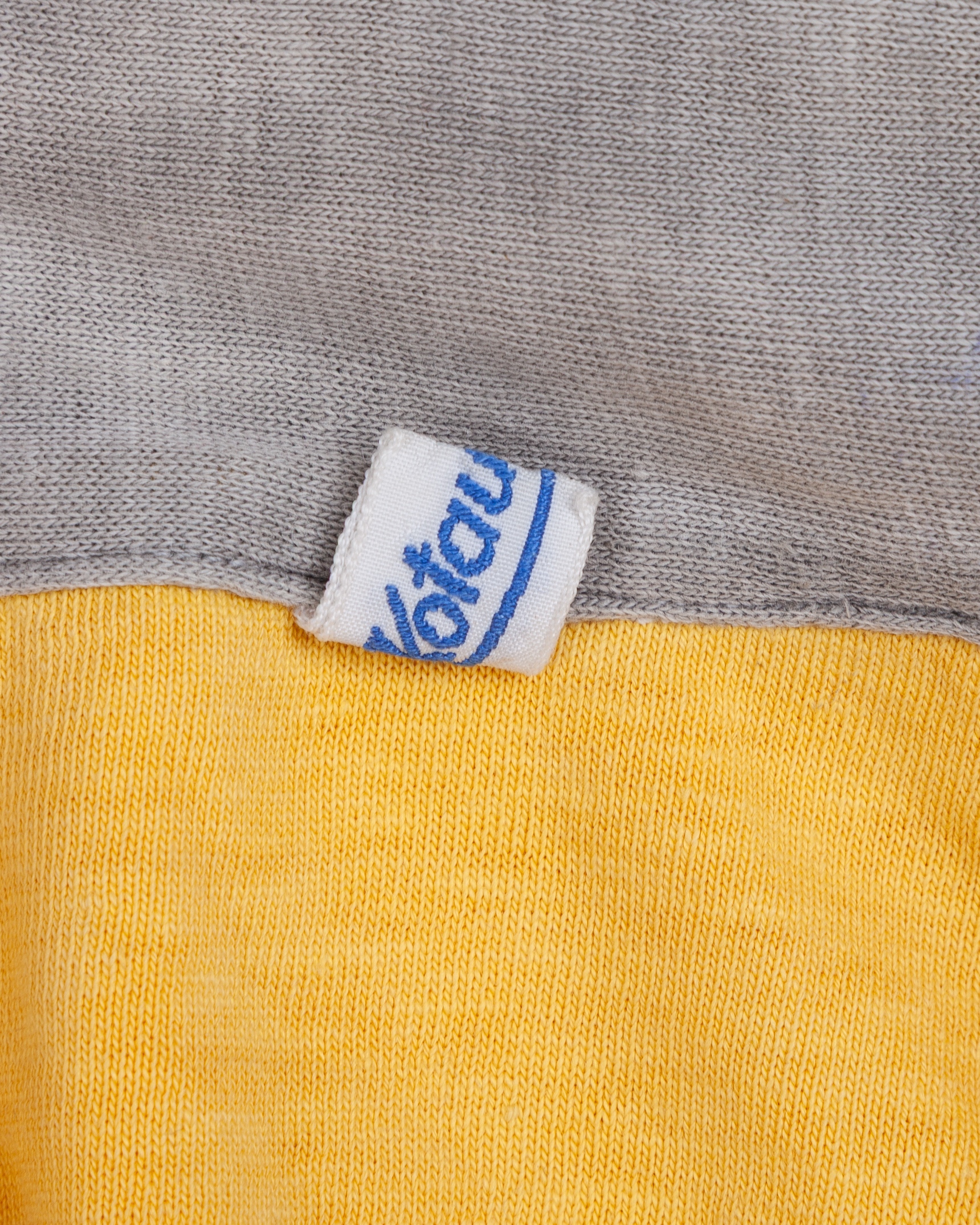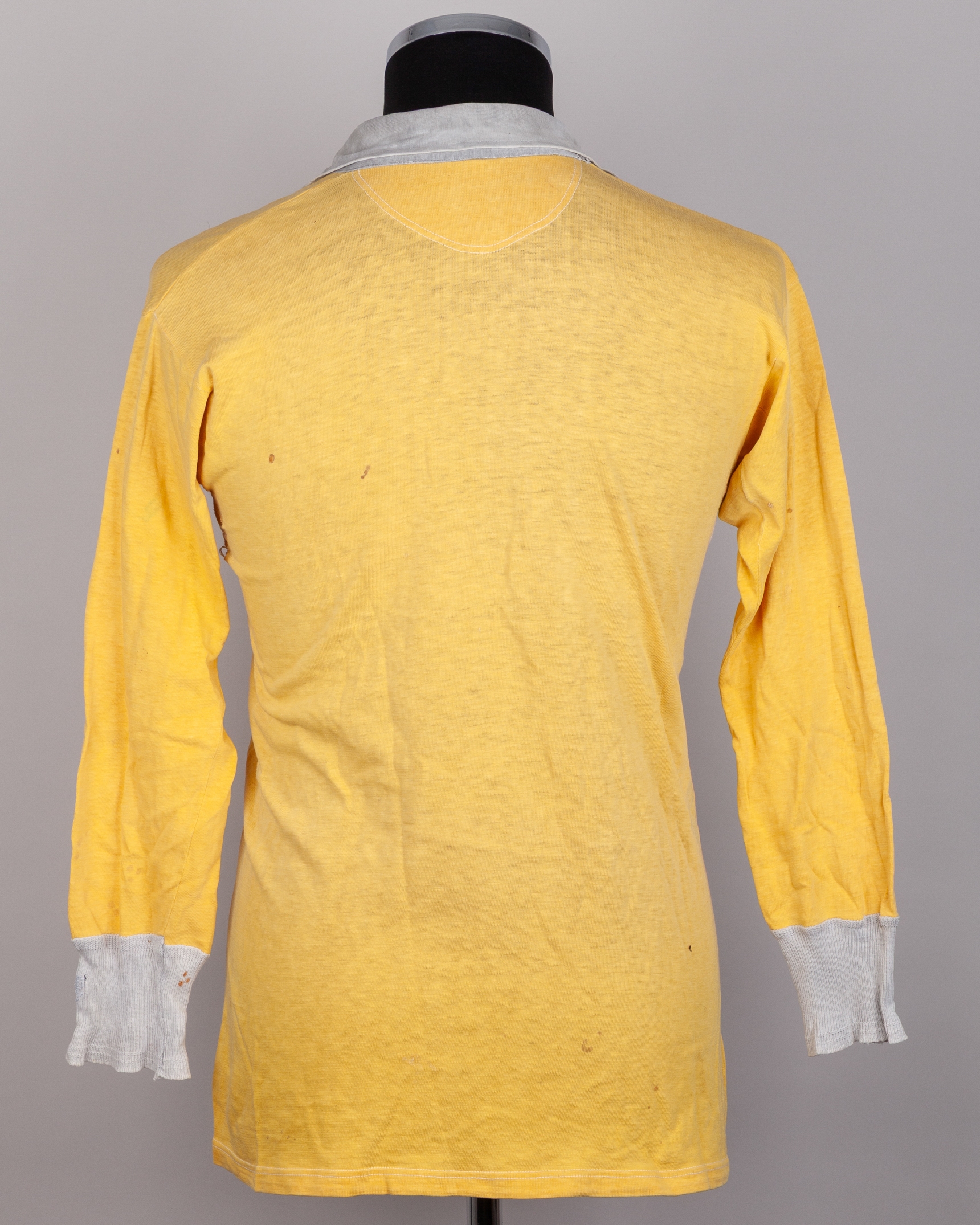 Yellow and grey Lokomotiv Leipzig long-sleeved shirt, 1950s, Kotaura, with lace-up collar, faded, stained and holed under each arm