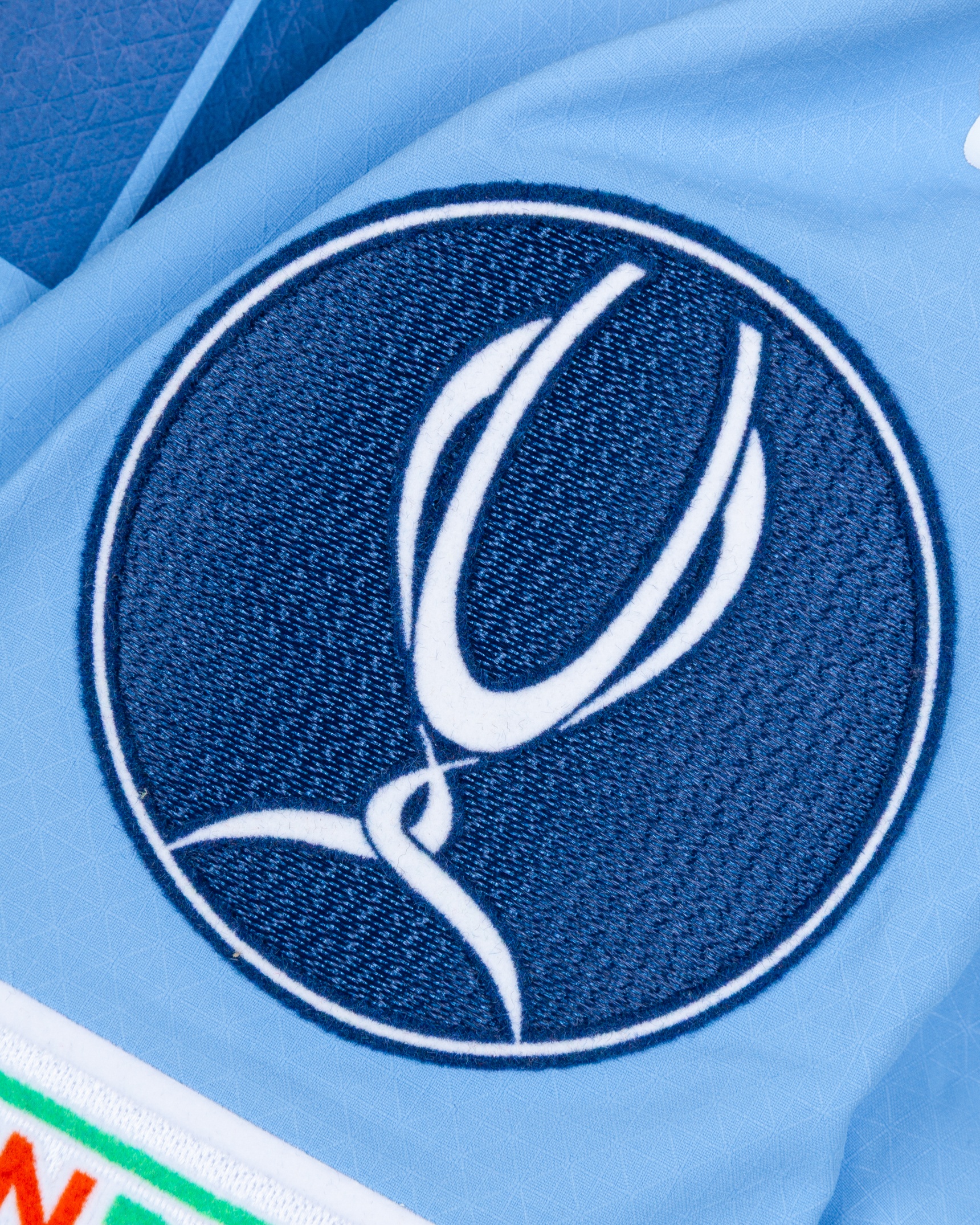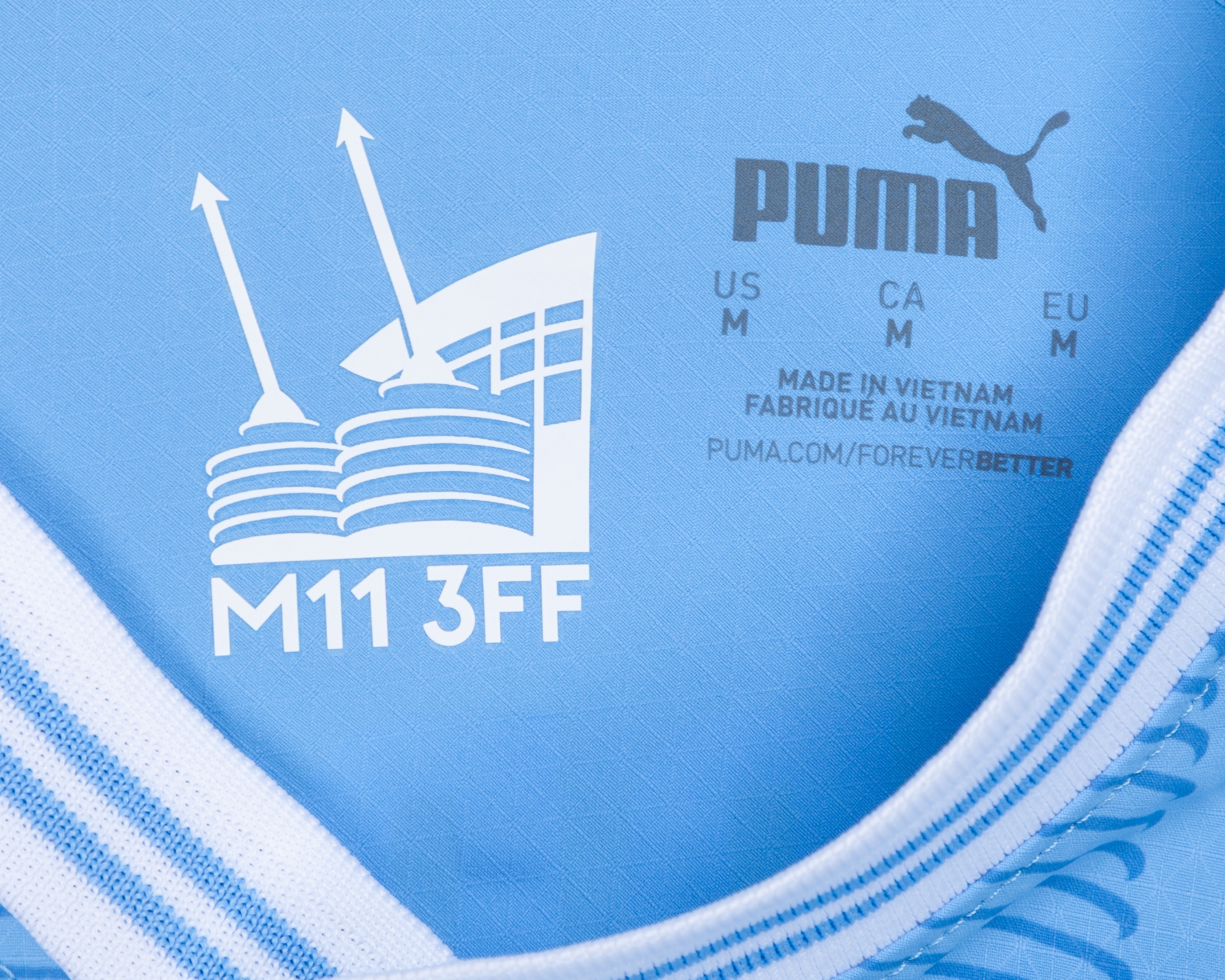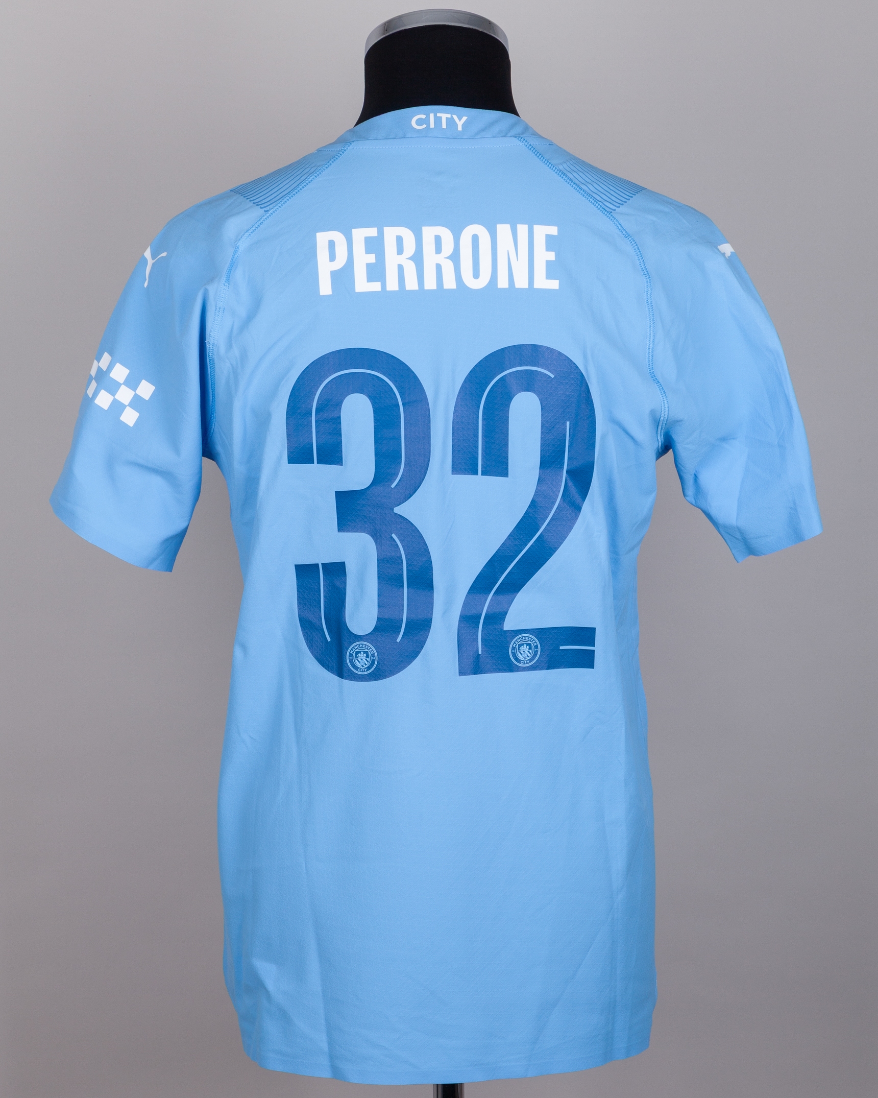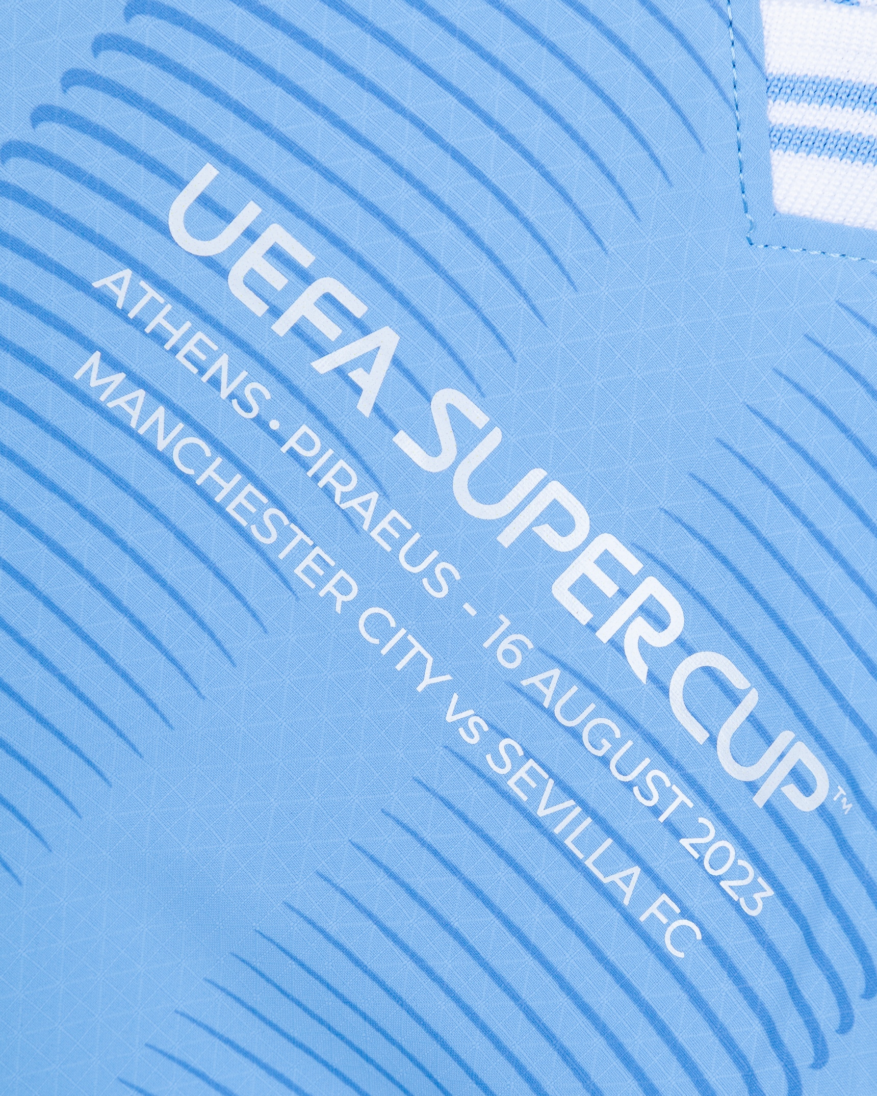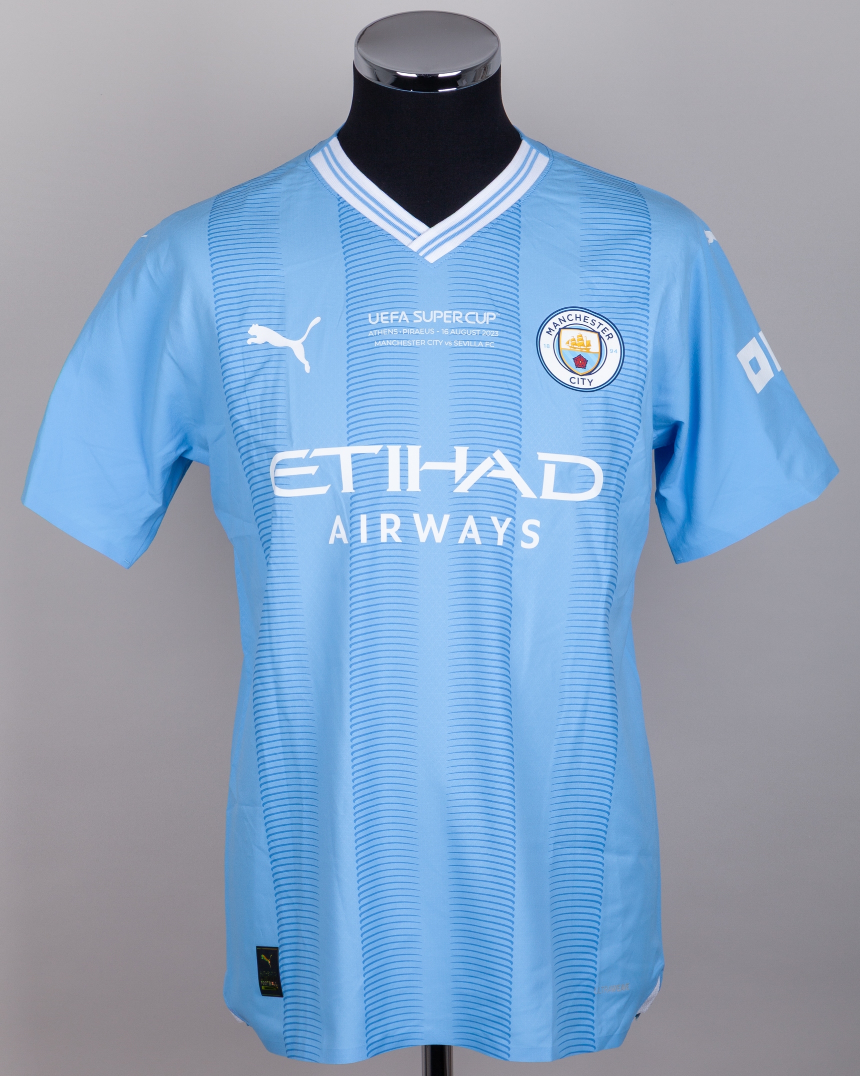 Maximo Perrone blue No.32 Manchester City v. Sevilla Super Cup short-sleeved shirt, 2023, Puma, M, with v-neck collar and printed badge, with UEFA SUPER CUP ATHENS . PIRAEUS - 16 AUGUST 2023 MANCHESTER CITY VS SEVILLA FC decal, the reverse lettered PERRONE, the right sleeve with Super Cup and UEFA foundation flashes, with COA