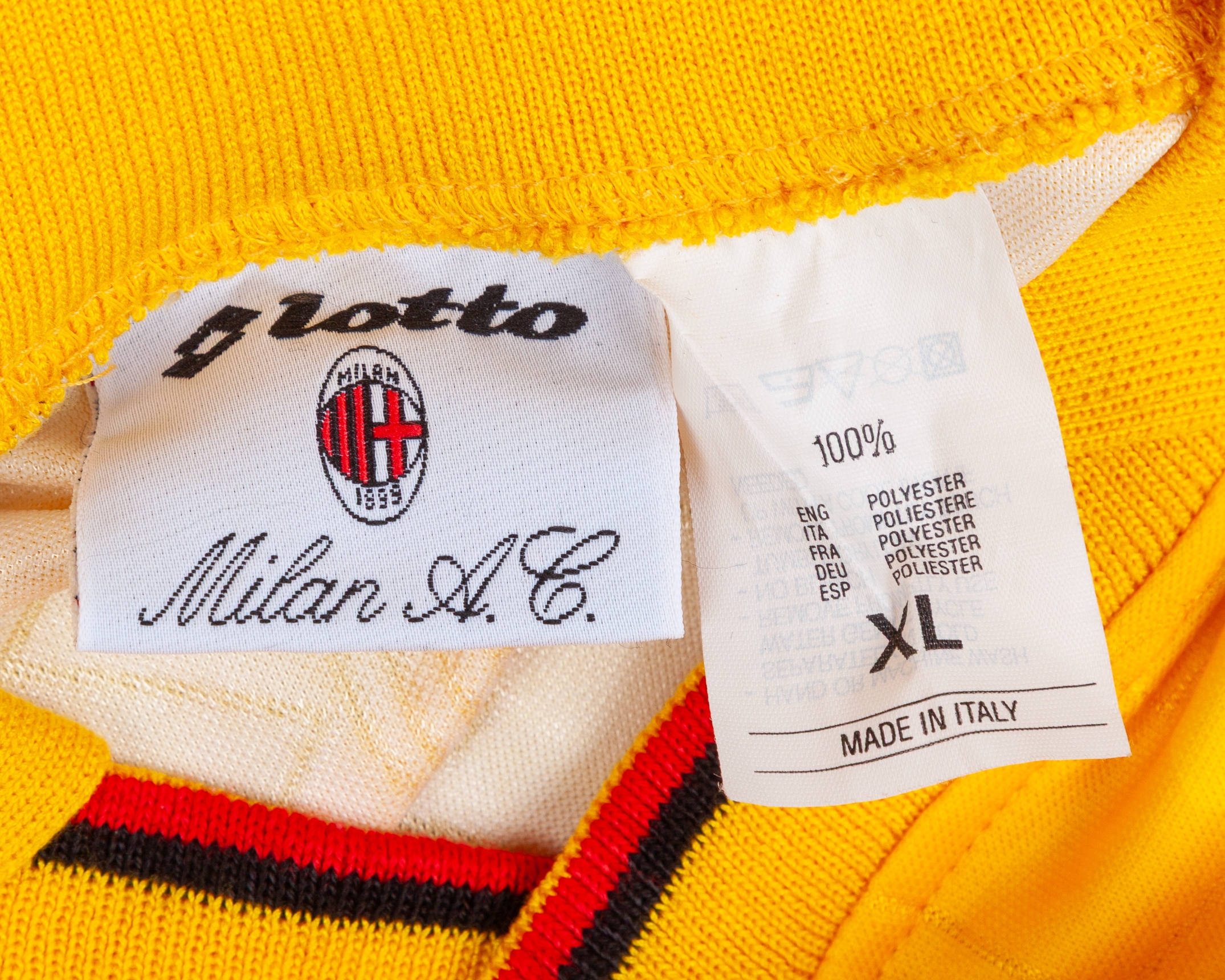 Alessandro Costacurta yellow No.5 AC Milan long-sleeved shirt, 1994-95, Lotto, XL, with v-neck collar and embroidered cloth badge
