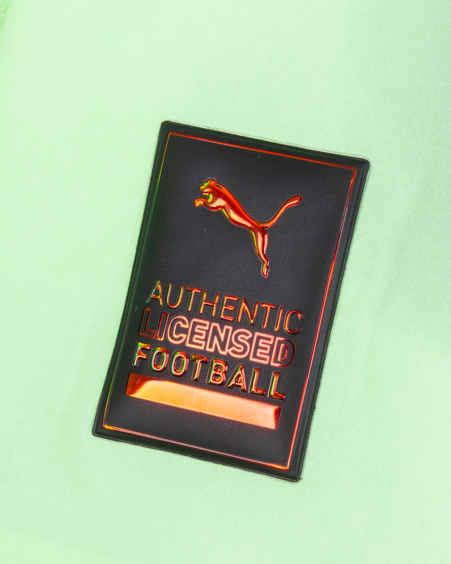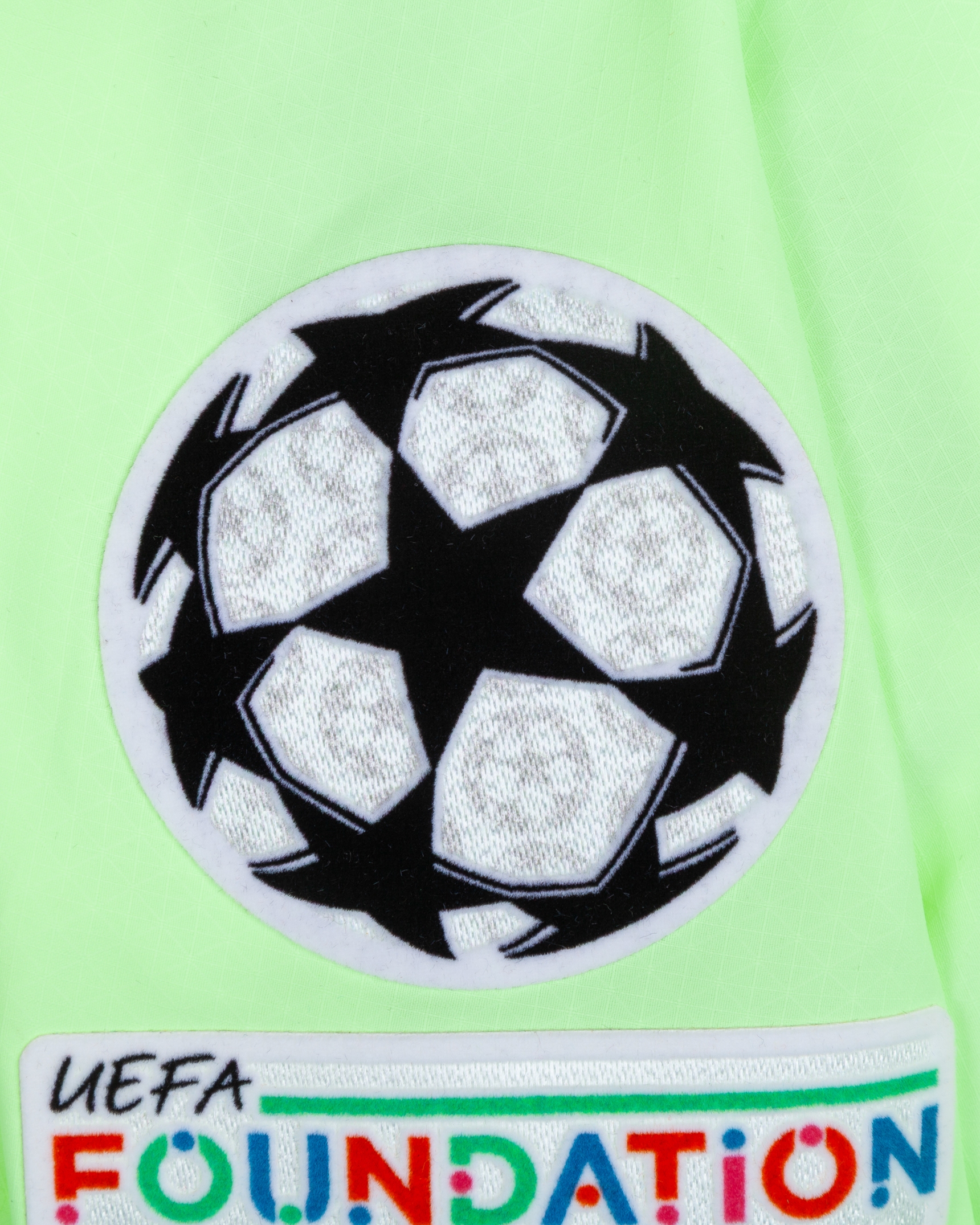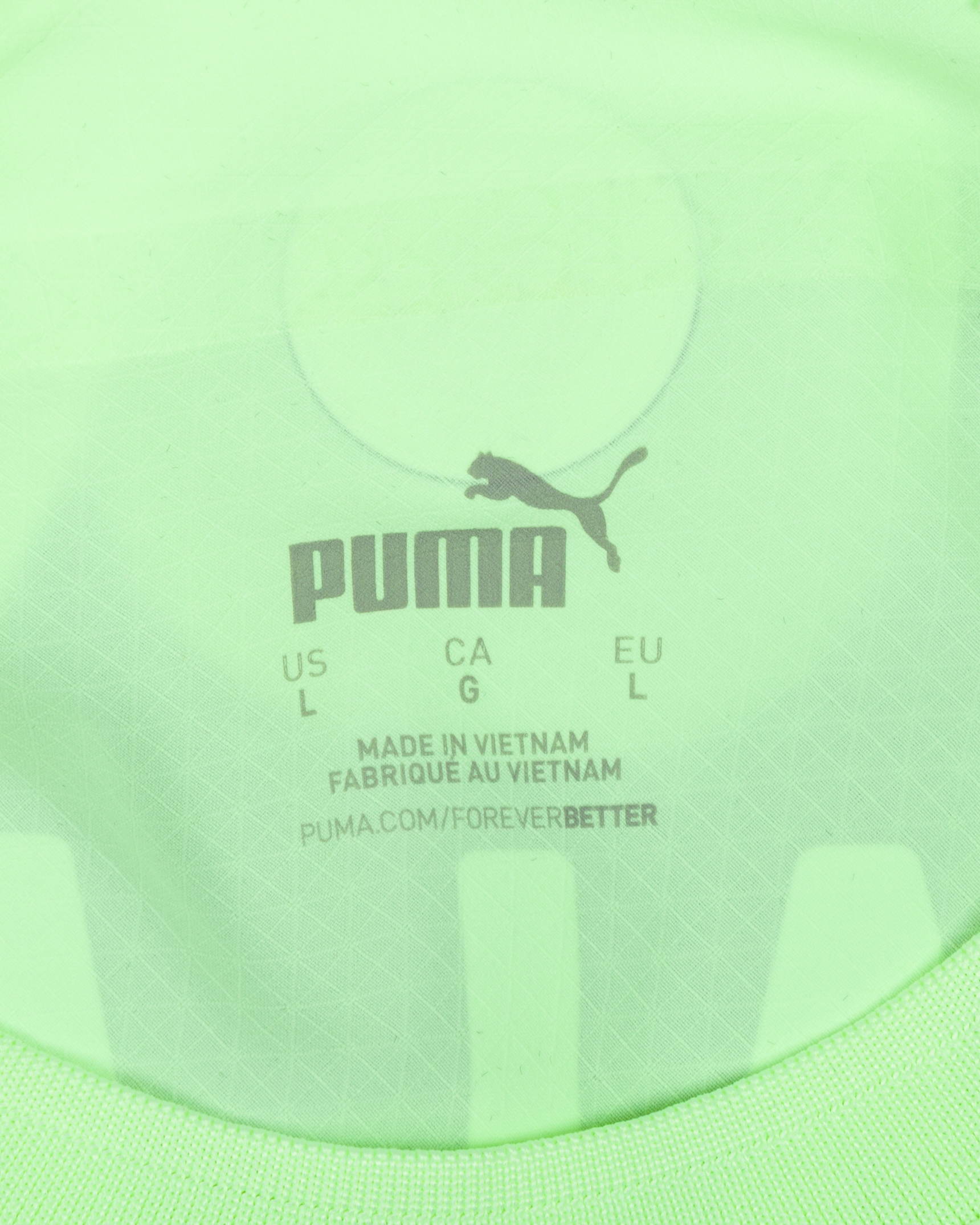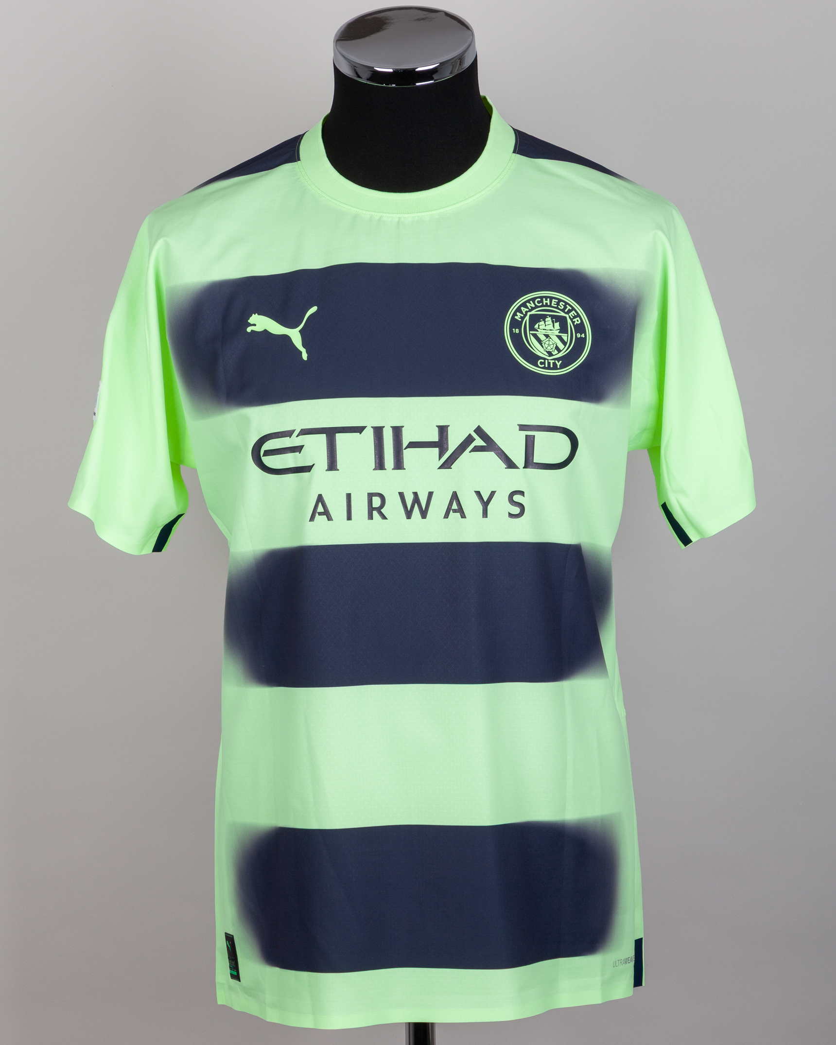 Erling Haaland yellow and black No.9 Manchester City v. Bayern Munich short-sleeved shirt, 2023, Puma, L, with crew-neck collar and printed badge, the reverse lettered HAALAND, the right sleeve with Champions League and UEFA foundation flashes