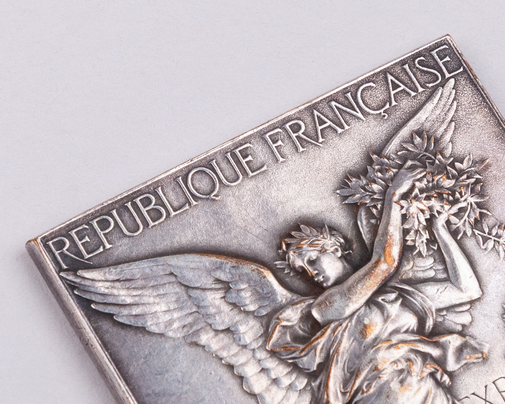 Paris 1900 Olympic Games presentation plaque, designed by F. Vernon with a victorious athlete standing on podium, inscribed EXERCISES PHYSIQUES ET SPORTS, the reverse with Victory casting laurel from the sky over Paris, inscribed REPUBLIQUE FRANCAISE, PARIS 1900, EXPOSITION UNIVERSELLE.