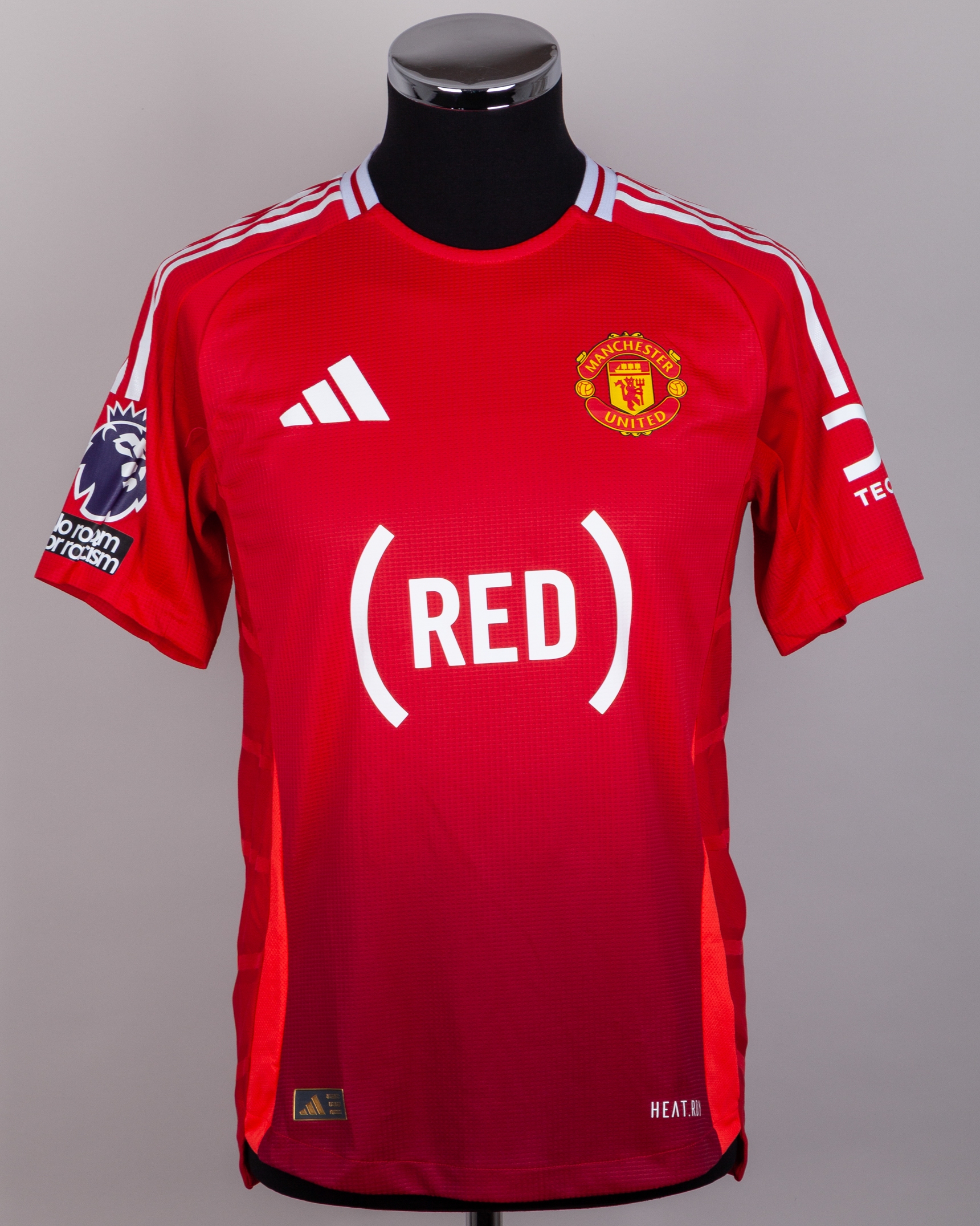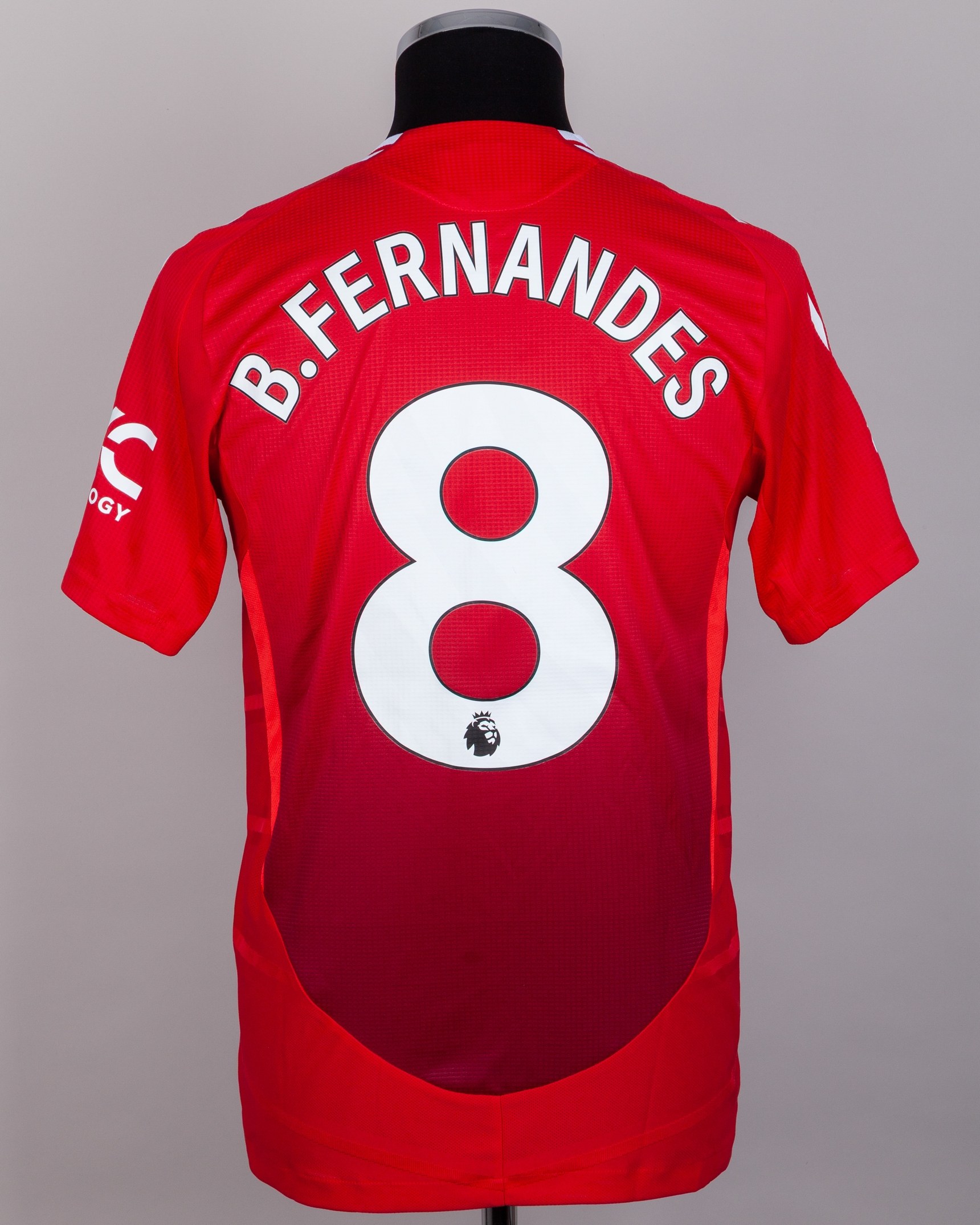 Bruno Fernandes red No.8 Manchester United v. West Ham United short-sleeved shirt, 2025, Adidas, M, with crew-neck collar and printed badge, the reverse lettered B. FERNANDES, the right sleeve with Premier League flash, the front with special RED charity sponsor
