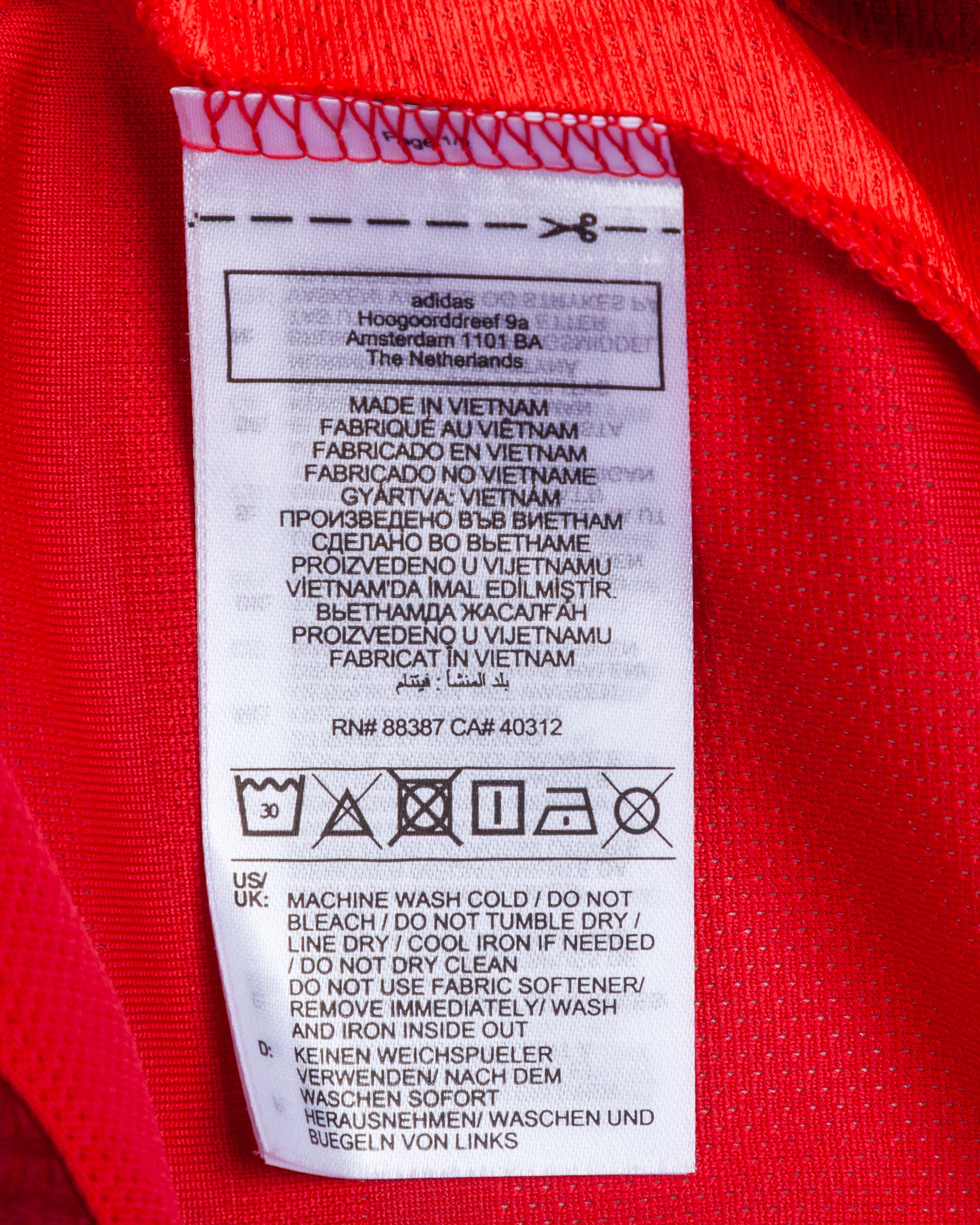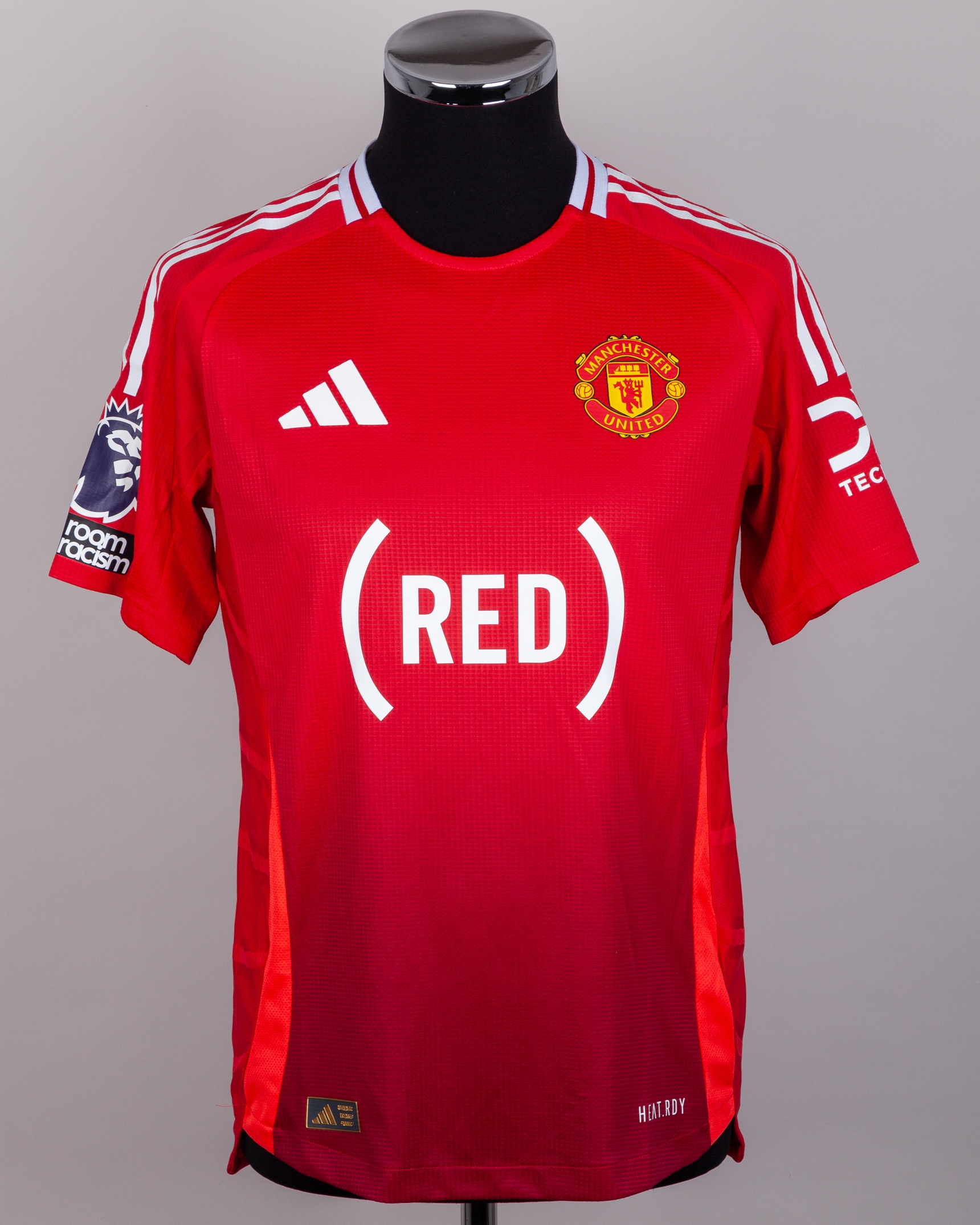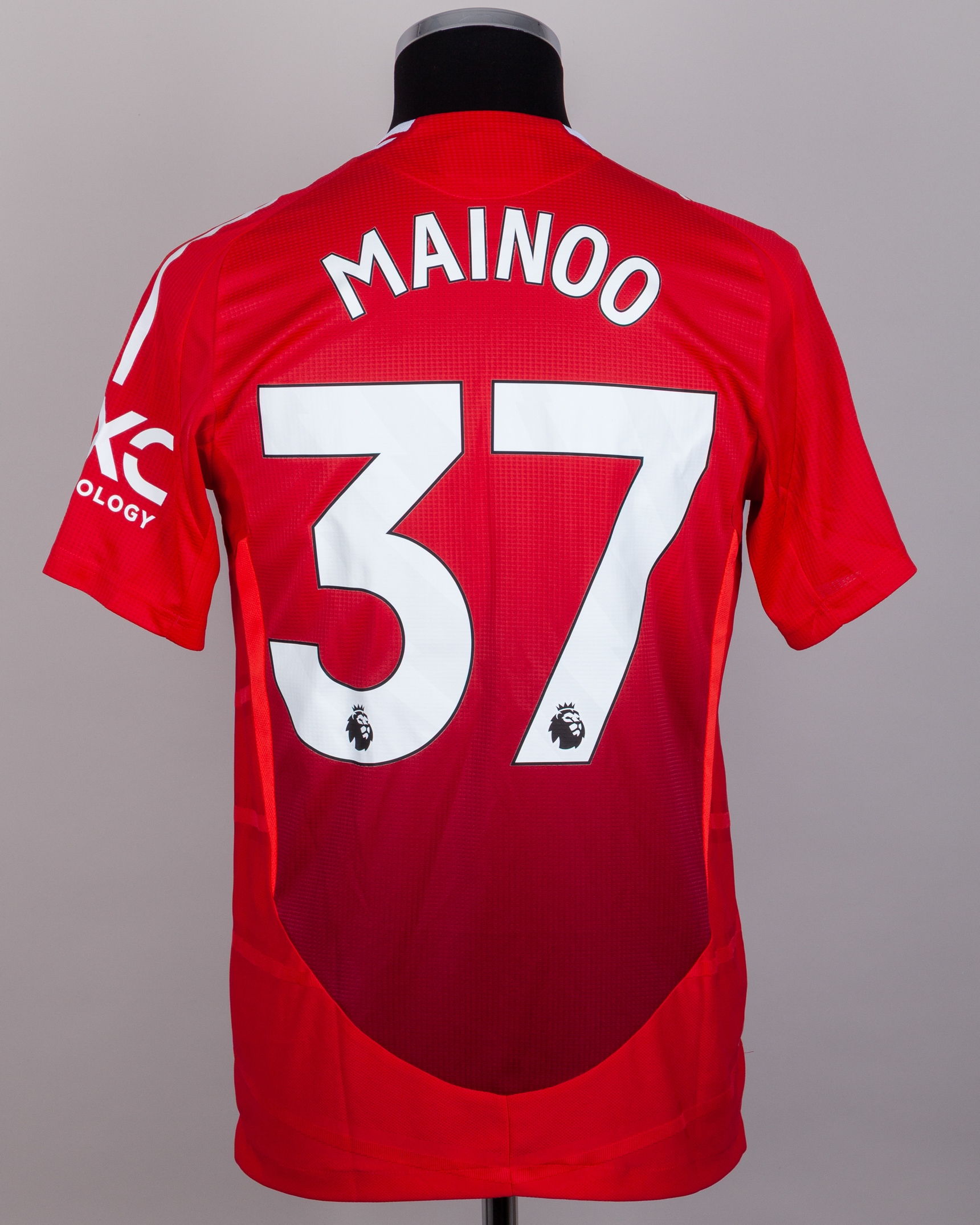 Kobbie Mainoo red No.37 Manchester United v. West Ham United short-sleeved shirt, 2025, Adidas, M, with crew-neck collar and printed badge, the reverse lettered MAINOO, the right sleeve with Premier League flash, the front with special RED charity sponsor