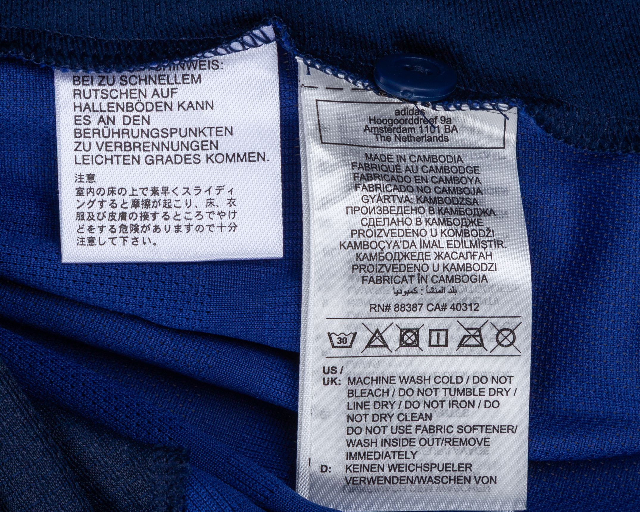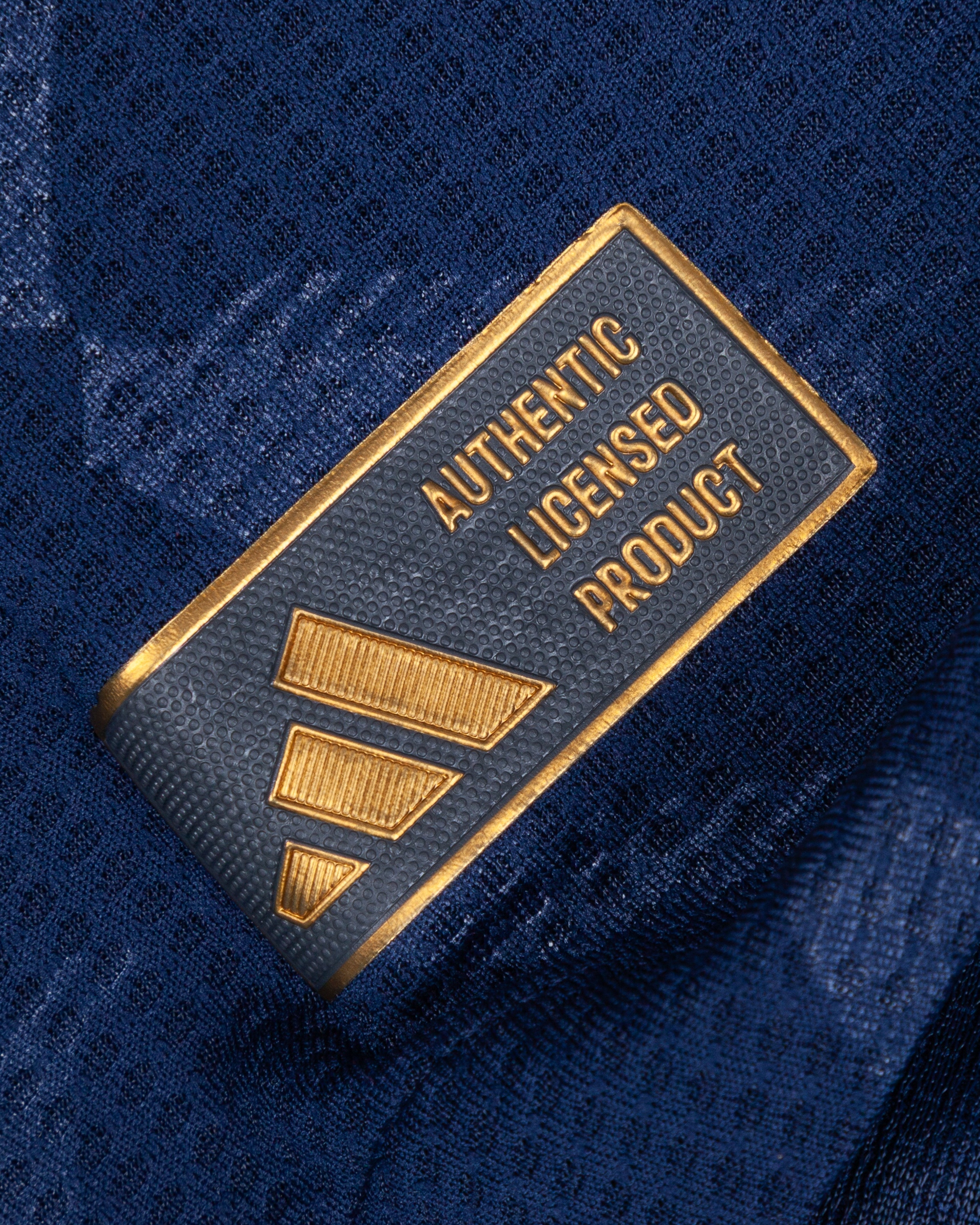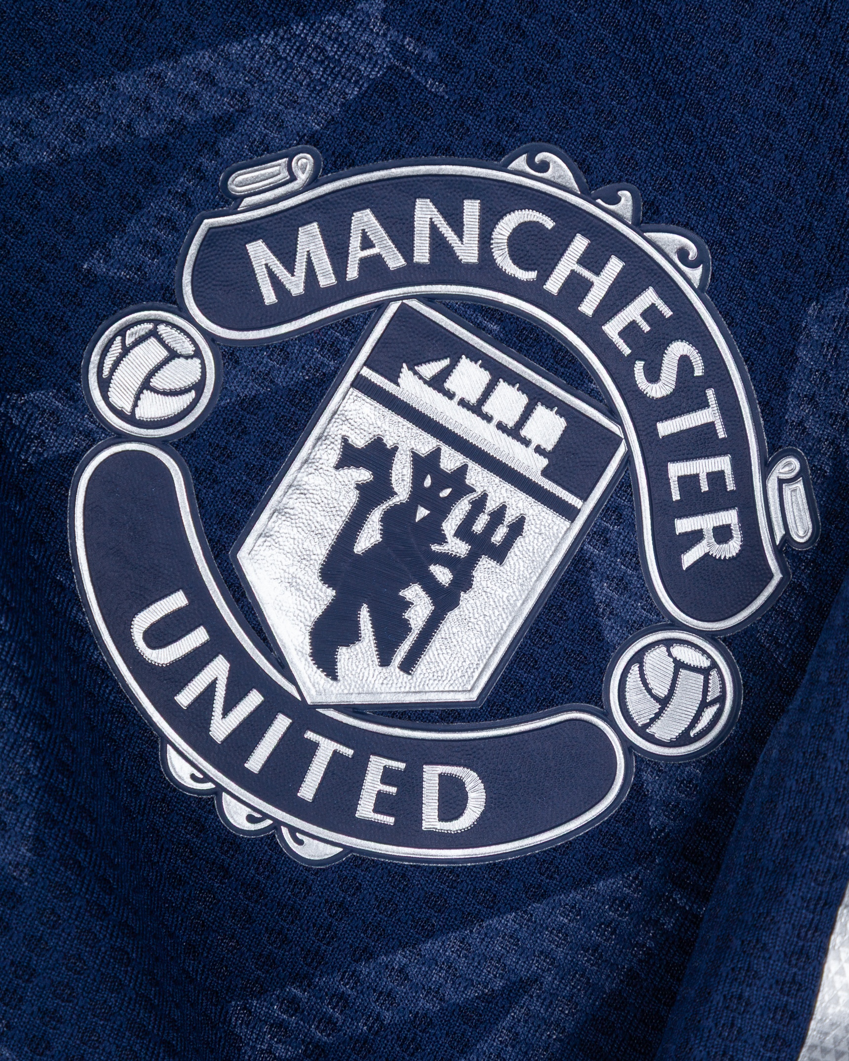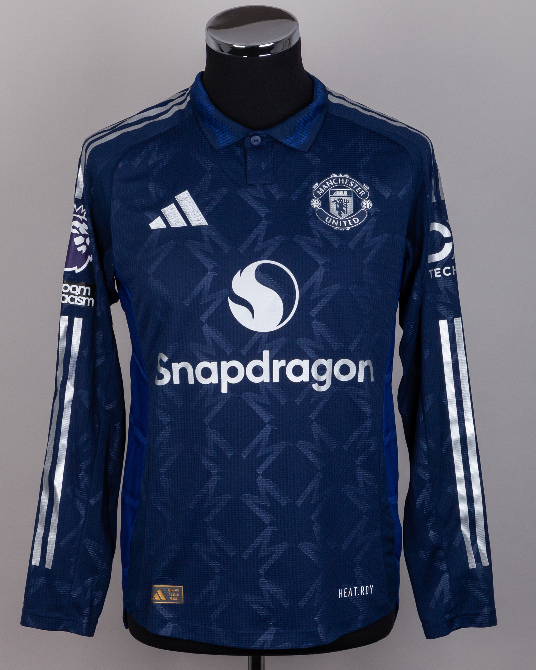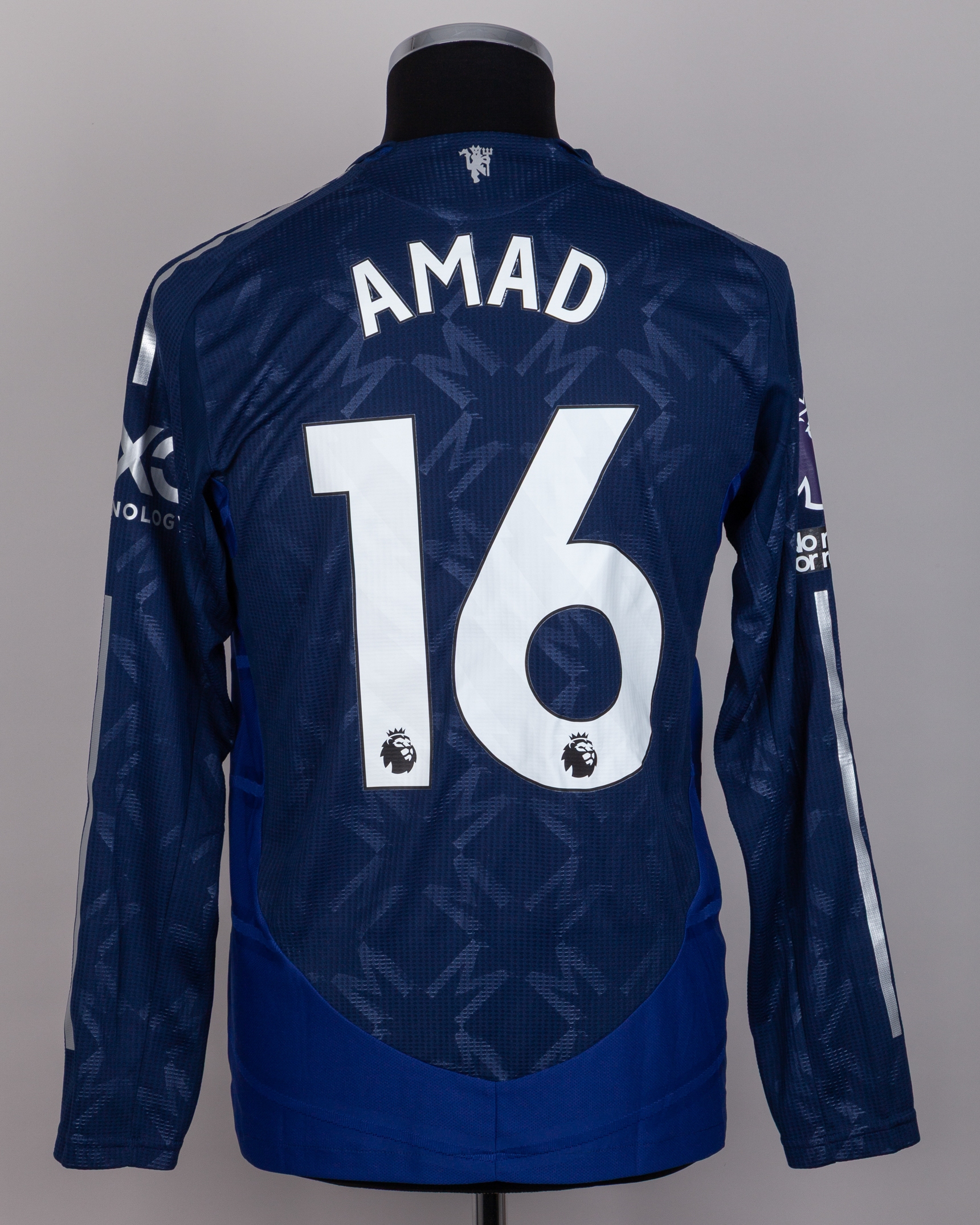 Amad Diallo blue No.16 Manchester United long-sleeved shirt, 2024-25, Adidas, M, with button-up collar and printed badge, the reverse lettered AMAD, the right sleeve with Premier League flash