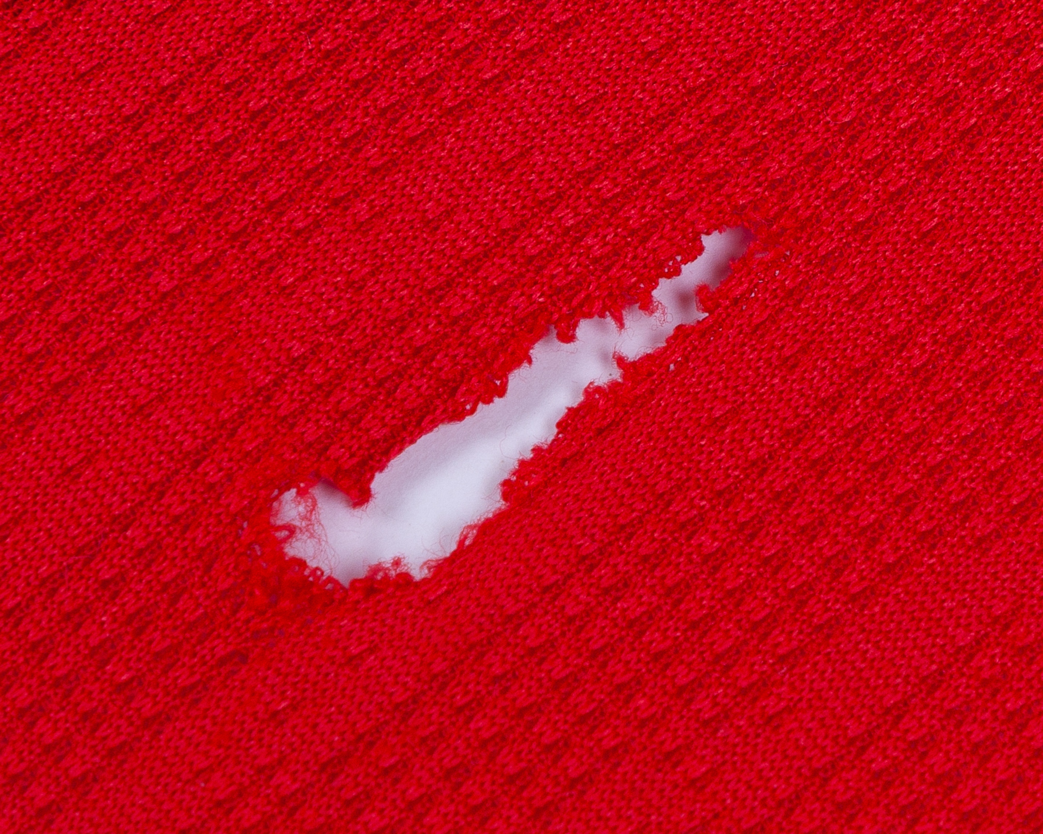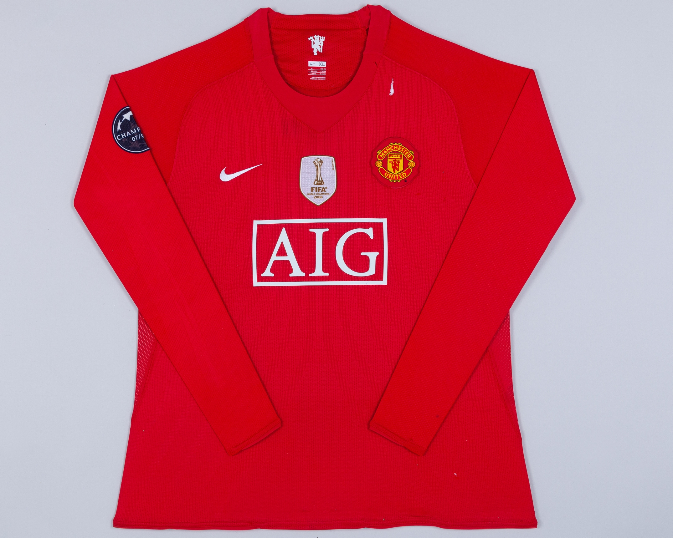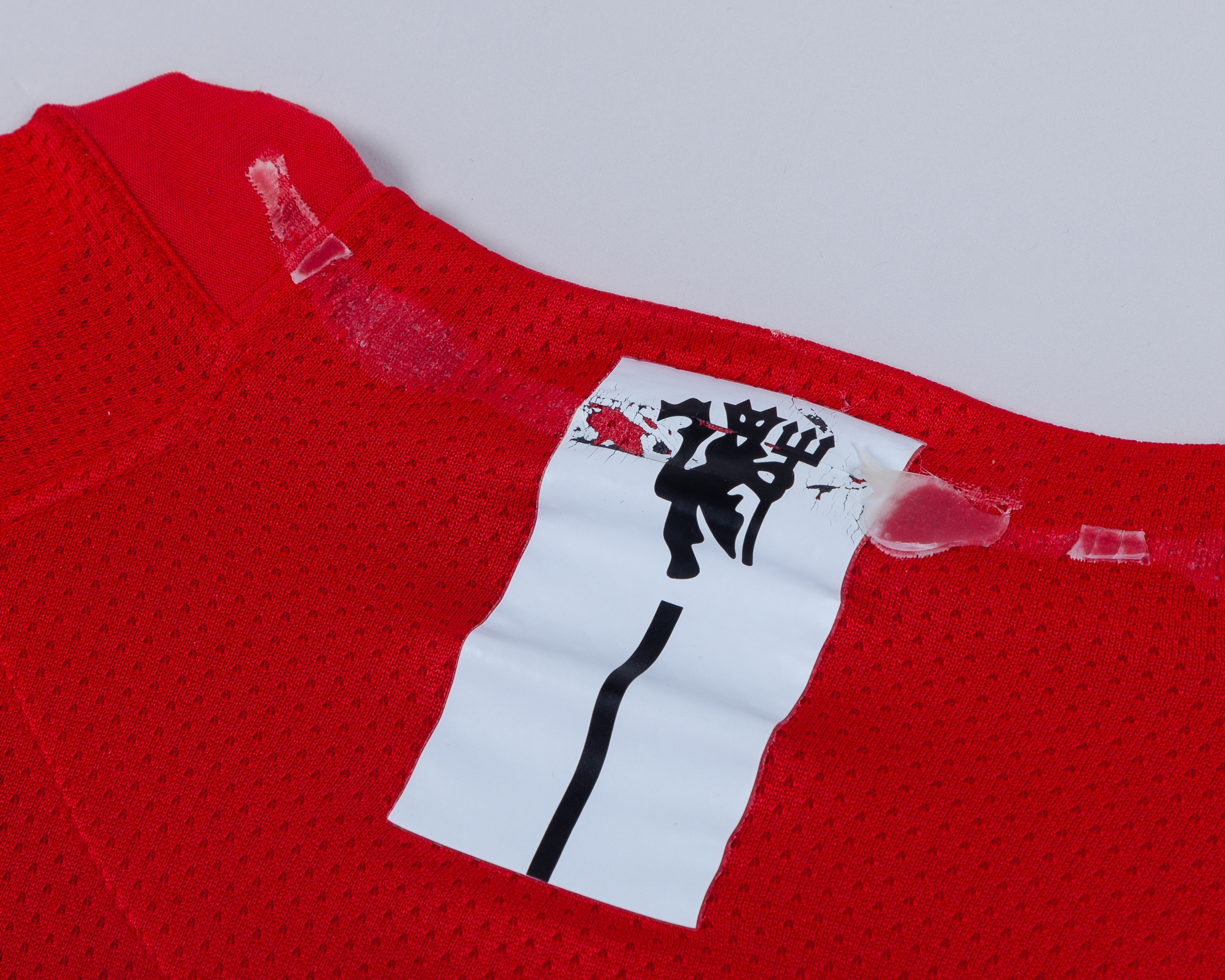 Shirt previous framed and damaged in transit, hole to front and various pulls, remains of adhesive from framing