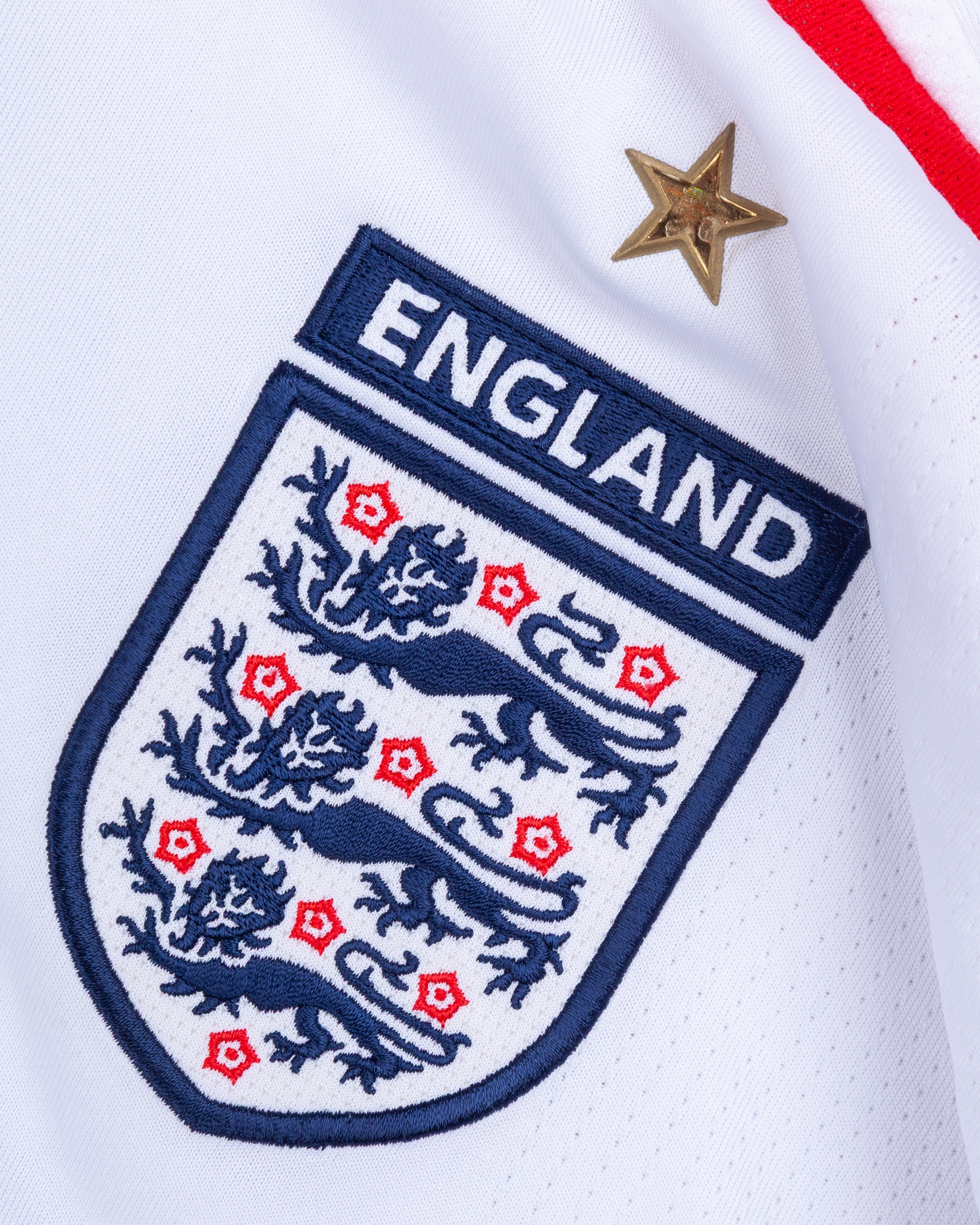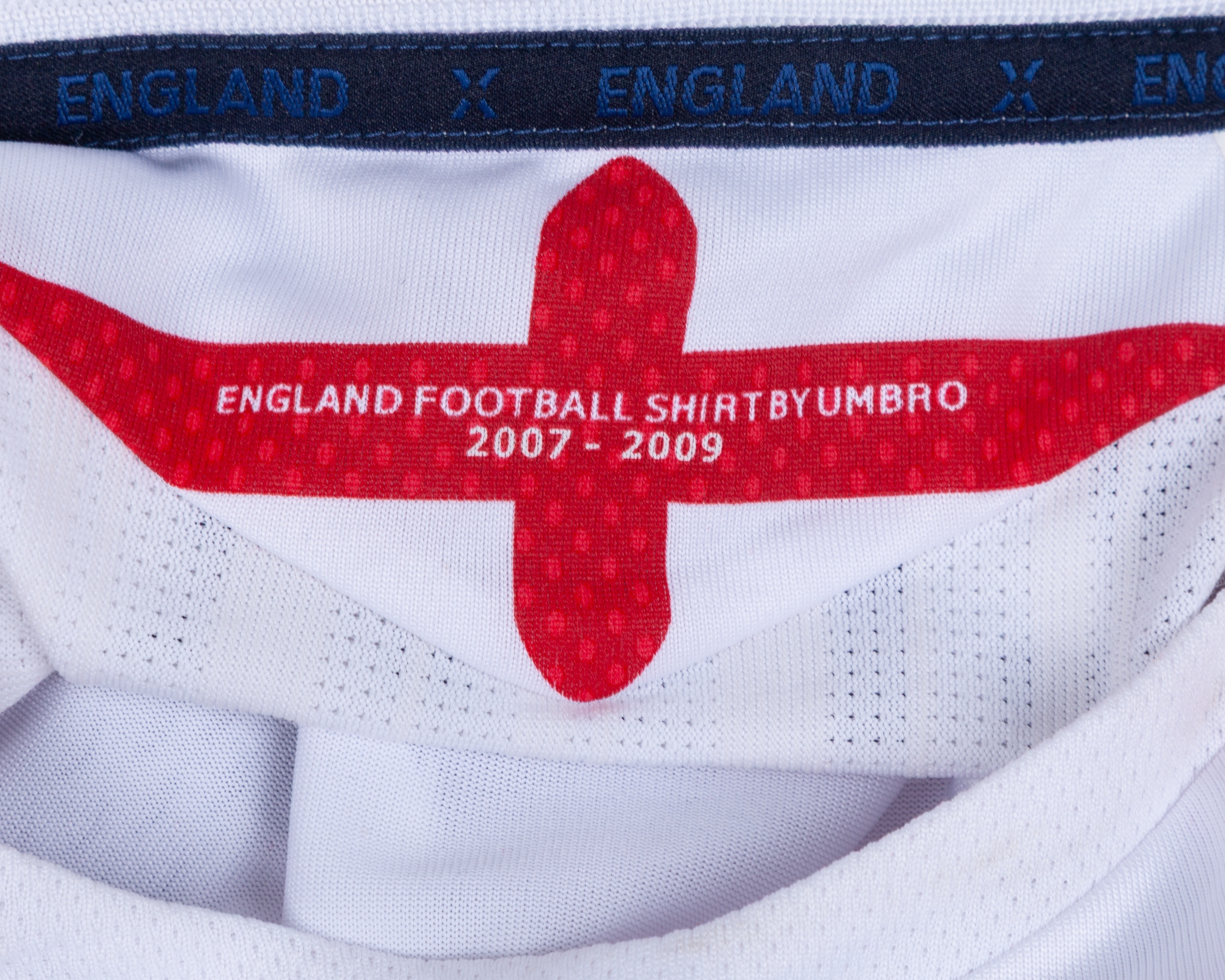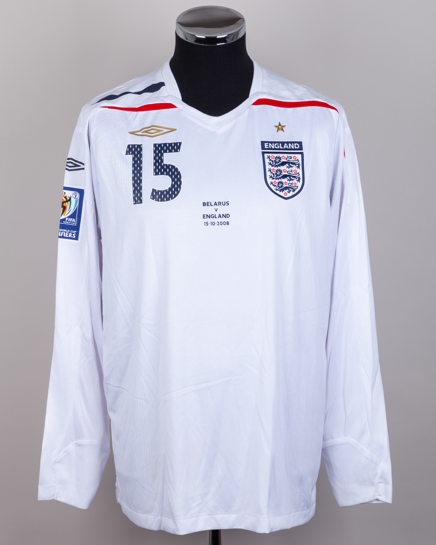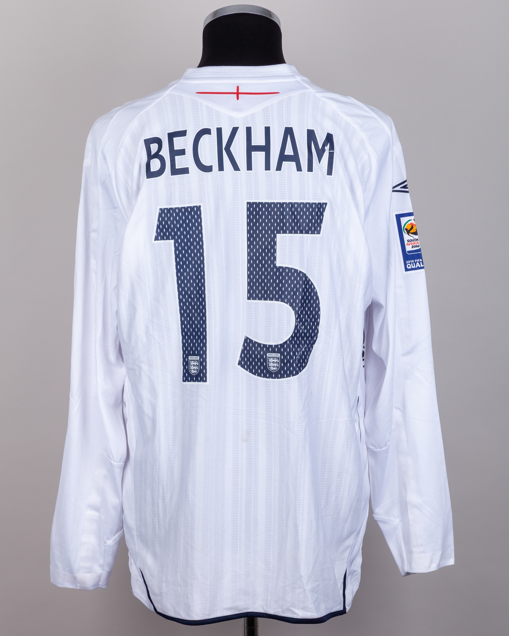 David Beckham white, red and blue No.15 England v. Belarus long-sleeved shirt, 2008, Umbro, XL, with v-neck collar and embroidered three lion badge inscribed ENGLAND with BELARUS v ENGLAND 15.10.2008, decal, the reverse lettered BECKHAM, the right sleeve with SOUTH AFRICA 2010 FIFA World Cup qualifiers flash