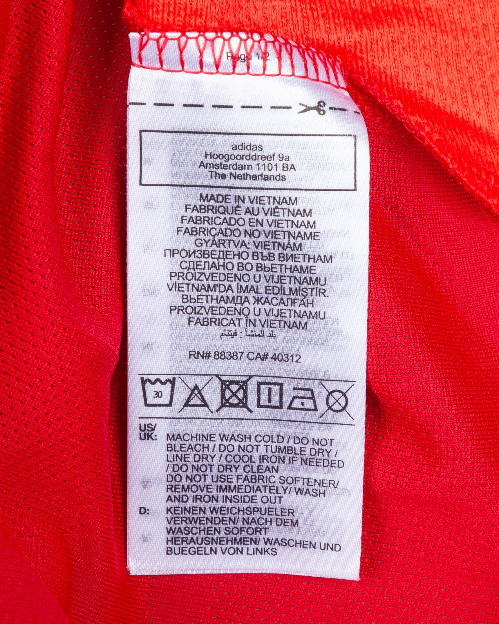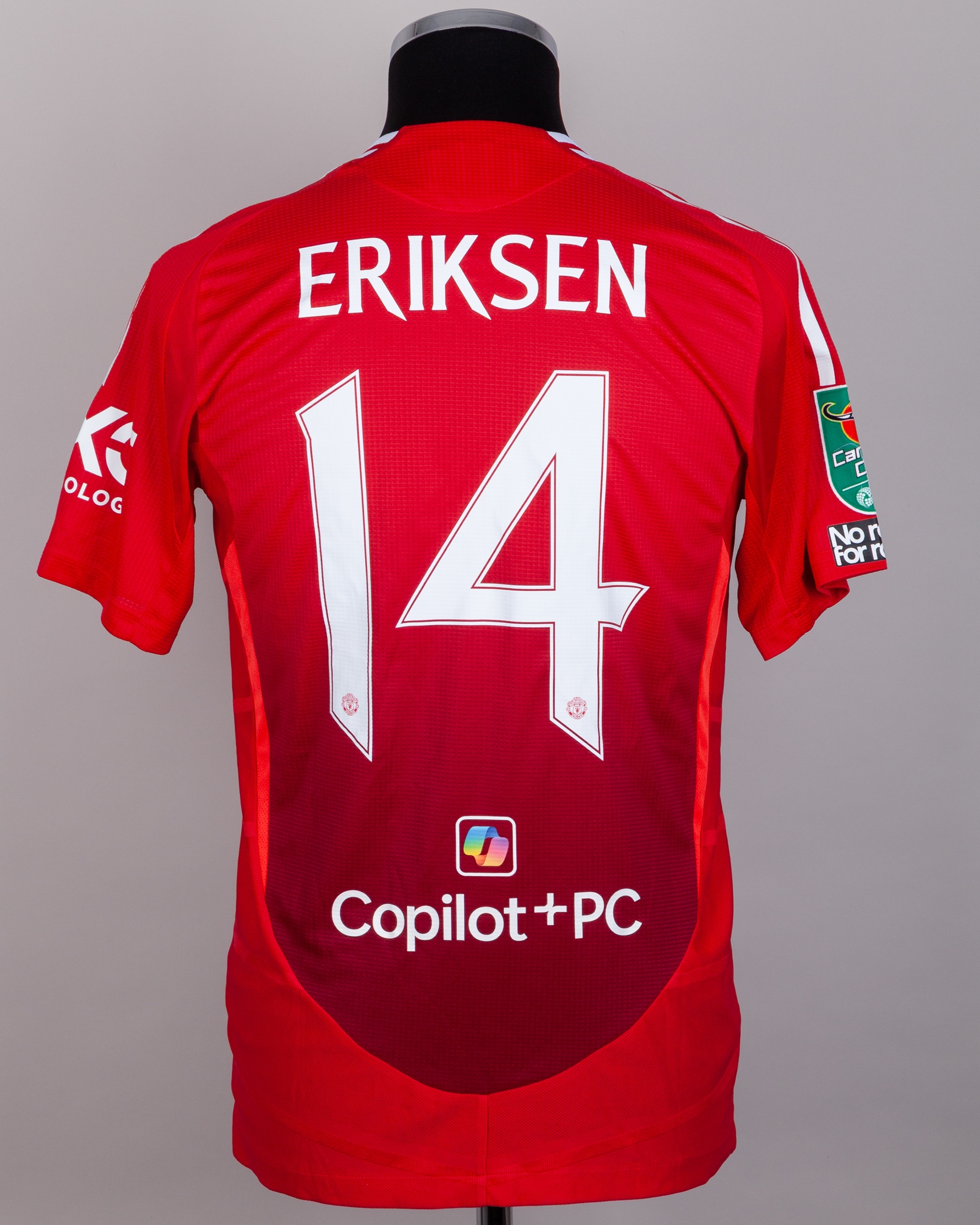 Christian Eriksen red No.14 Manchester United short-sleeved shirt, Adidas, M, with crew-neck collar and printed badge, the reverse lettered ERIKSEN, the right sleeve with Carabao Cup flash