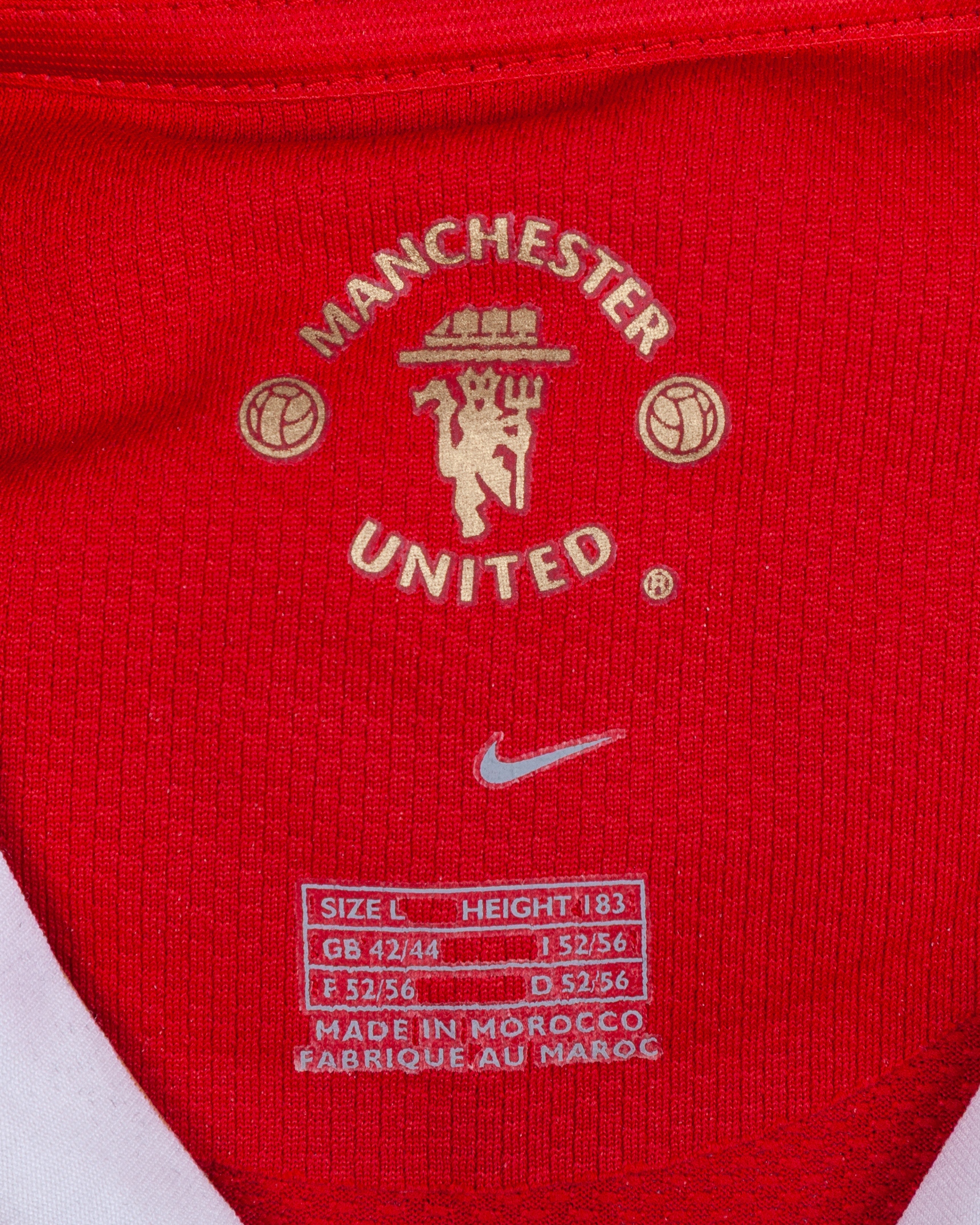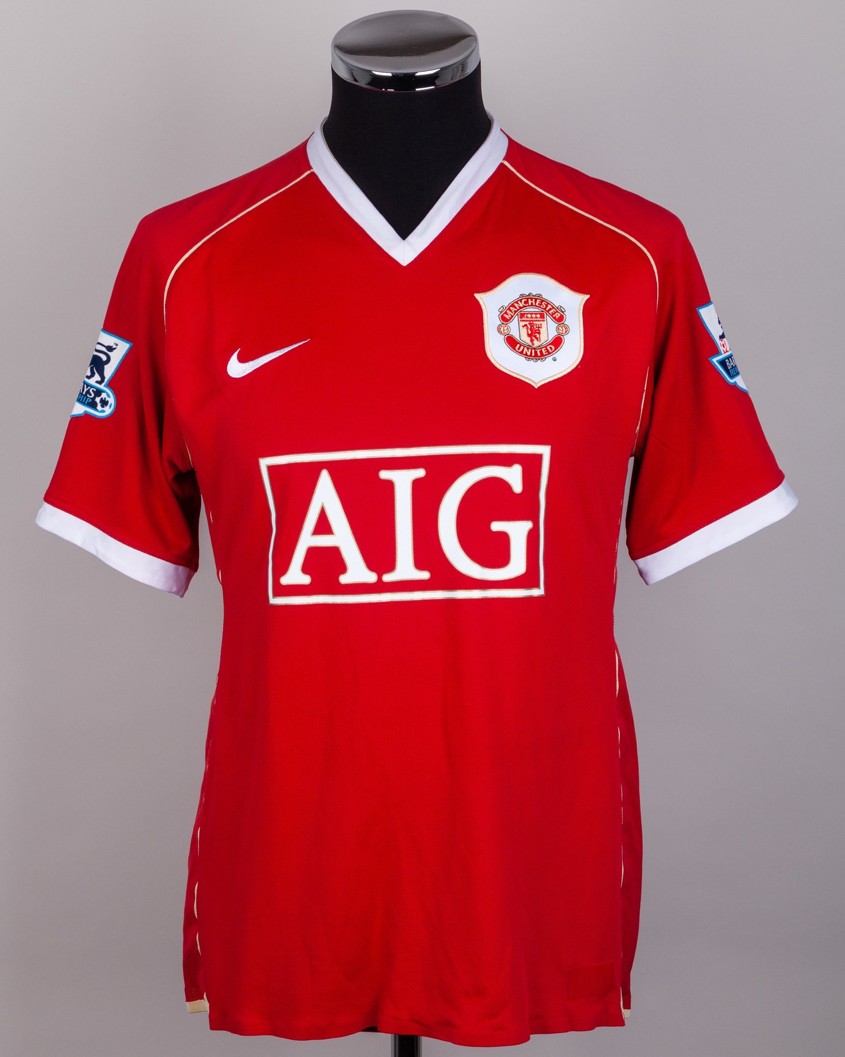 Patrice Evra red No.3 Manchester United short-sleeved shirt, 2006-07, Nike, L, with v-neck collar and embroidered cloth badge inscribed MANCHESTER UNITED, the reverse lettered EVRA, the sleeves with Barclays Premiership flashes