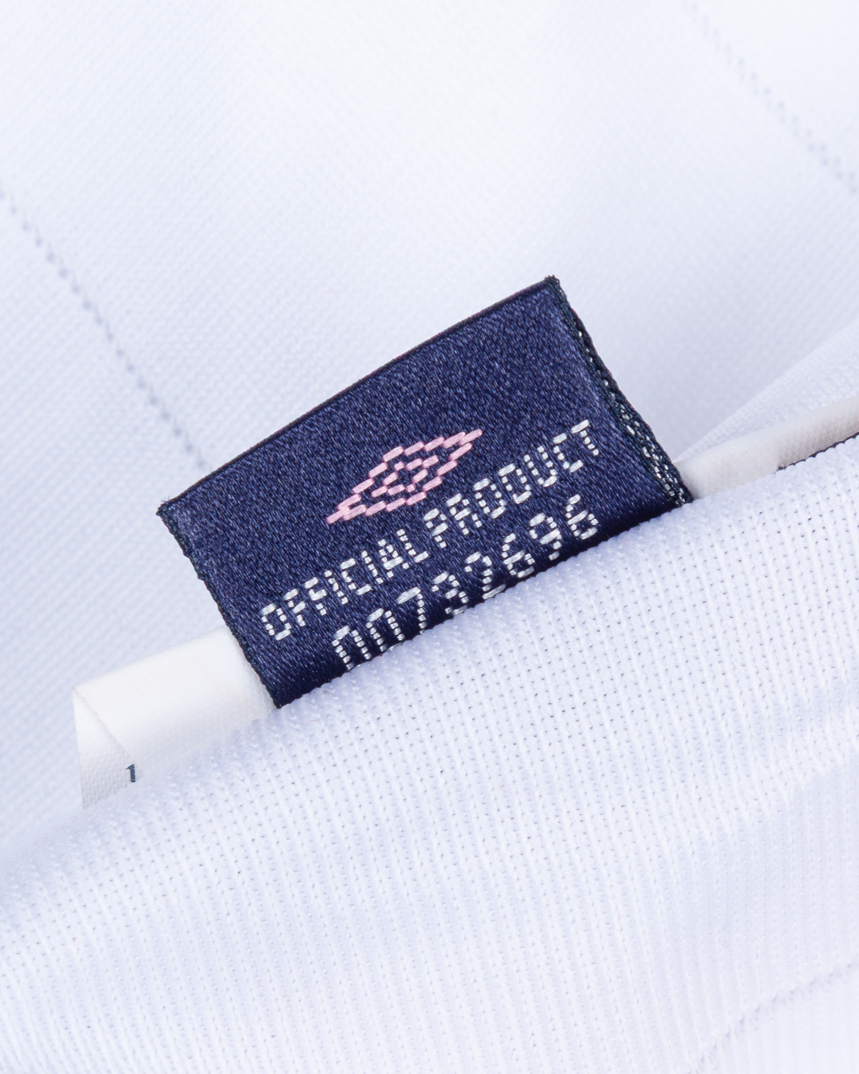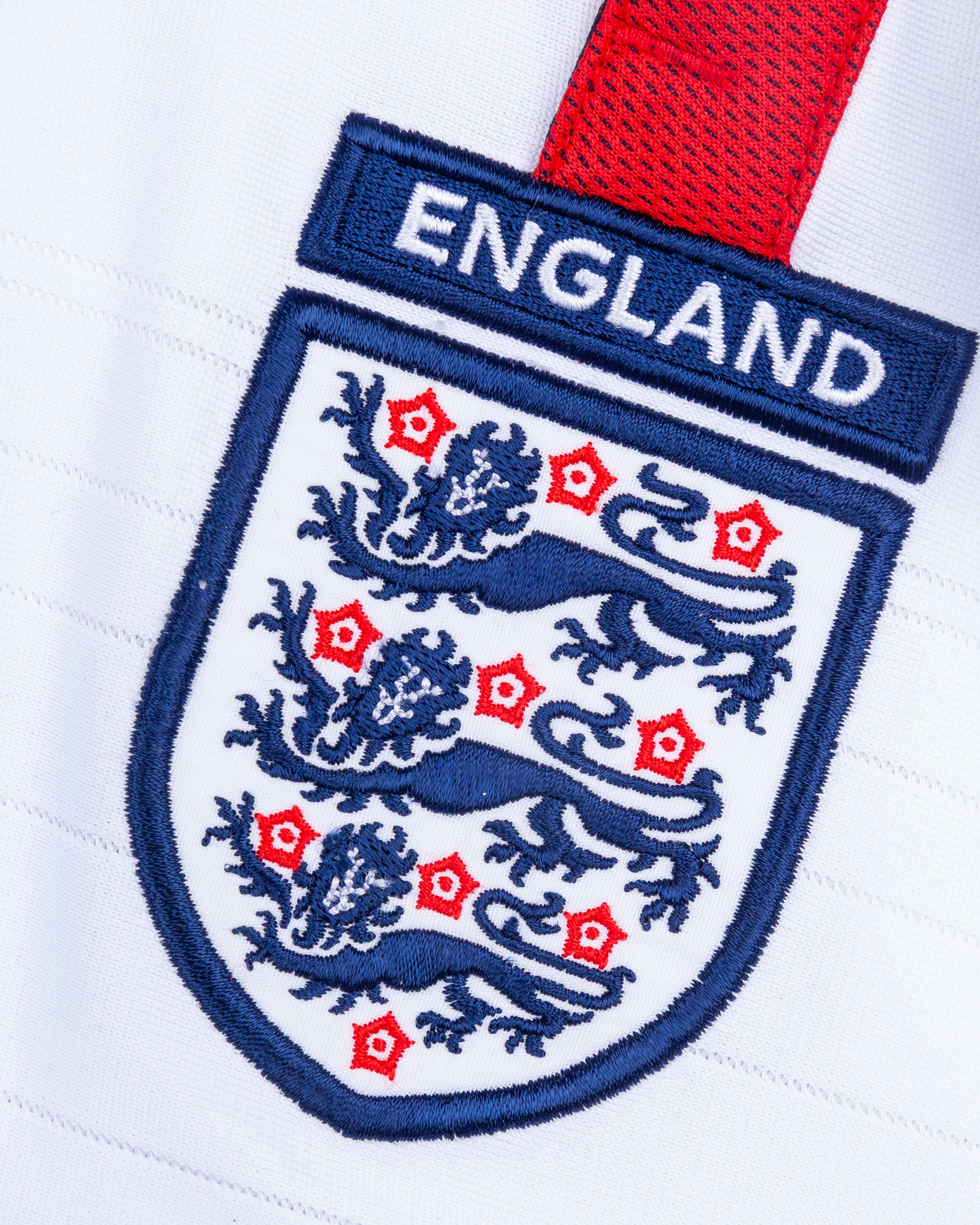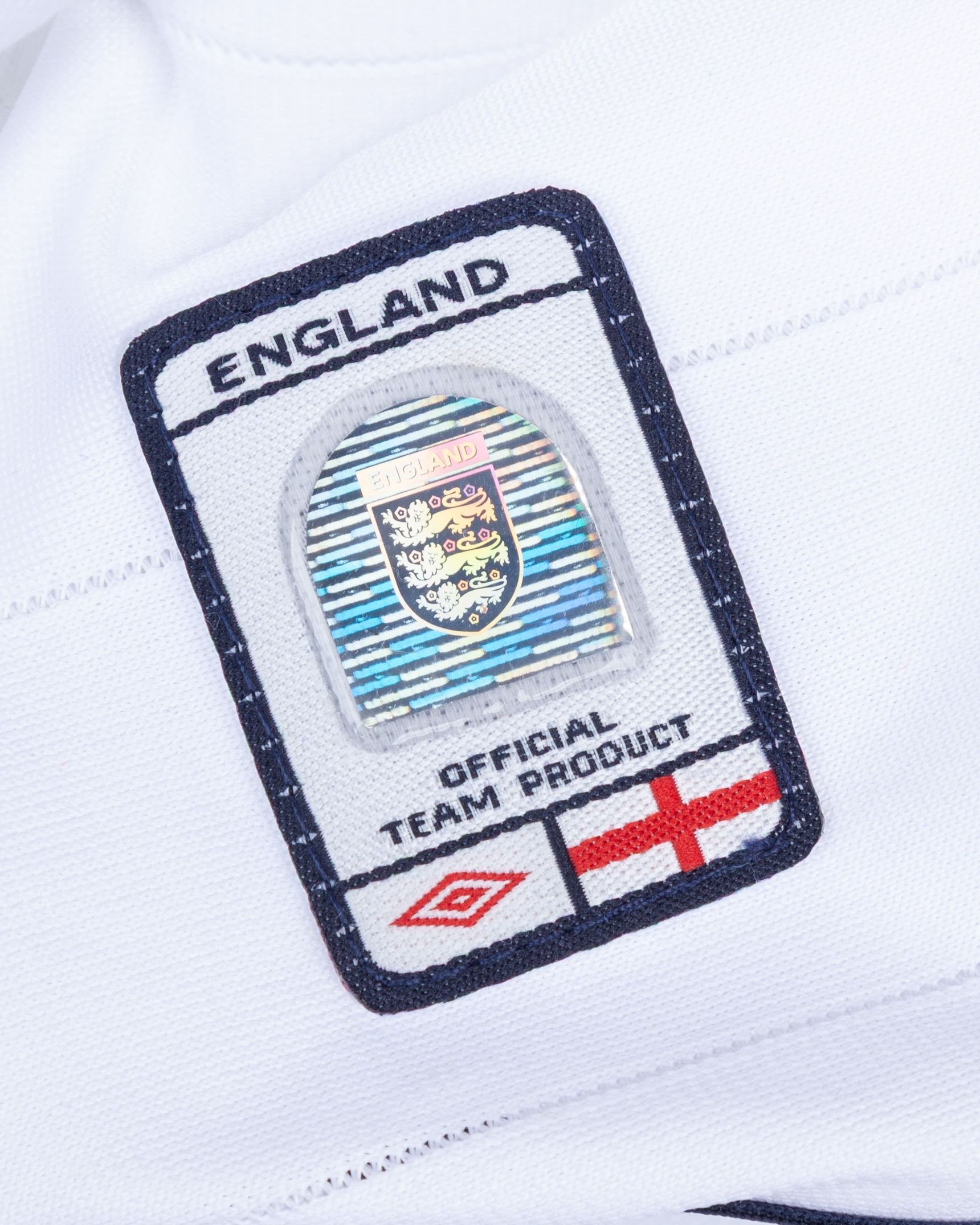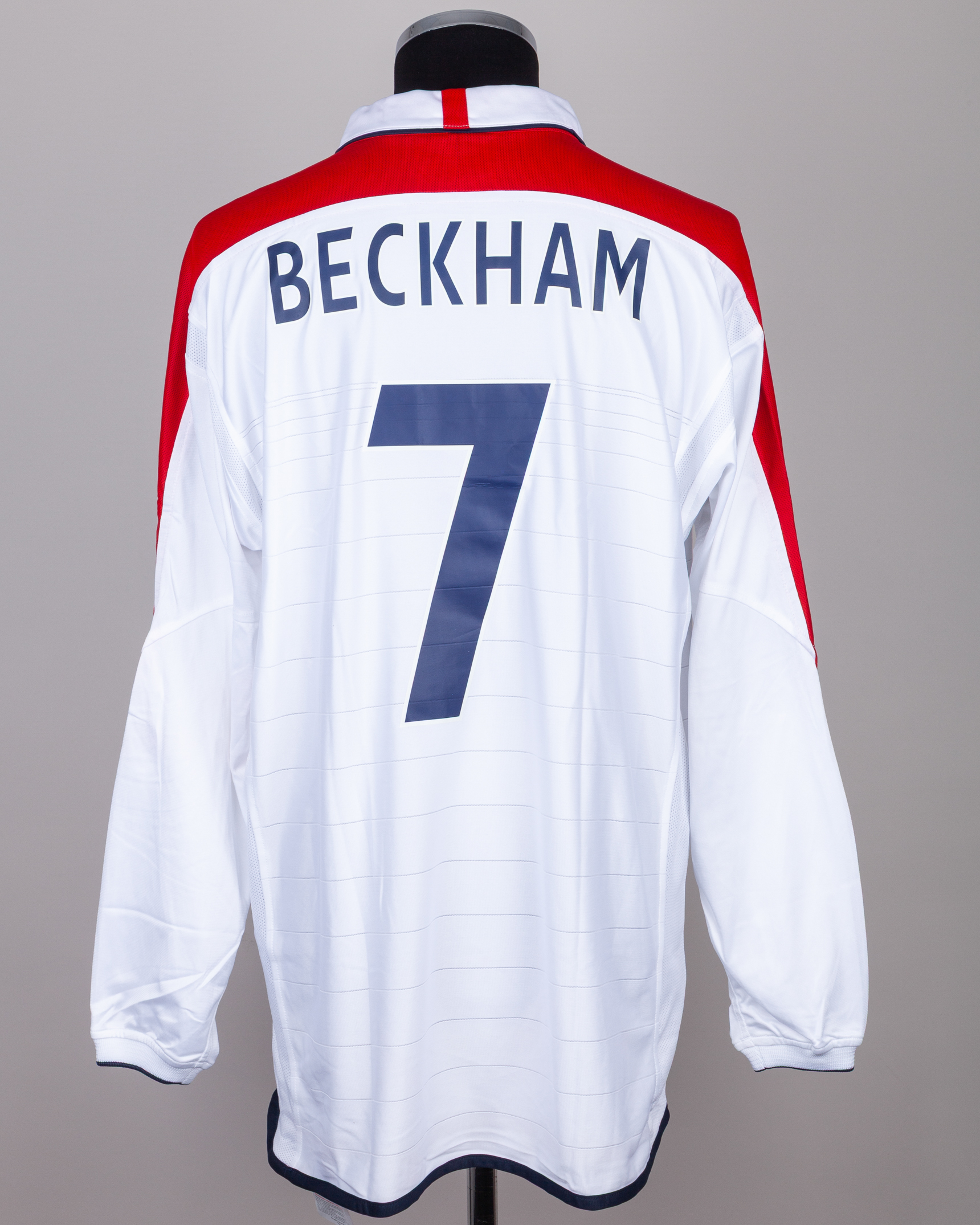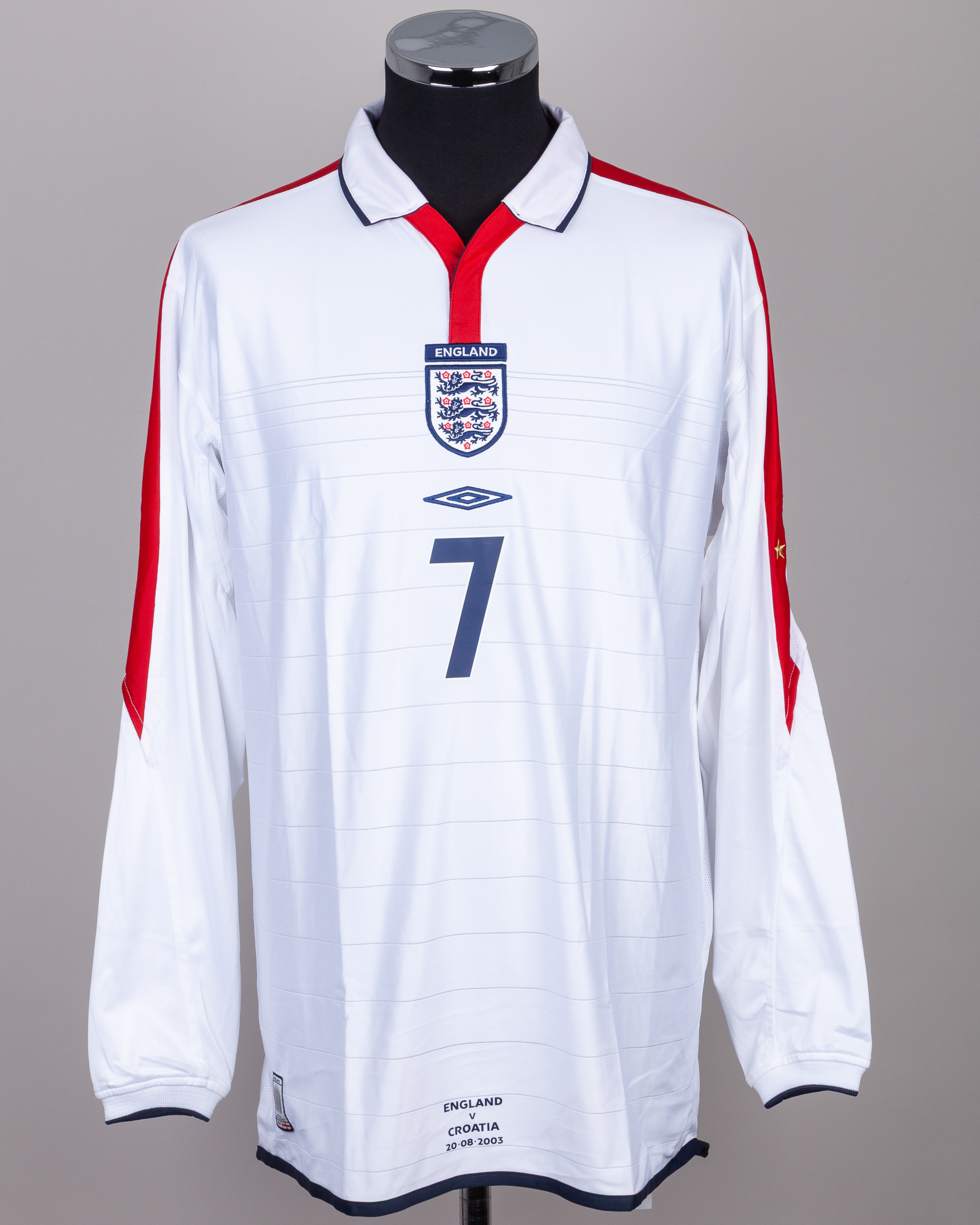 David Beckham white and red No.7 England v. Croatia match issued long-sleeved shirt, 2003, Umbro, XL, with button-up collar and embroidered cloth badge inscribed ENGLAND, ENGLAND v CROATIA 20.08.2003 decal, the reverse lettered BECKHAM