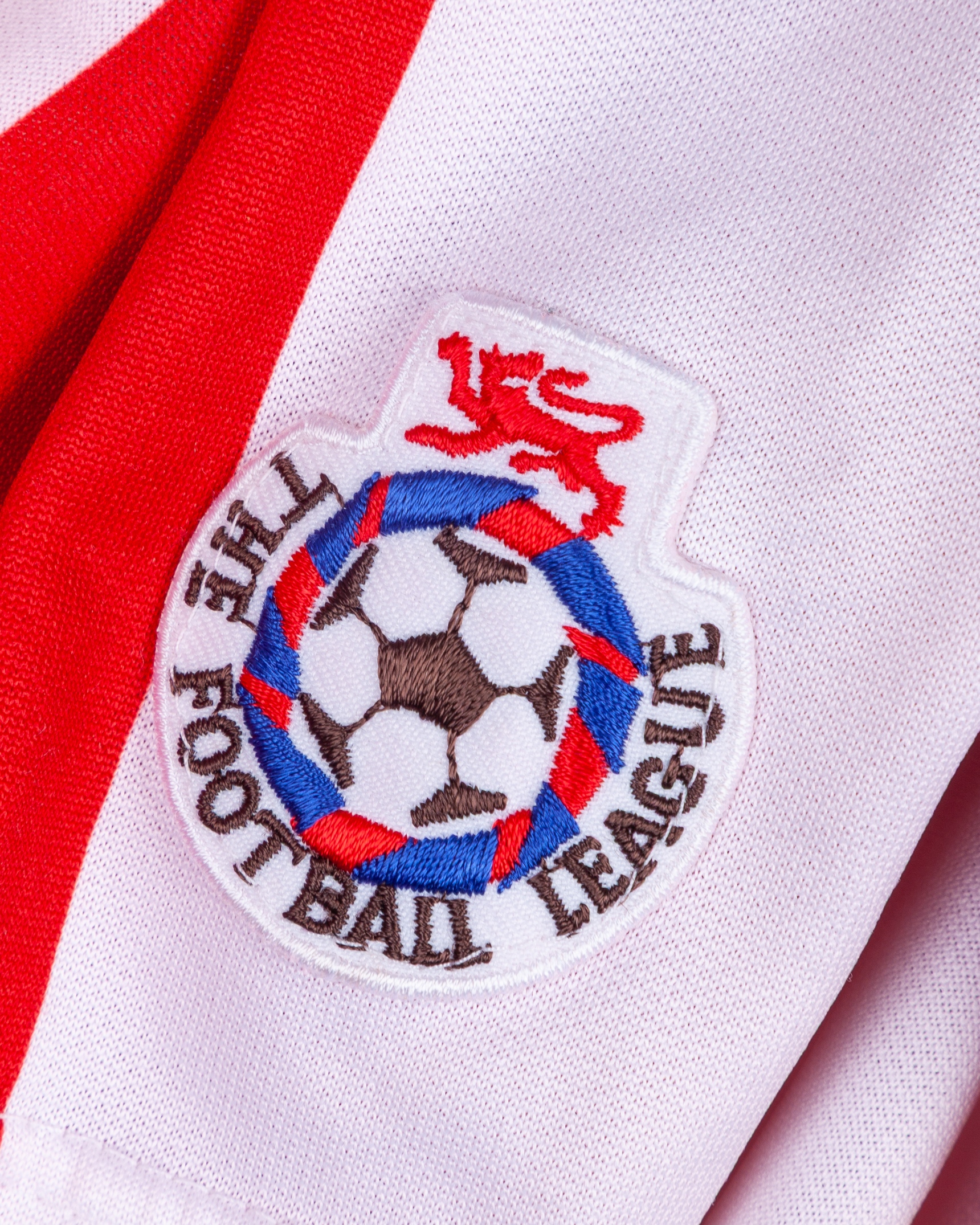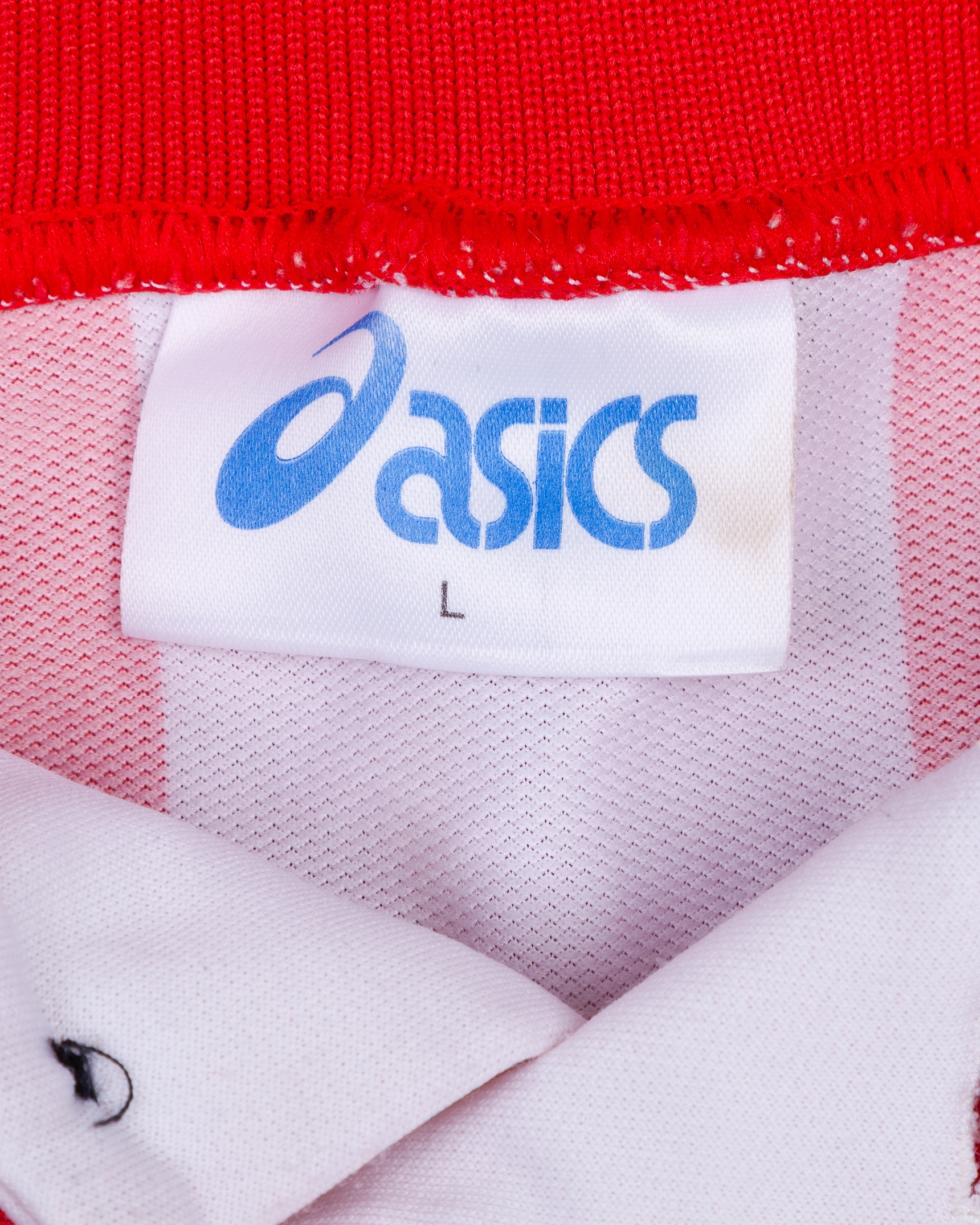 Ian Clarkson red and white No.8 Stoke City match worn short-sleeved shirt, 1993-94, Asics, L, with button-up collar and embroidered badge inscribed STOKE CITY F.C., the sleeves with The Football League flashes, wear to sponsor's logo and number