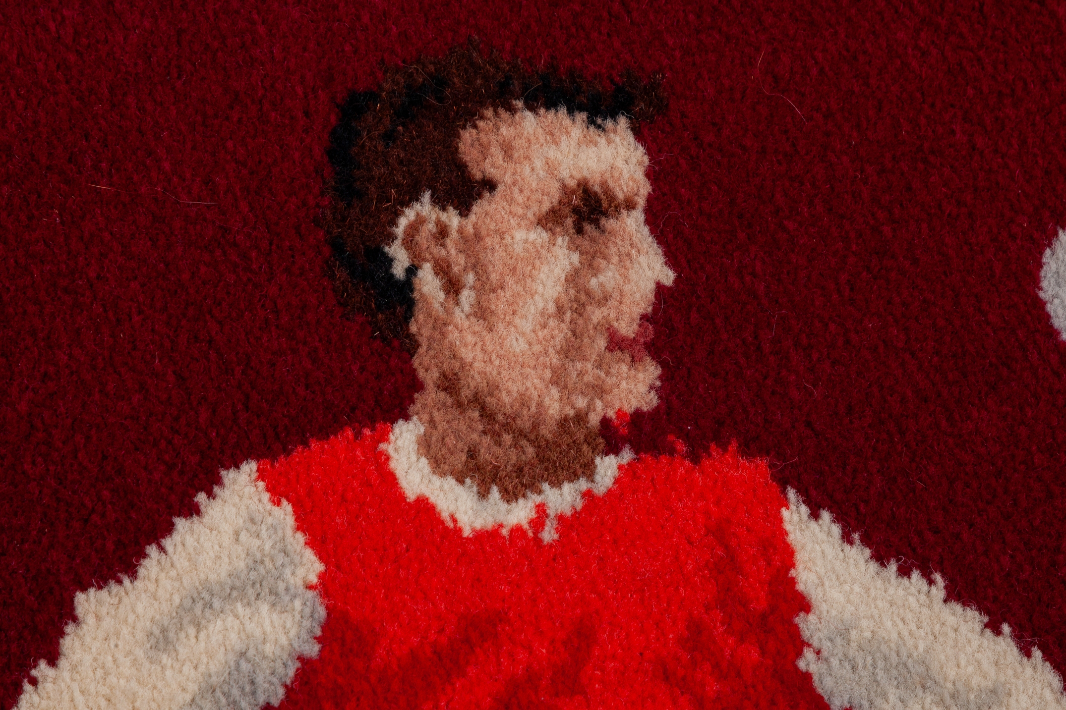 An Arsenal FC Axminster rug circa 1968, manufactured exclusively for the Pictorial Rug Co. Ltd., Glasgow, the design incorporating two Arsenal footballers and the Cannon crest & motto on a redcurrant background, wool & synthetic mix, maker's label, 69 by 130cm., very good condition