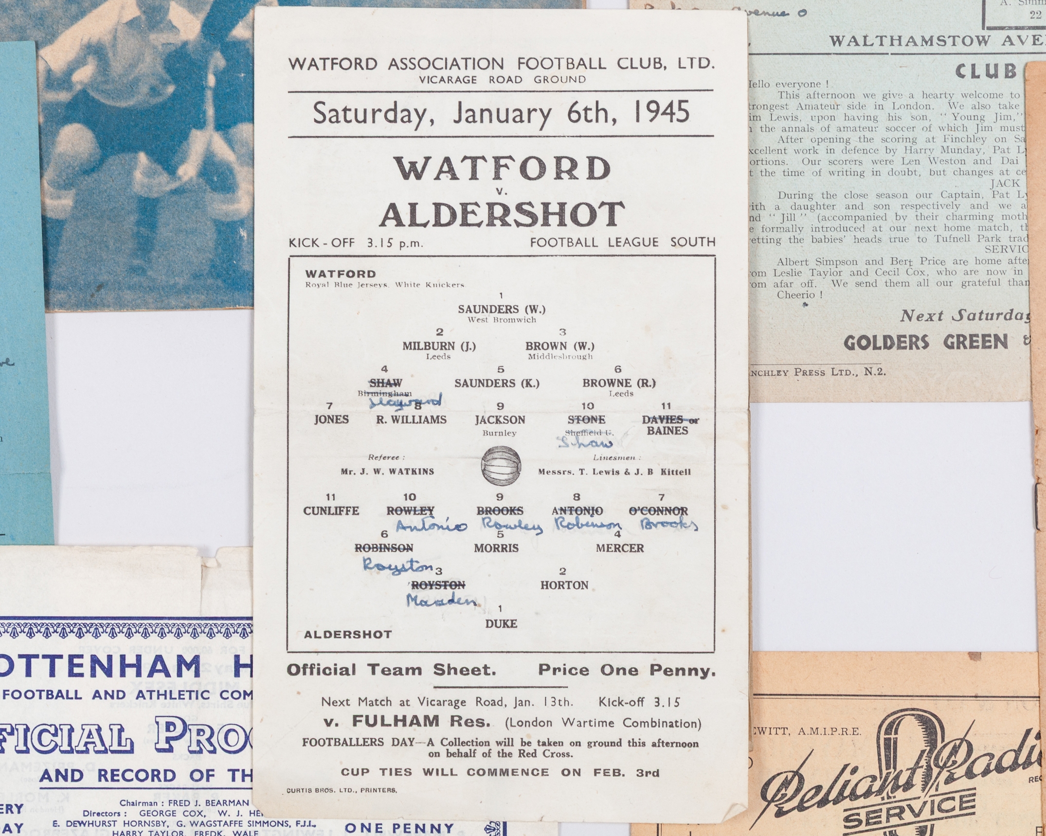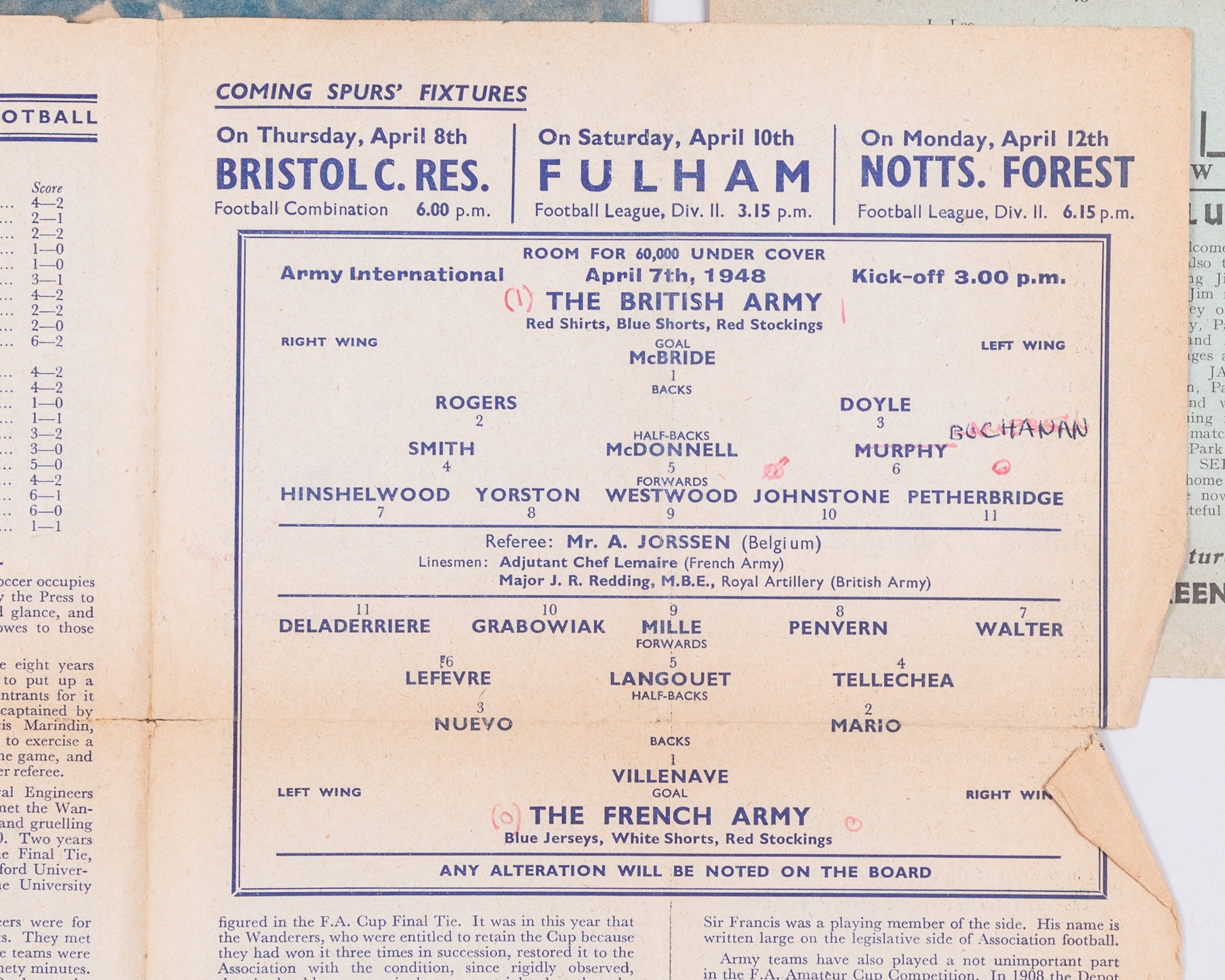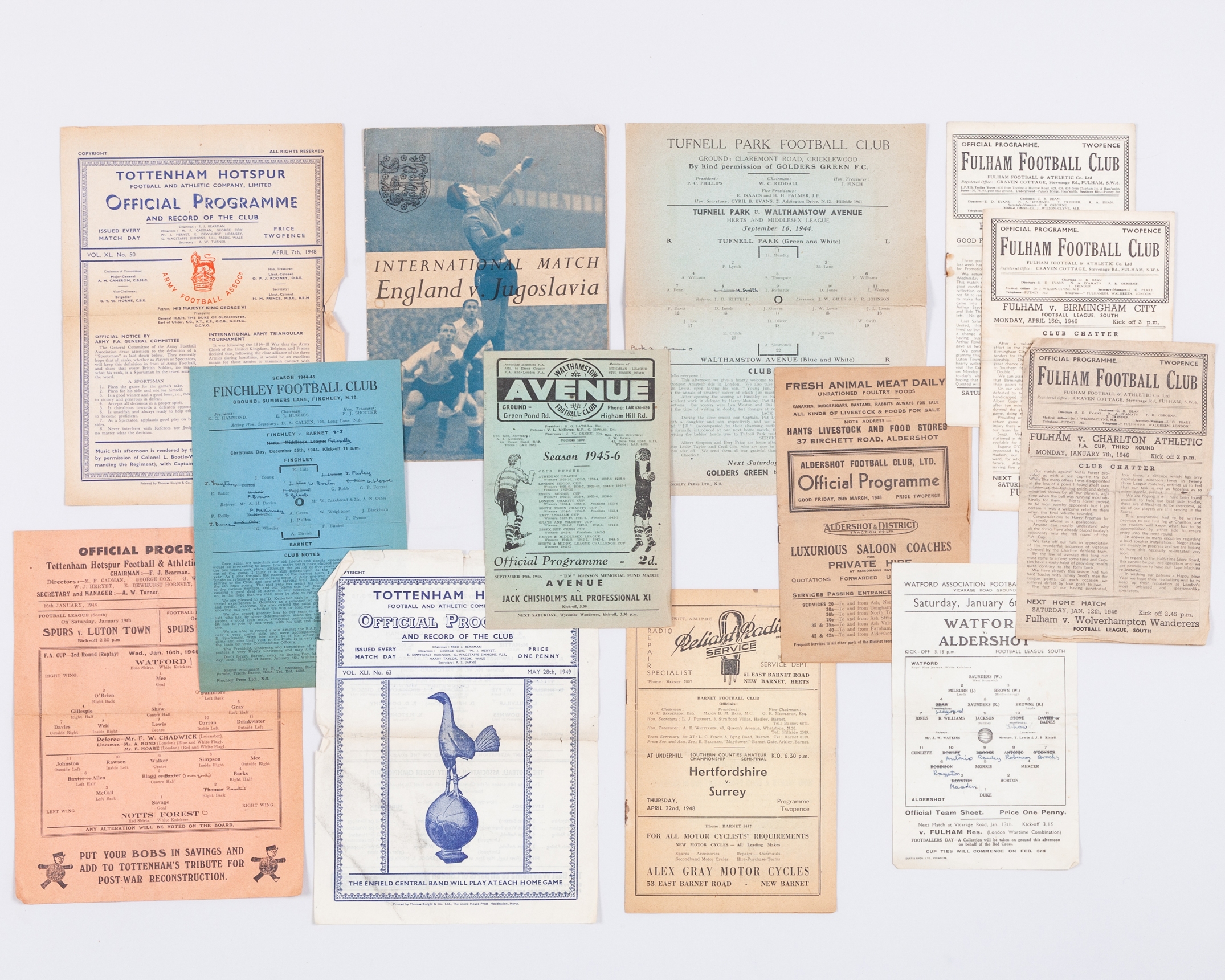 A collection of mixed programmes, 1940/50s including Watford v. Notts Forest, F.A.Cup replay at White Hart lane, 16th January 1946, England v. Yugoslavia, 22nd November 1950 at Highbury, Golders Green v. Finchley, 14th April 1945, Watford v. Aldershot, 6th January 1945, The British Army v. The French Army, 7th April 1948 at White Hart Lane etc, text, folds and stained