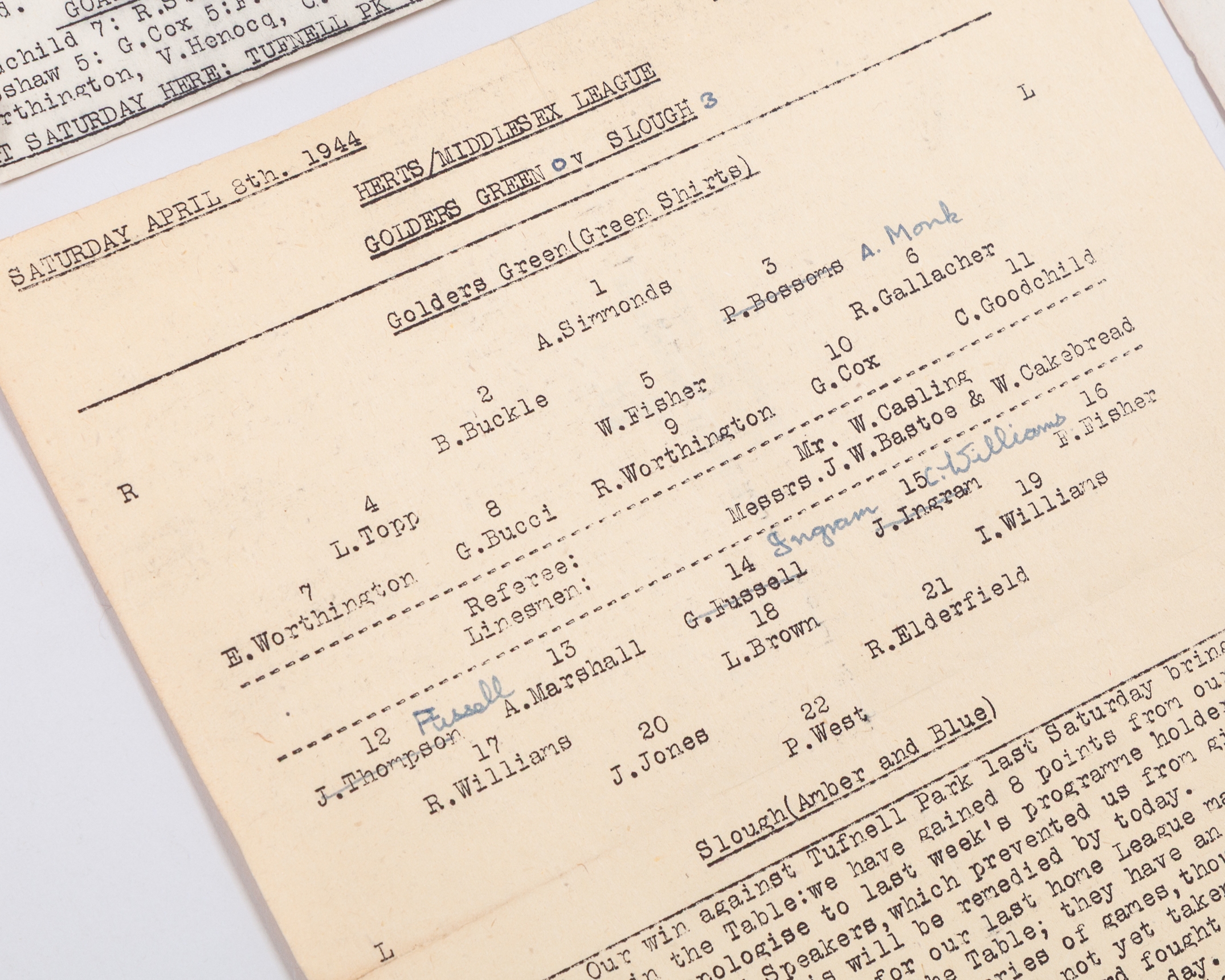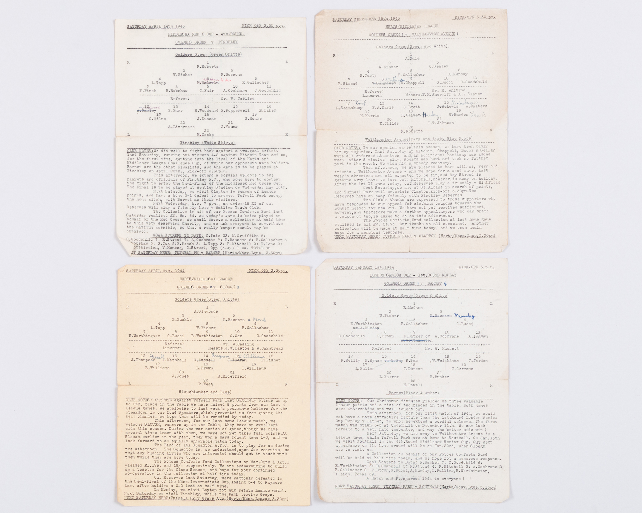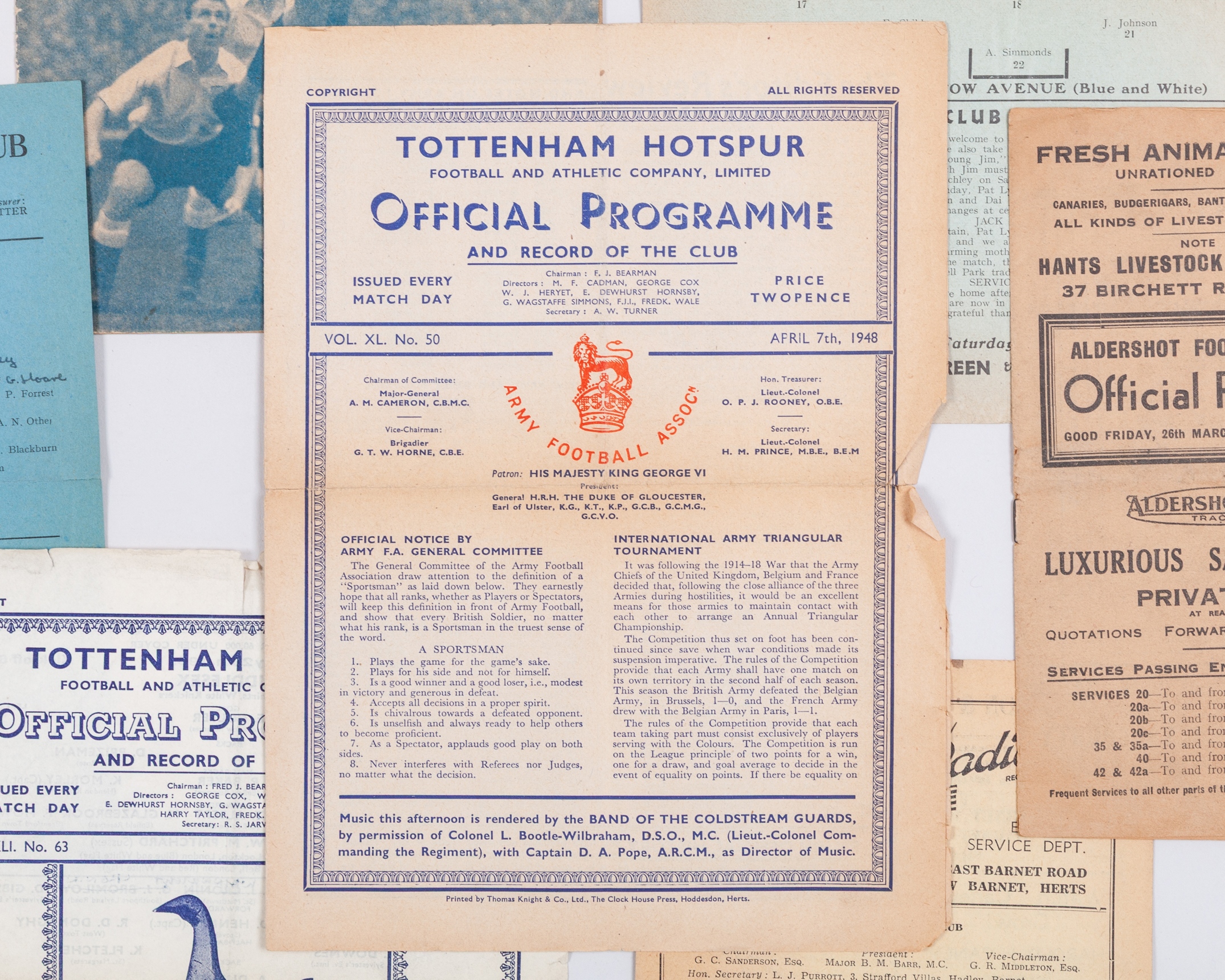 A collection of mixed programmes, 1940/50s including Watford v. Notts Forest, F.A.Cup replay at White Hart lane, 16th January 1946, England v. Yugoslavia, 22nd November 1950 at Highbury, Golders Green v. Finchley, 14th April 1945, Watford v. Aldershot, 6th January 1945, The British Army v. The French Army, 7th April 1948 at White Hart Lane etc, text, folds and stained