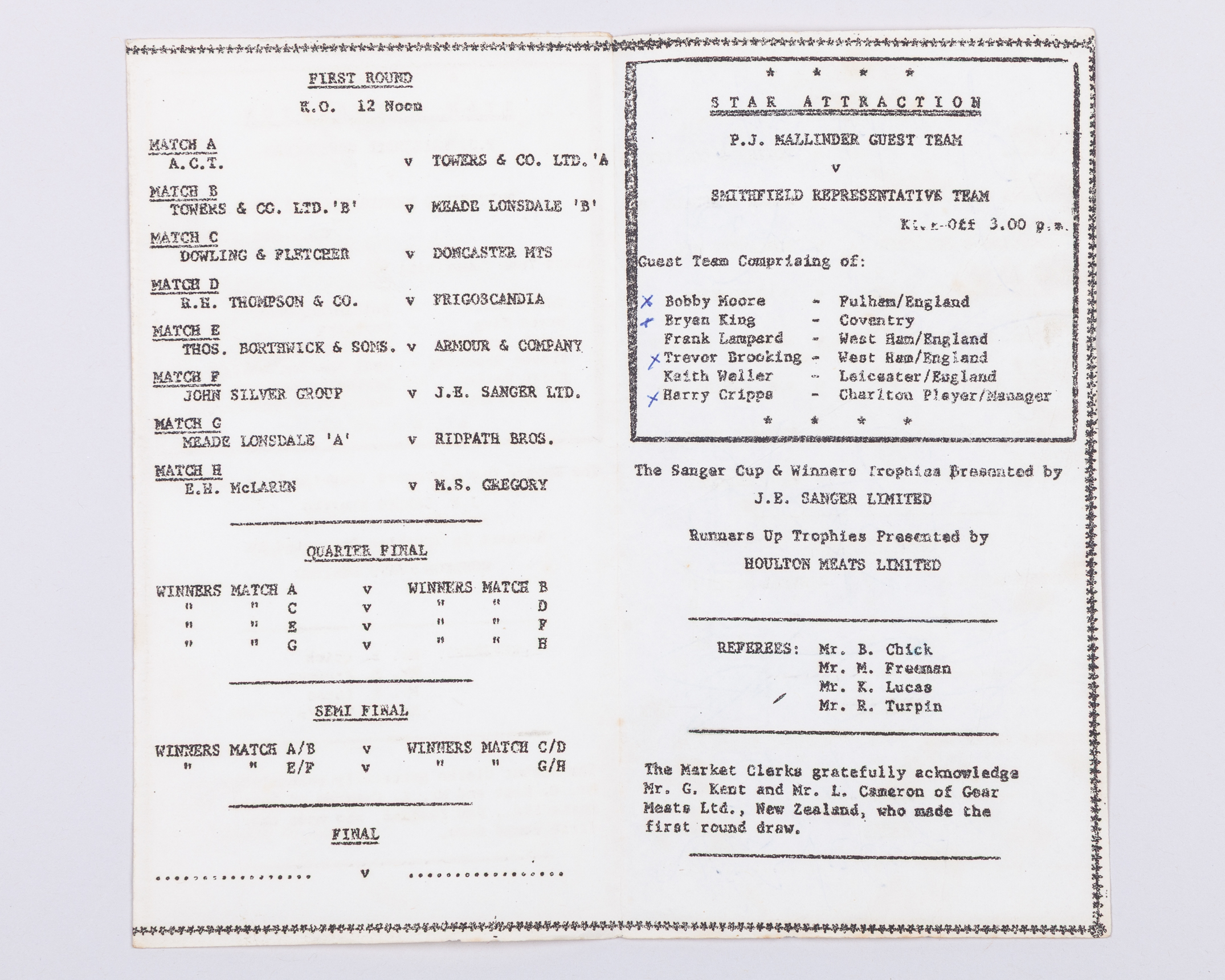 A 1975 five-a-side autographed football tournament programme featuring Bobby Moore, Keith Weller, Bryan King, Trevor Brooking, Frank Lampard, Harry Cripps, the programme signed by all six