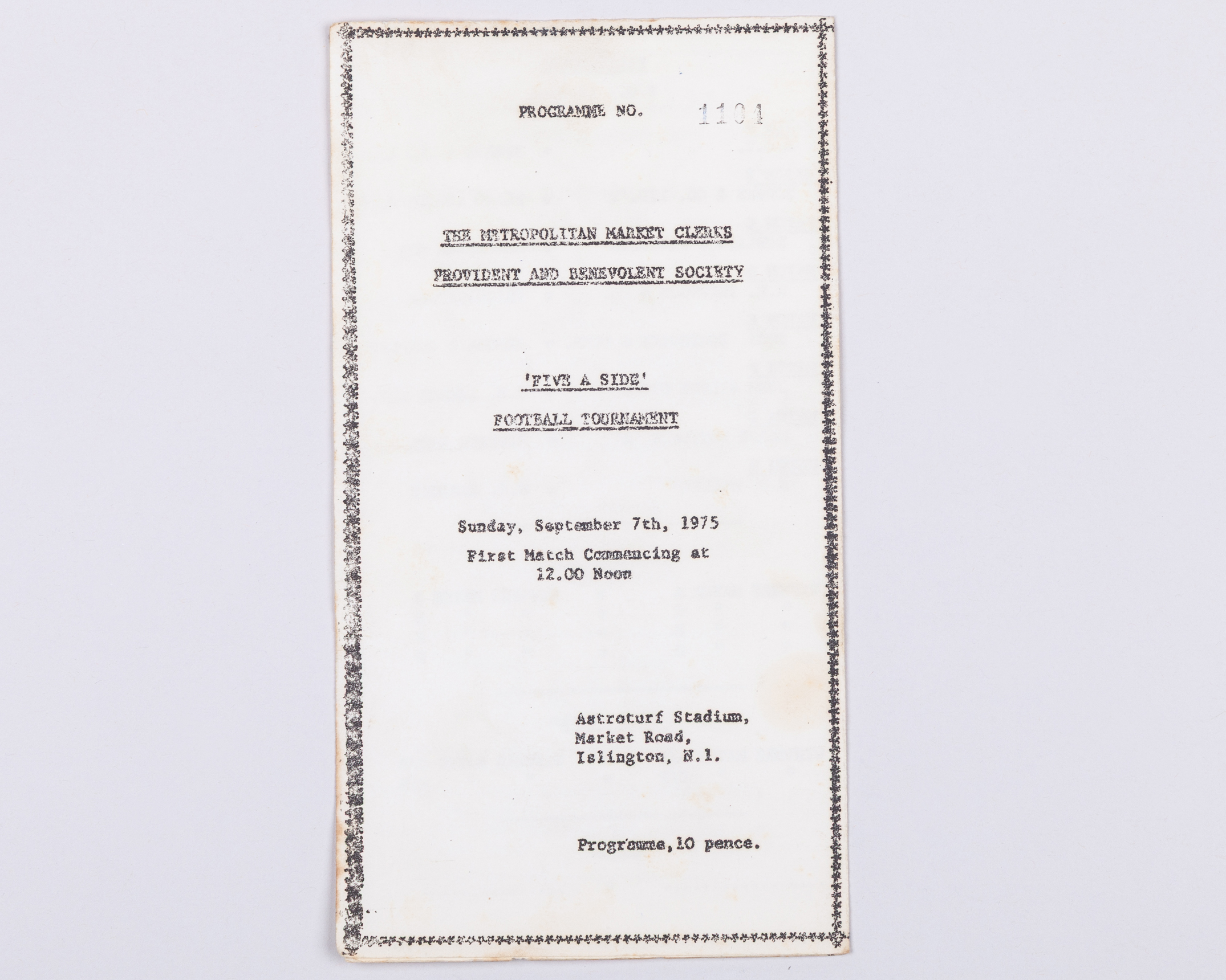 The programme is from the Metropolitan Market Charing Provident & Benevolent Society Five-a-Side Football Tournament, held on Sunday 7 September 1975 at the Astroturf Stadium, Market Road, Islington, London N1.