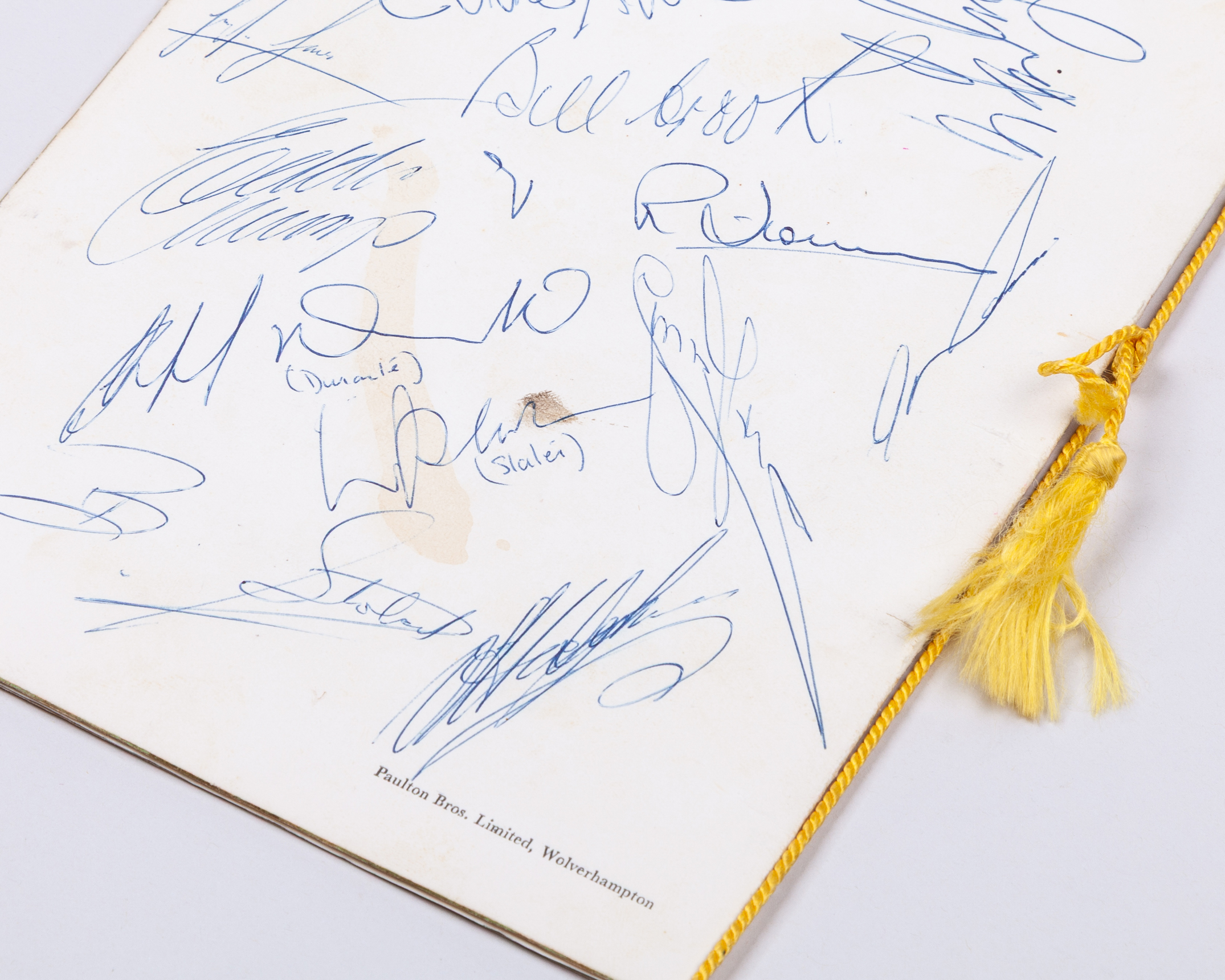 A Wolverhampton Wanderers Winners of the Football Association Civic Banquet autographed menu card, 1960, the front and back cover with twenty autographs including Billy Wright, Norman Deelay, Eddie Clamp, Bill Slater etc