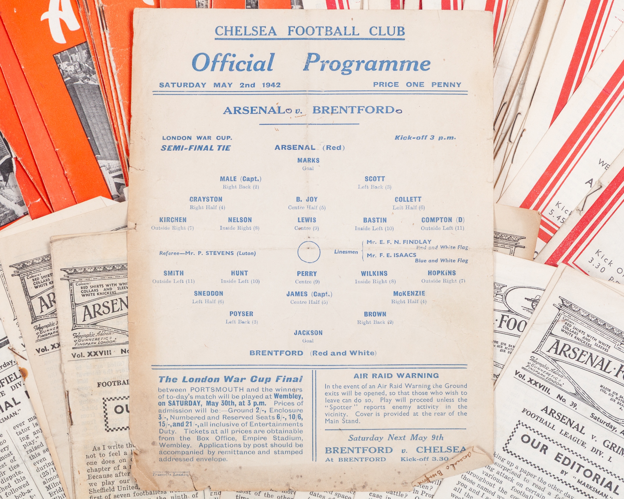 A collection of Arsenal home match programmes from 1942 to 1950, including Brentford, 2nd May 1942, Southampton, 5th September 1942, with text, folds and staining throughout