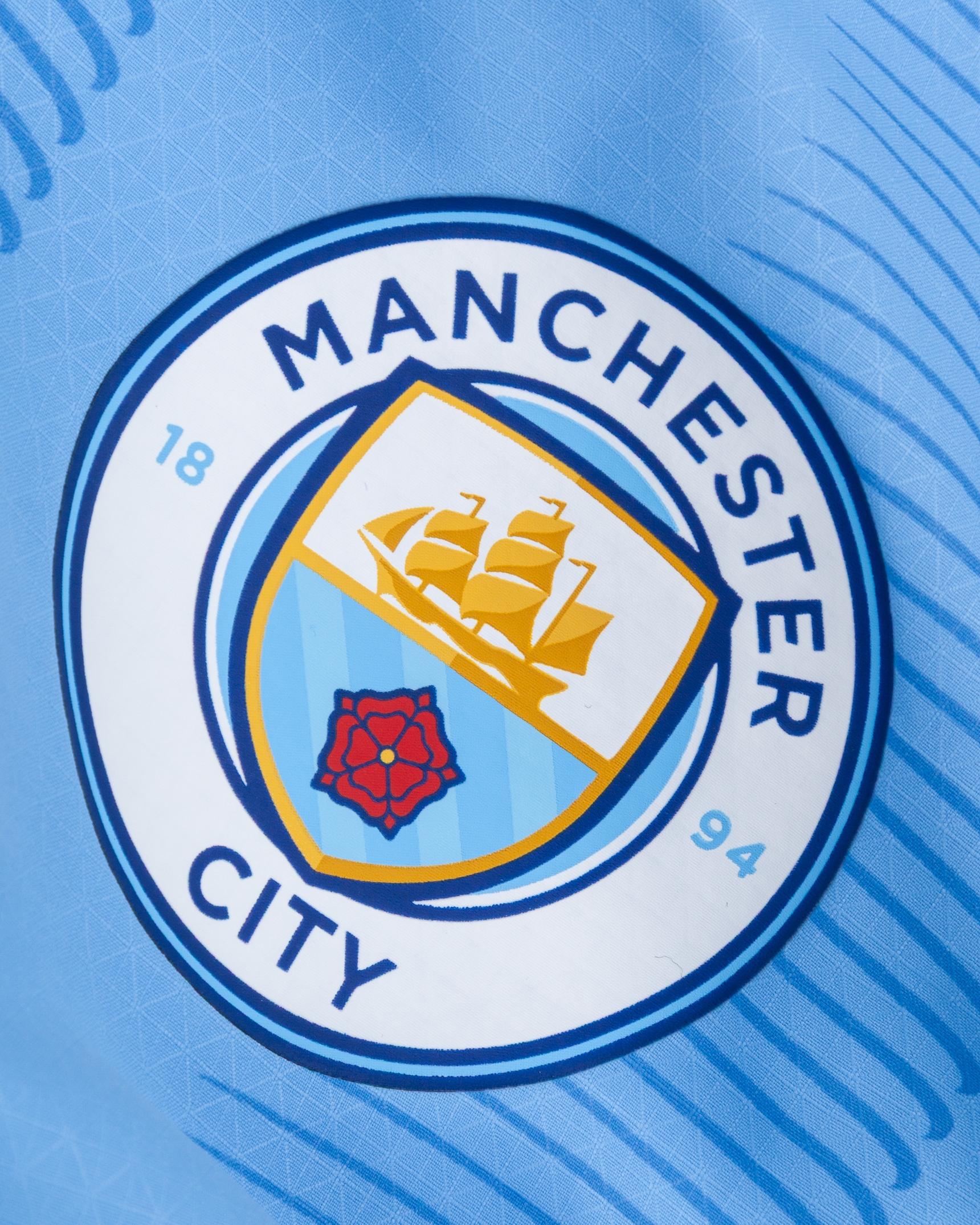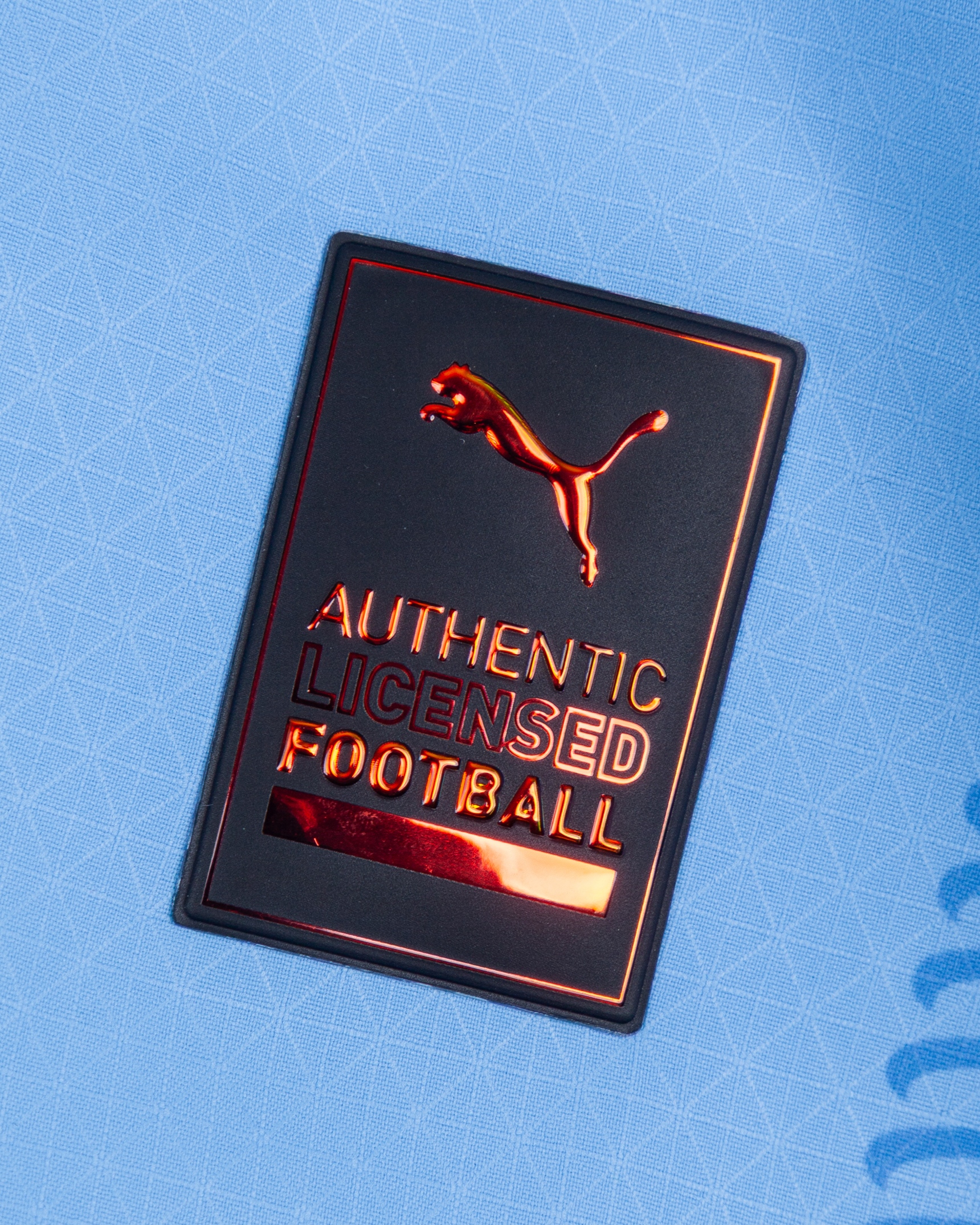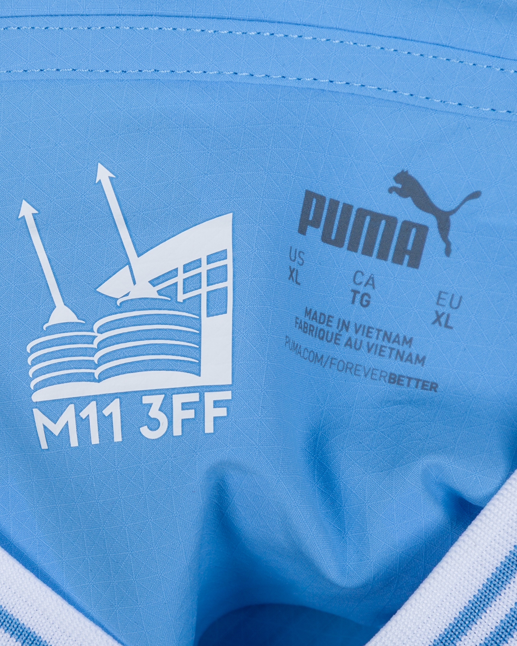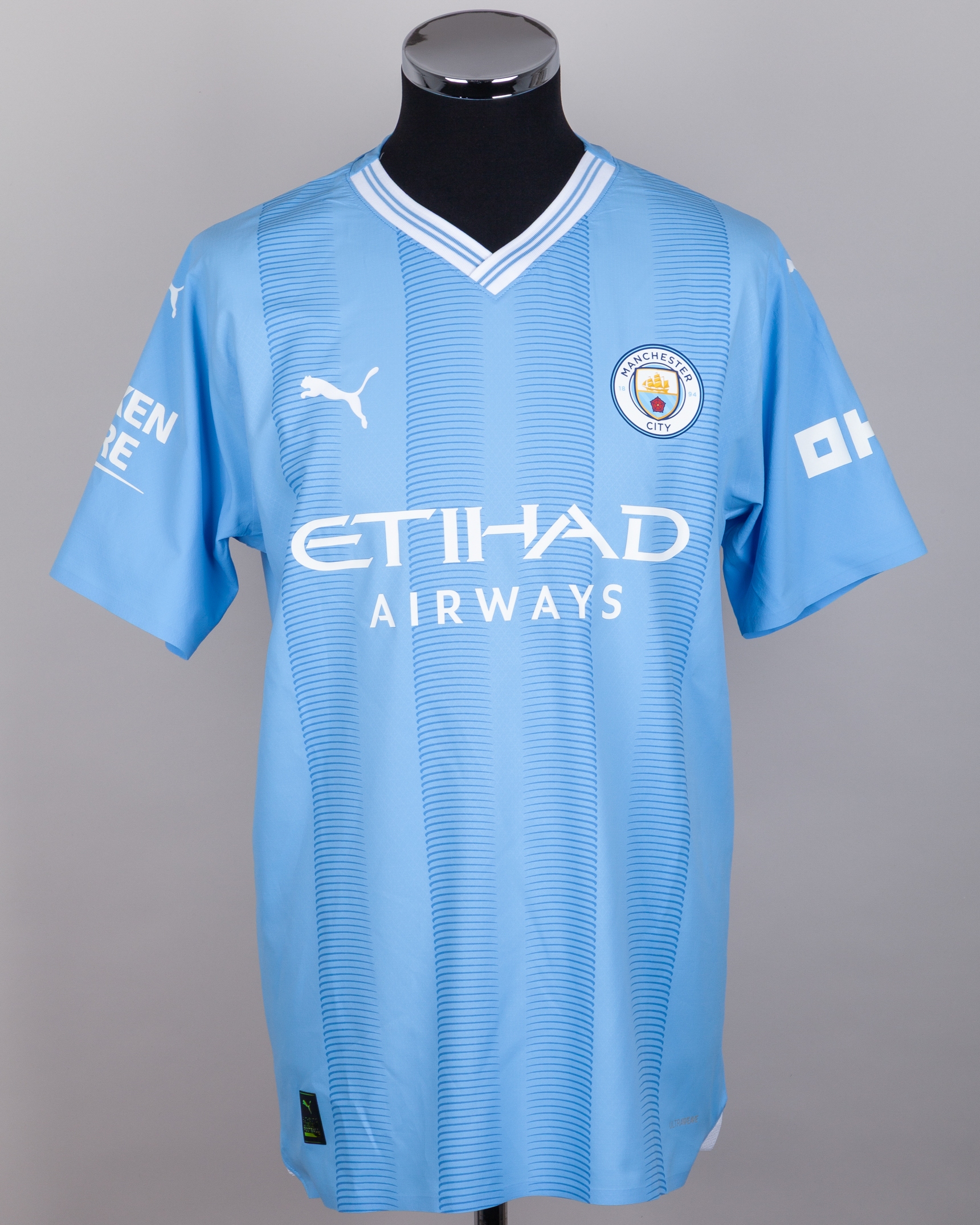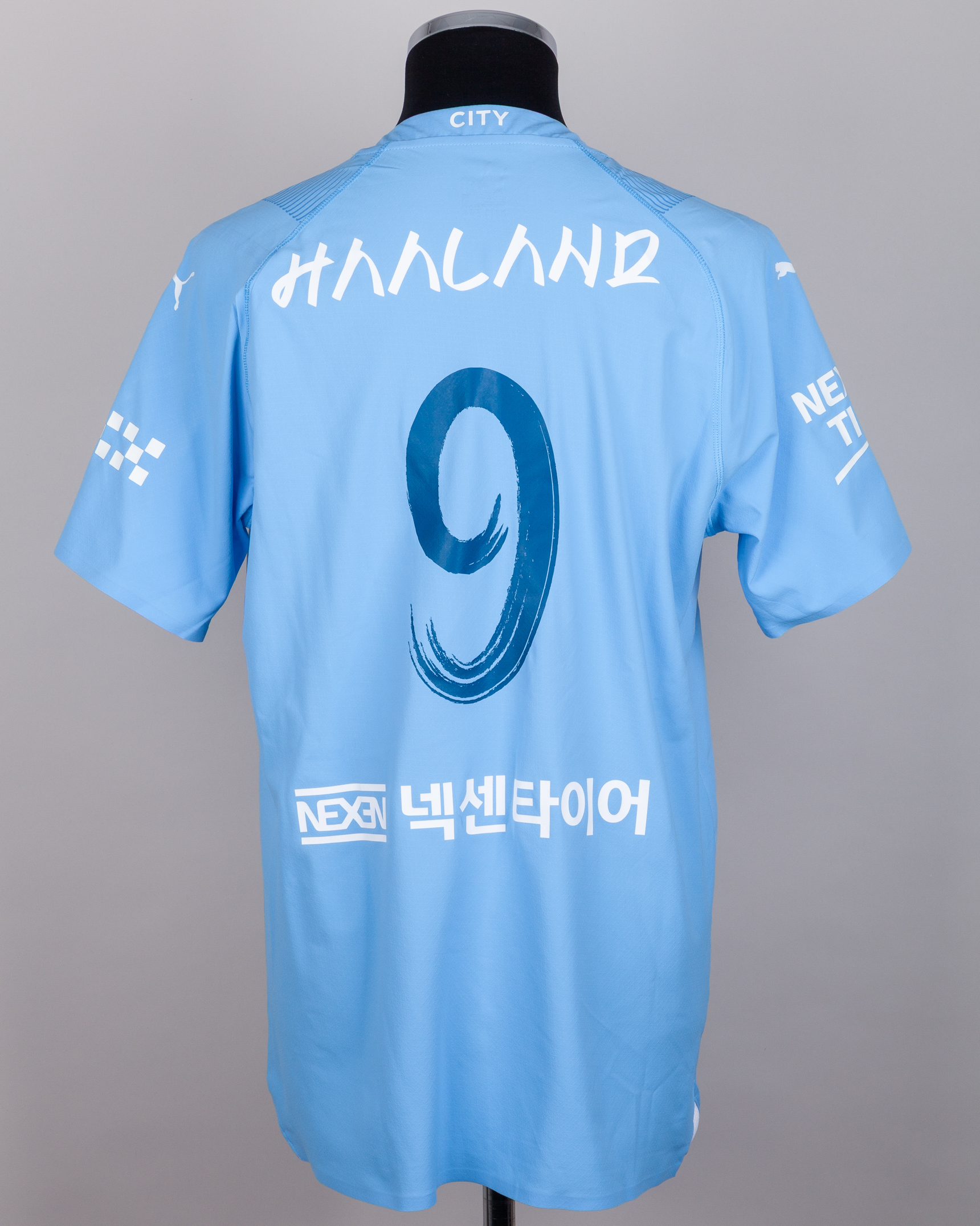 Erling Haaland blue No.9 Manchester City pre-season short-sleeved shirt, 2023, Puma, XL, with v-neck collar and printed badge, the reverse lettered HAALAND and in a special style for their South Korea pre-season tour