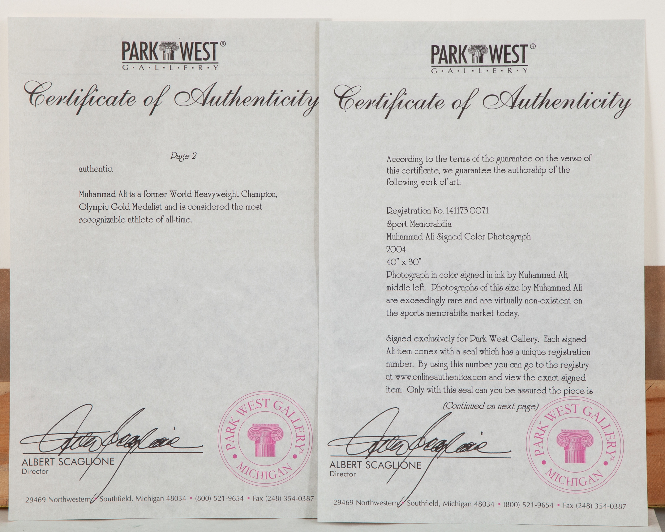A large colour signed photograph of Muhammad Ali, the image taking during a training session, with COA from Park West Gallery, the image 100 x 73cm, overall 130 x 106cm, framed