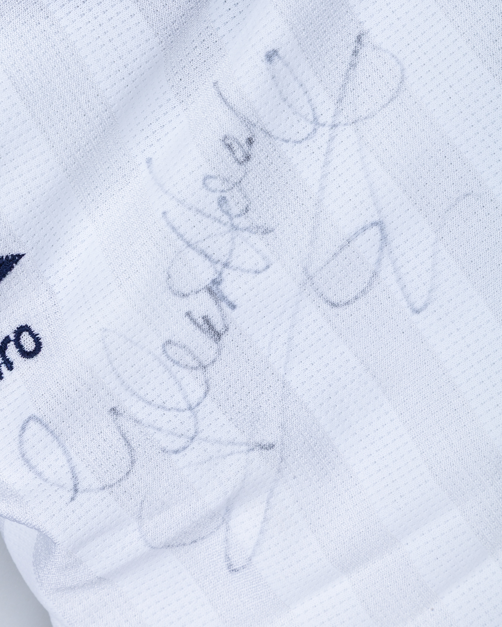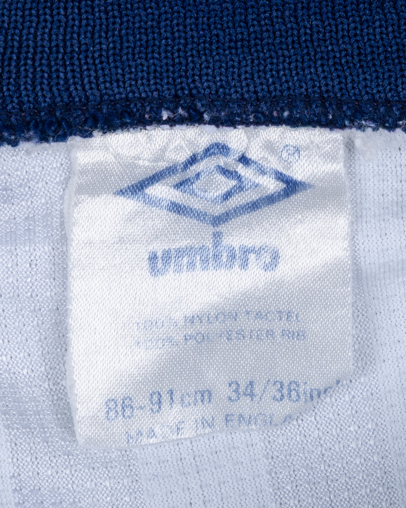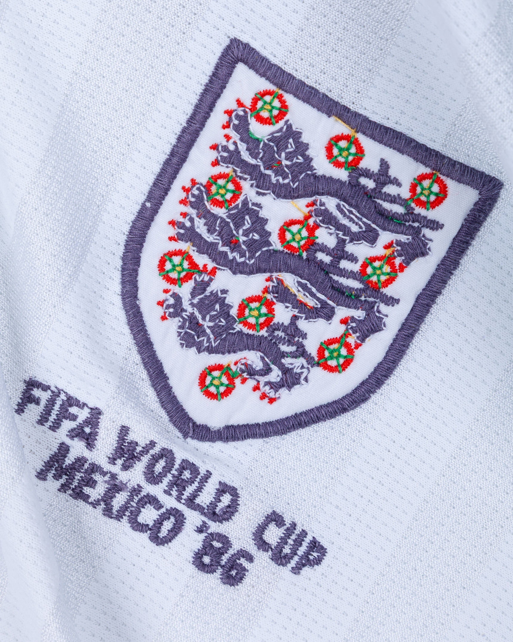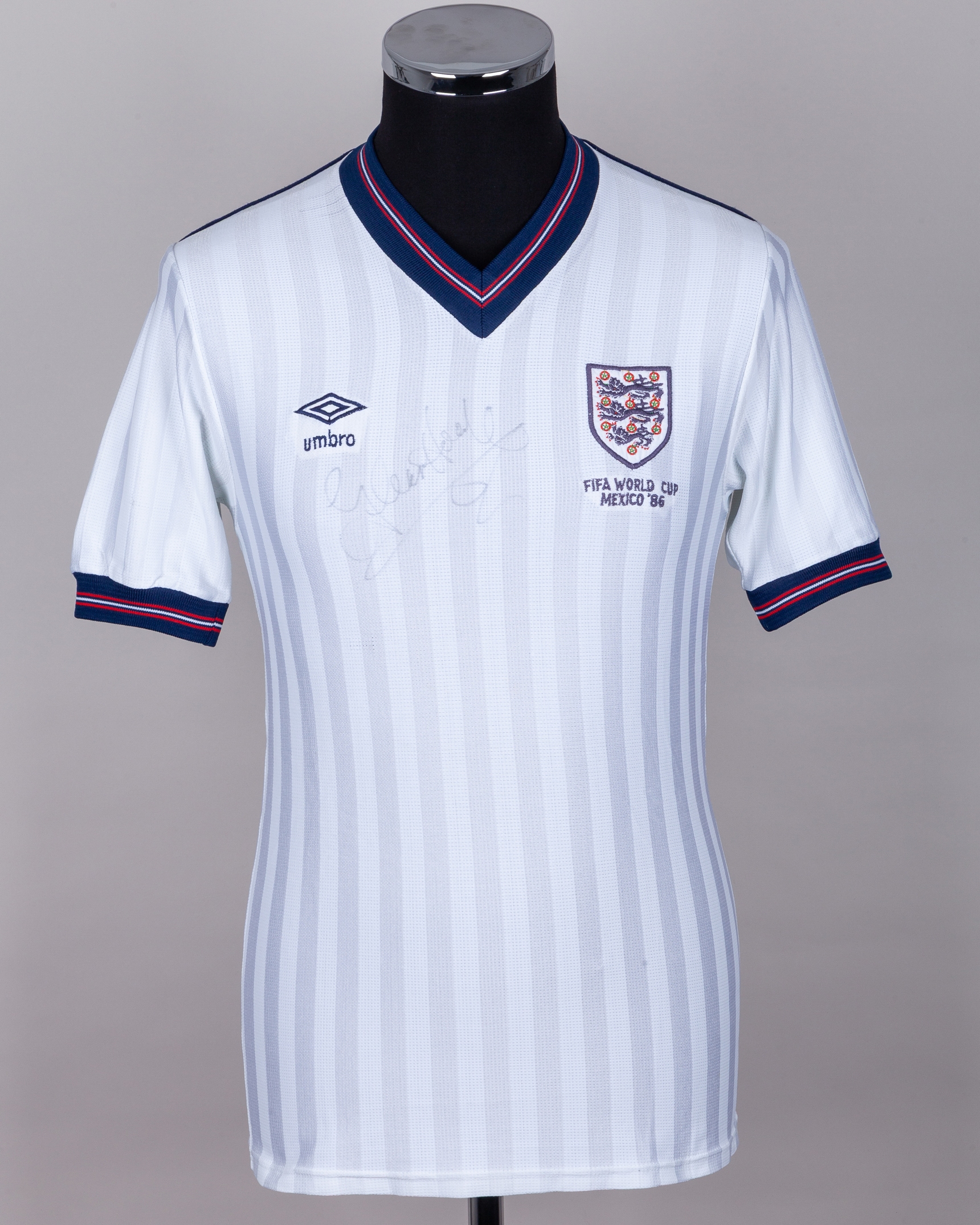 Glenn Hoddle autographed white England short-sleeved shirt, 1986, Umbro, 86-91cm, with v-neck collar and embroidered cloth badge, inscribed FIFA WORLD CUP MEXICO '86, autograph slightly faded, with some pulls