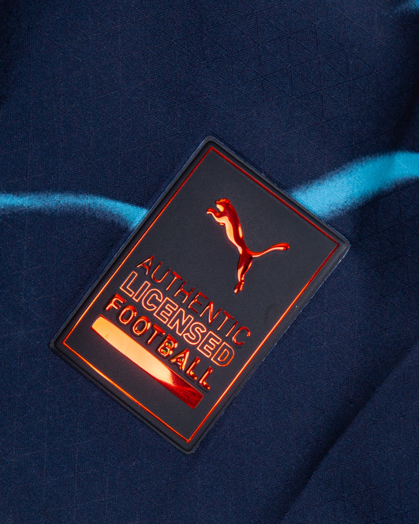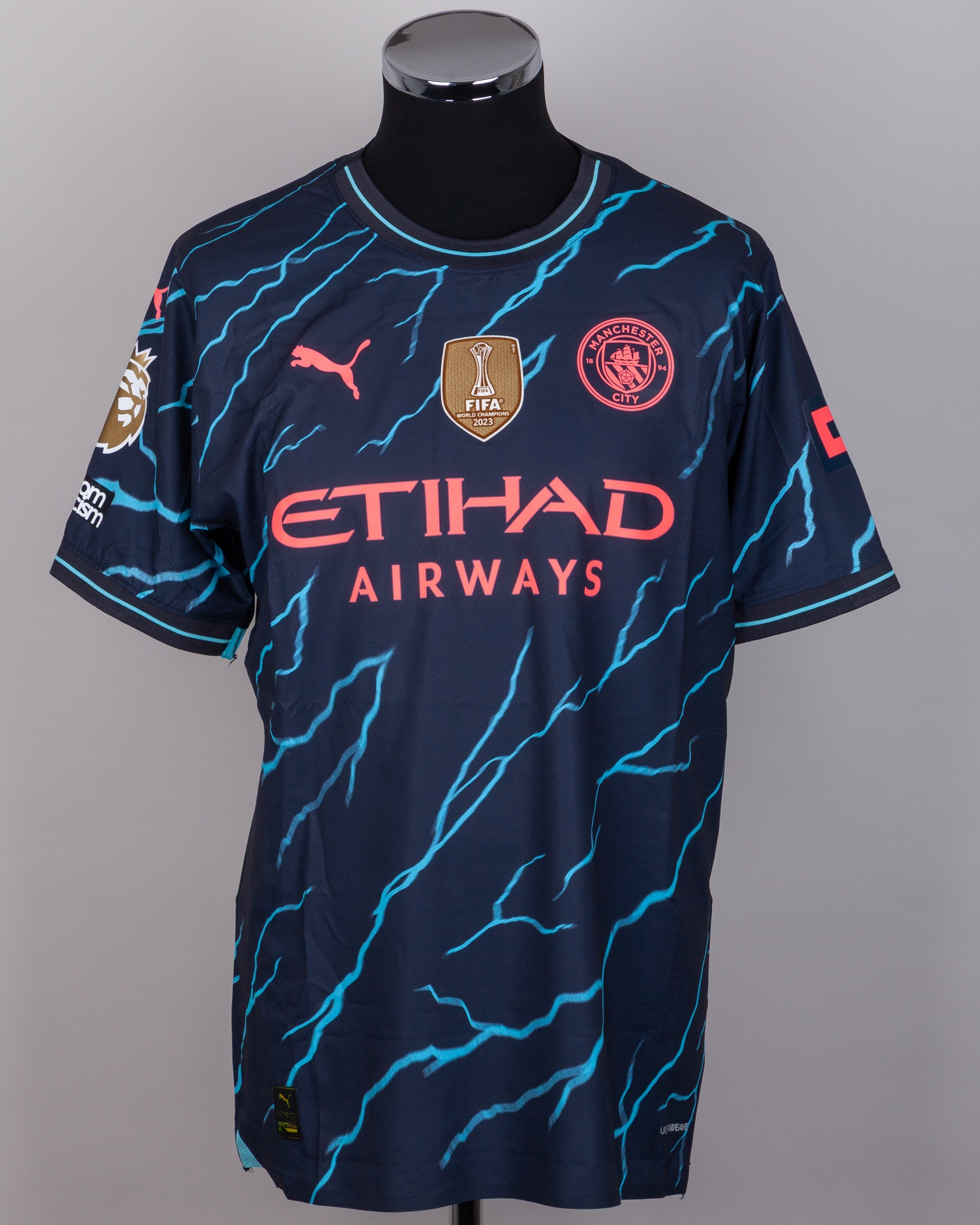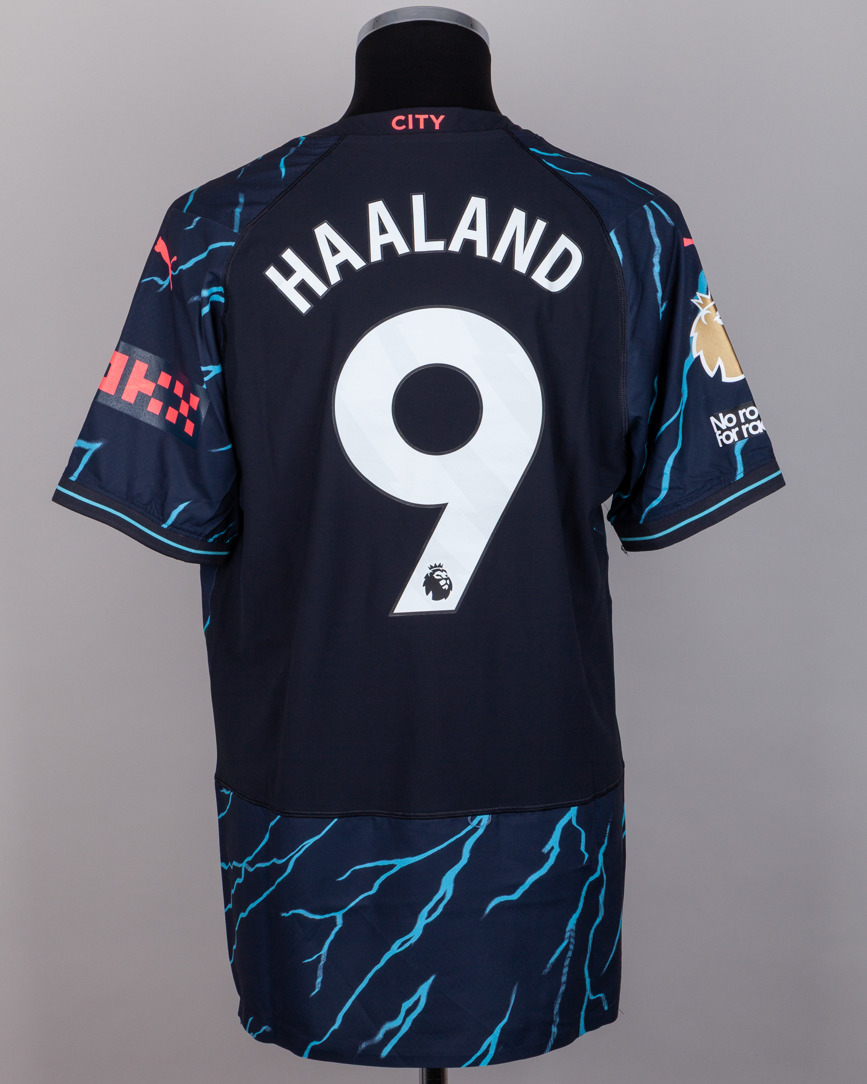 Erling Haaland blue No.9 Manchester City match issued short-sleeved shirt, 2023-24, Puma, XL, with crew-neck collar and printed badge, the reverse lettered HAALAND, the right sleeve with Premier League Champions and No Room for Racism flashes