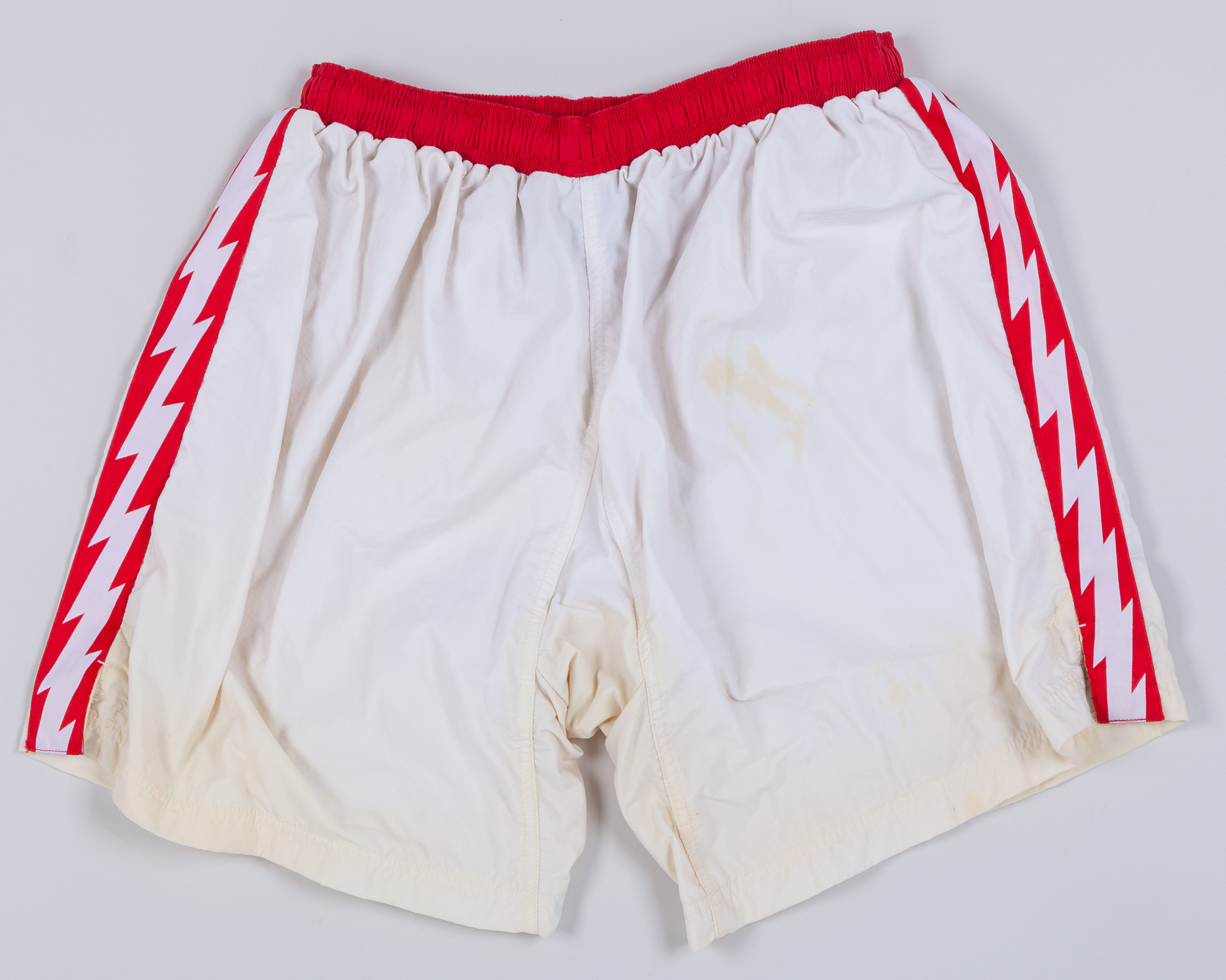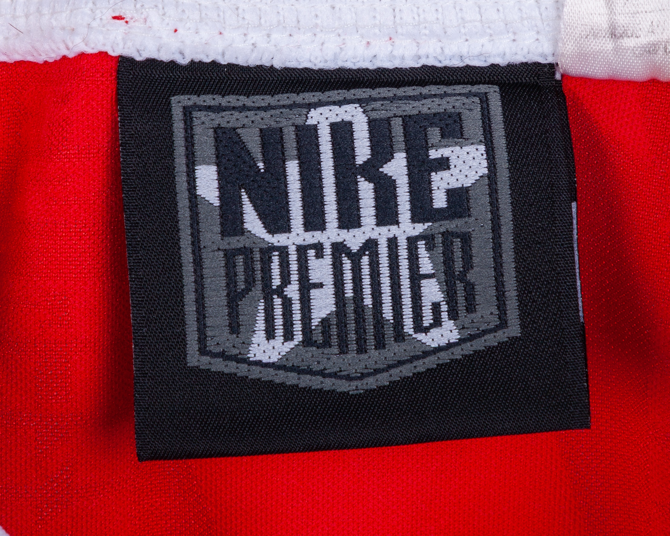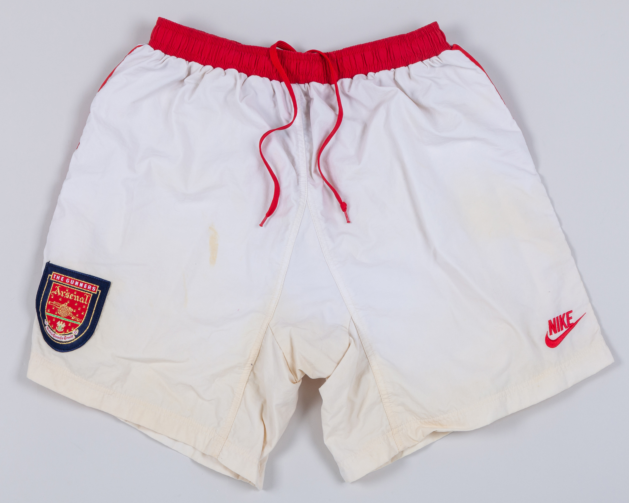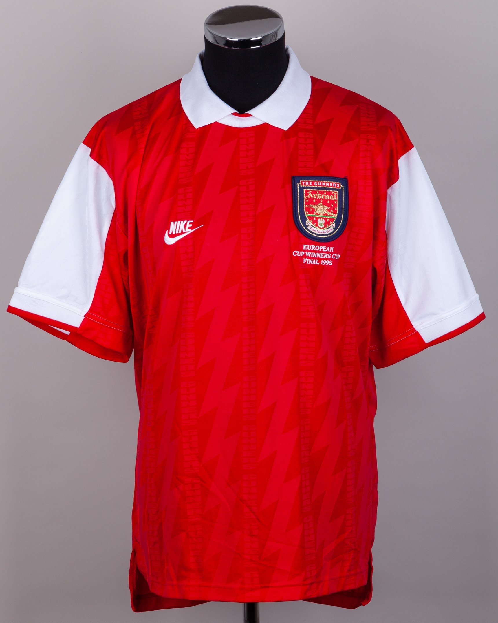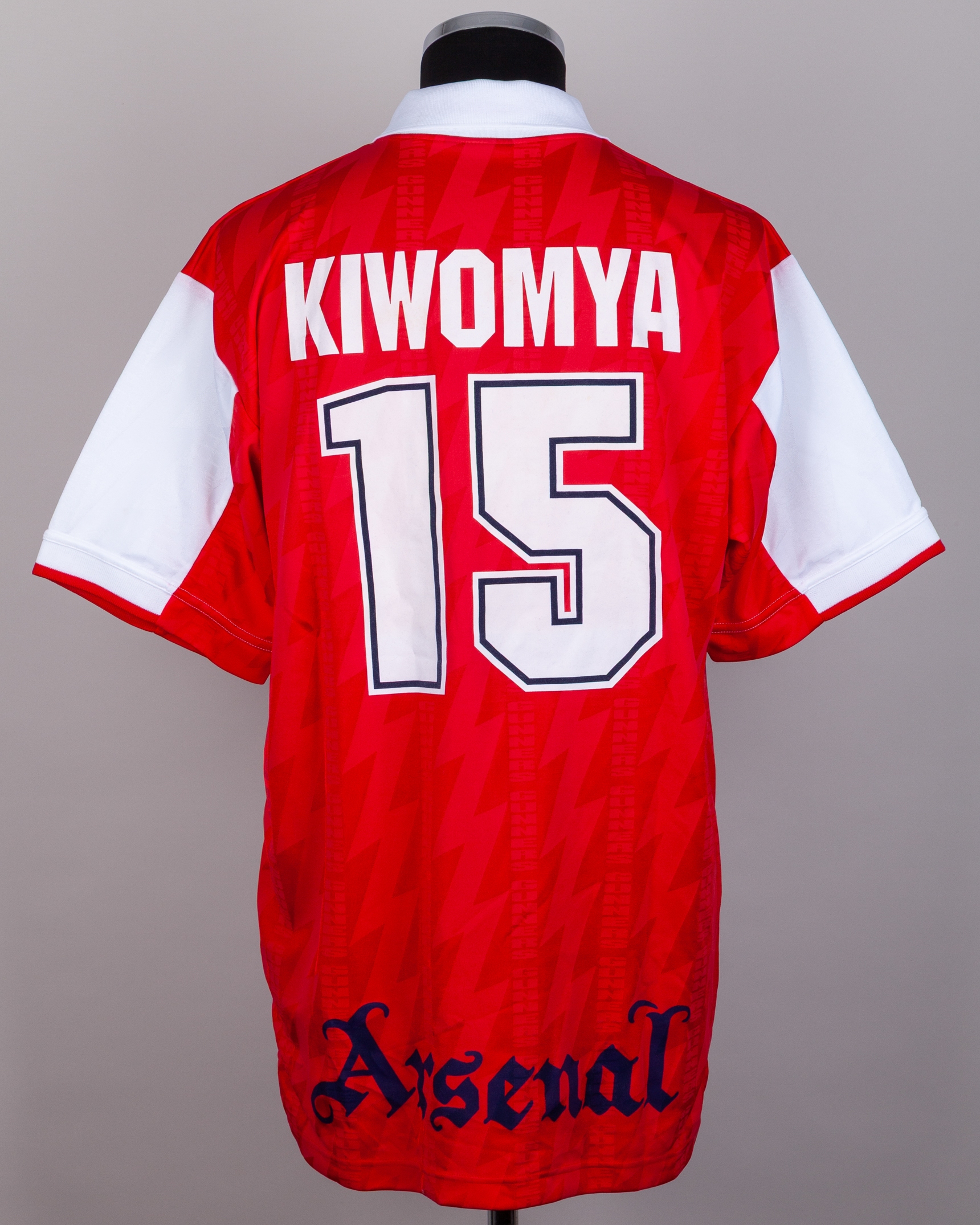 Chris Kiwomya red and white No.15 Arsenal v. Zaragoza Cup Winners Cup Final short-sleeve shirt, 1995, Nike, XL, with crew-neck collar and embroidered cloth badge inscribed THE GUNNERS EUROPEAN CUP WINNERS CUP FINAL 1995, the reverse lettered KIWOMYA and associated shorts