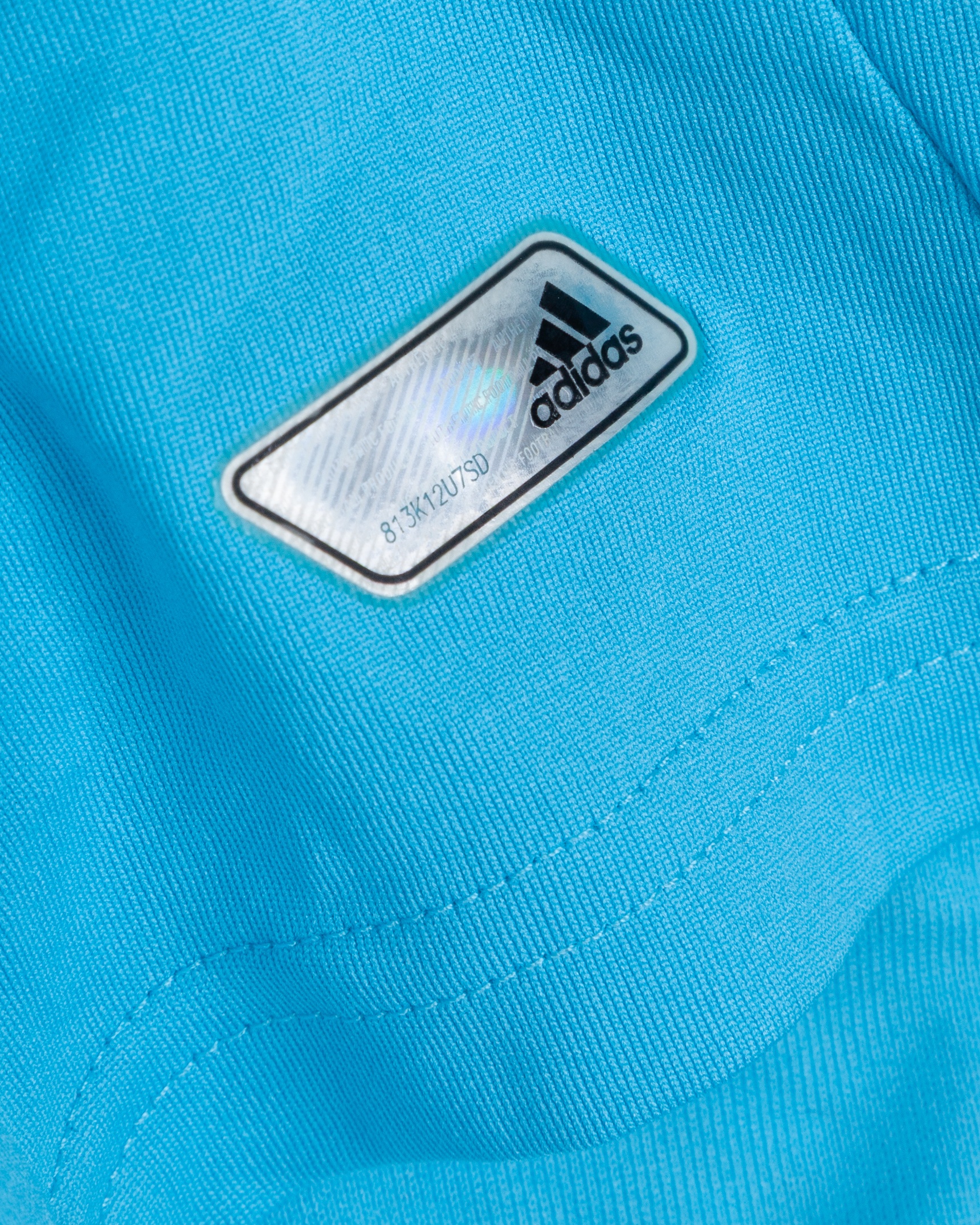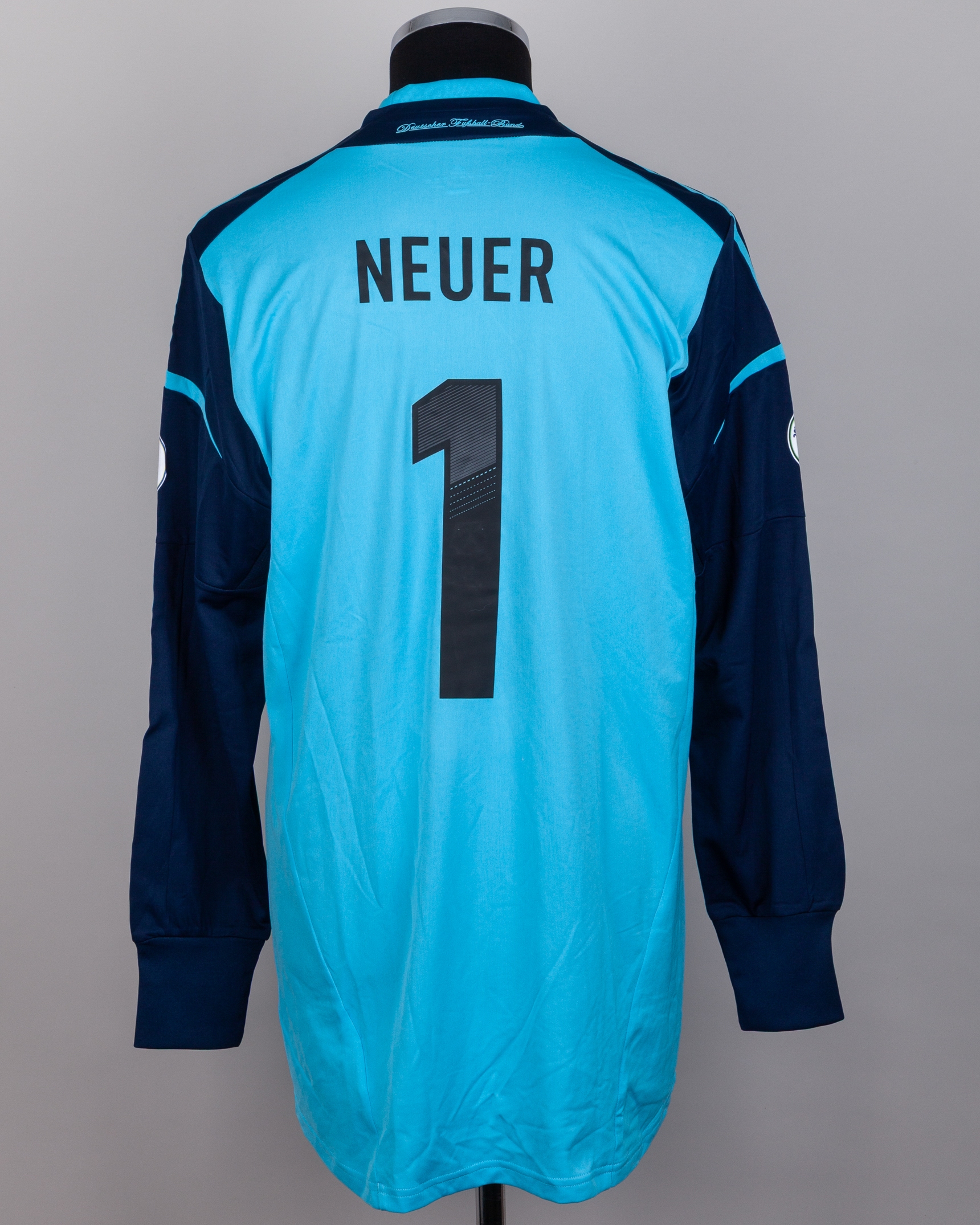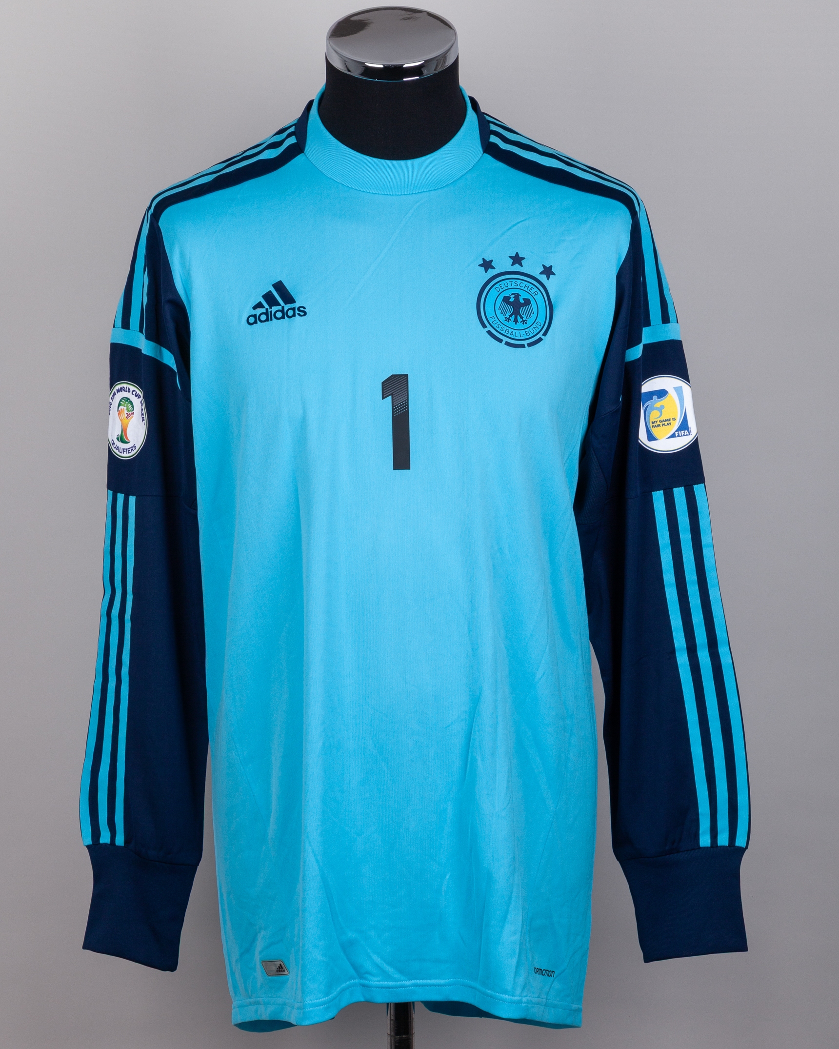 Manuel Neuer blue No.1 Germany v. Austria goalkeepers shirt, 2014, Adidas, XL, with crew-neck collar and printed badge, the reverse lettered NEUER, the right sleeve with 2014 FIFA World Cup Brazil Qualifiers flash, the other with FIFA My Game is Fair Play flash