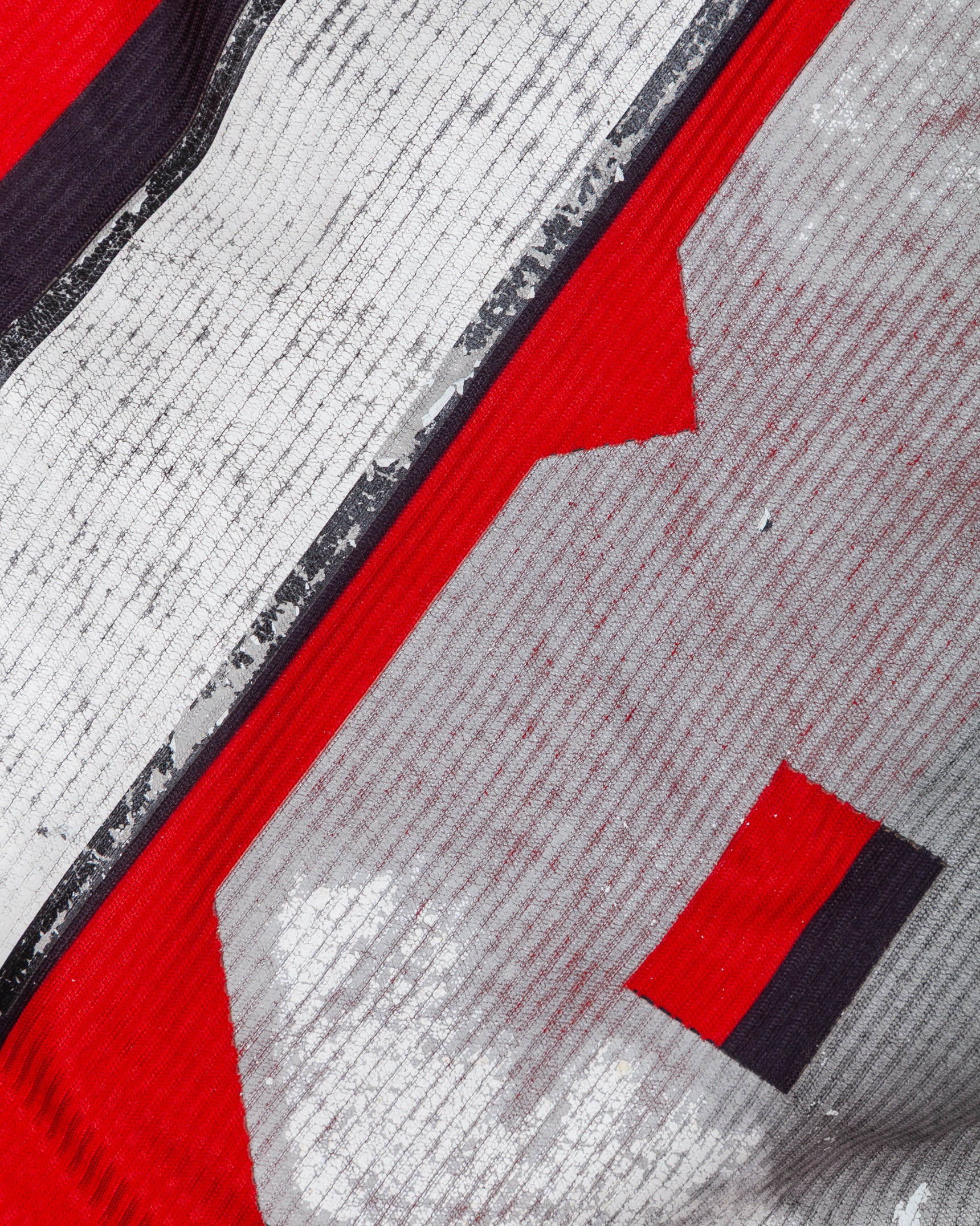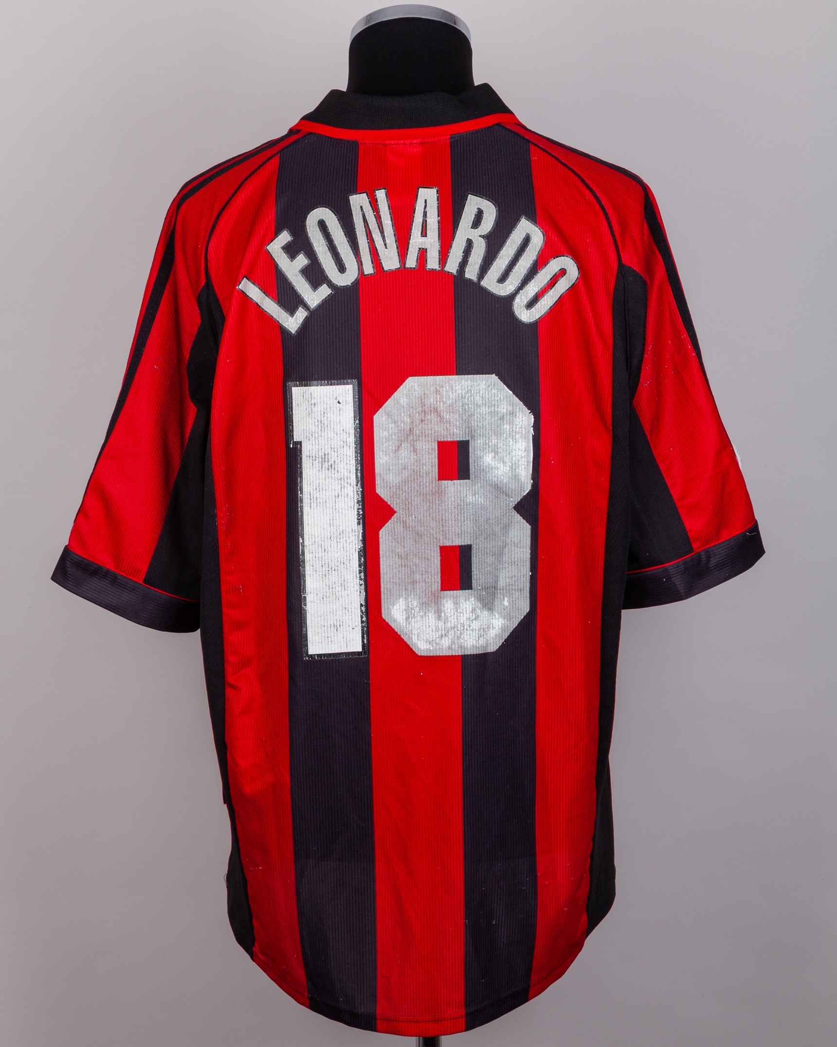 Leonardo red and black No.18 AC Milan short-sleeved shirt, 1998-99, Adidas, XL, with v-neck collar and embroidered badge, the reverse lettered LEONARDO, the right sleeve with Lega Calcio flash, the other with Milan 1899-1999 flash, sponsors logo stained, name set and number faded and worn, material pulls, Lega Calcio flash detaching