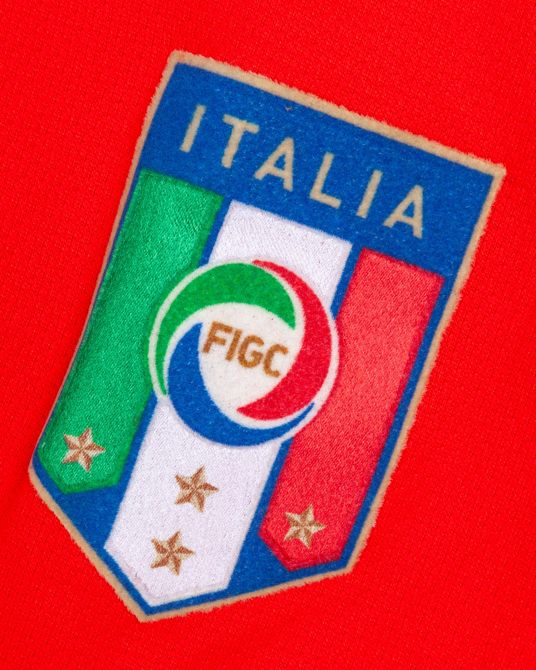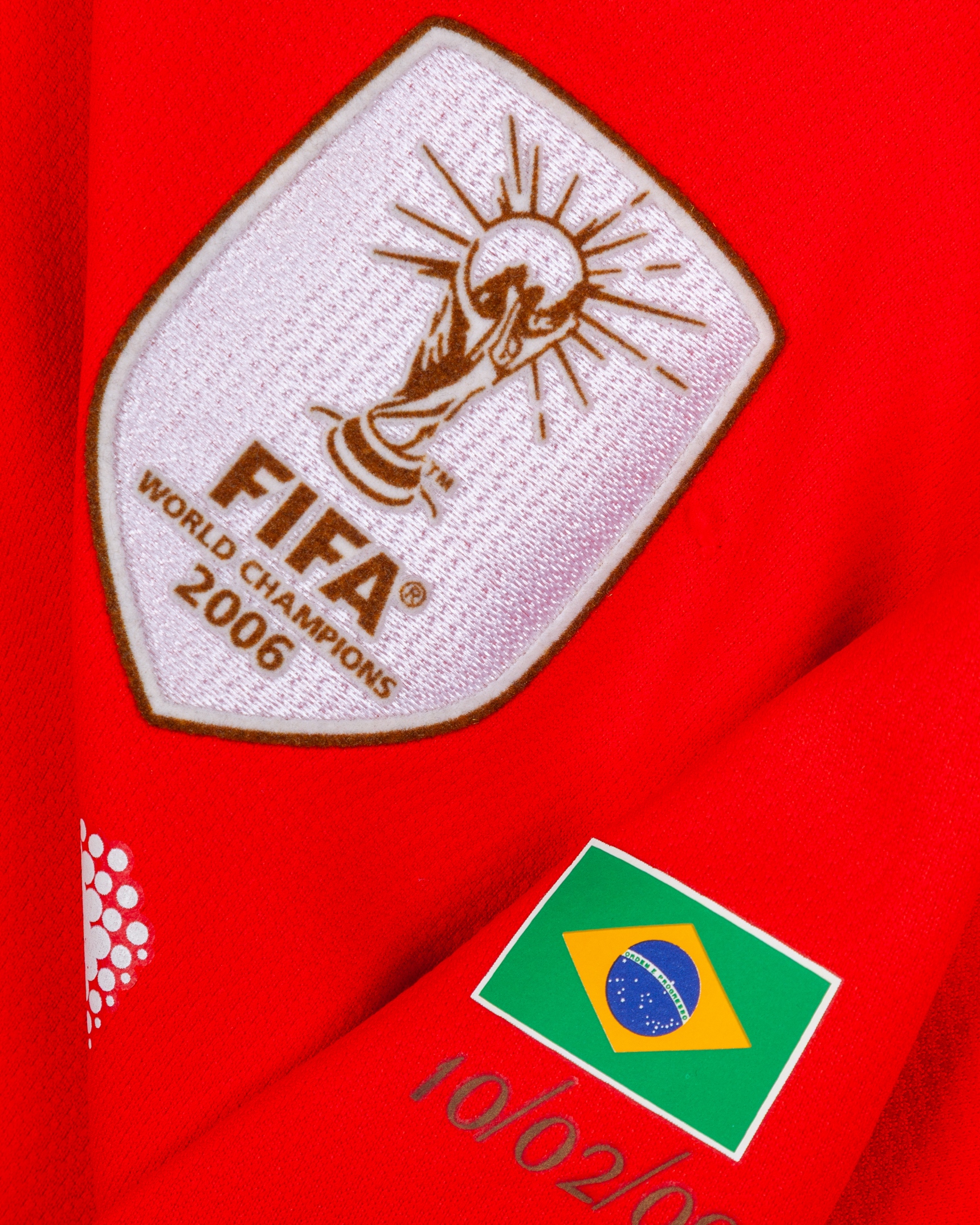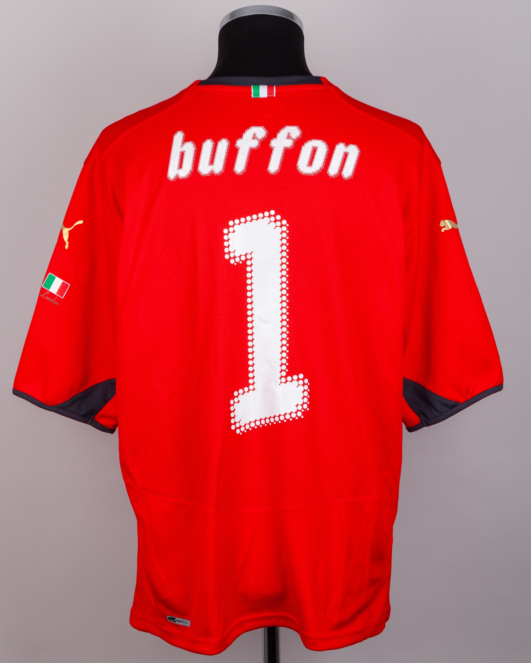Gianluigi Buffon red No.1 Italy v. Brazil short-sleeved shirt, 2009, Puma, XL, with crew-neck collar and felt badge, with FIFA World Champions 2006 badge, the reverse lettered buffon, the left sleeve with flags of nations 10/02/09 - London decal