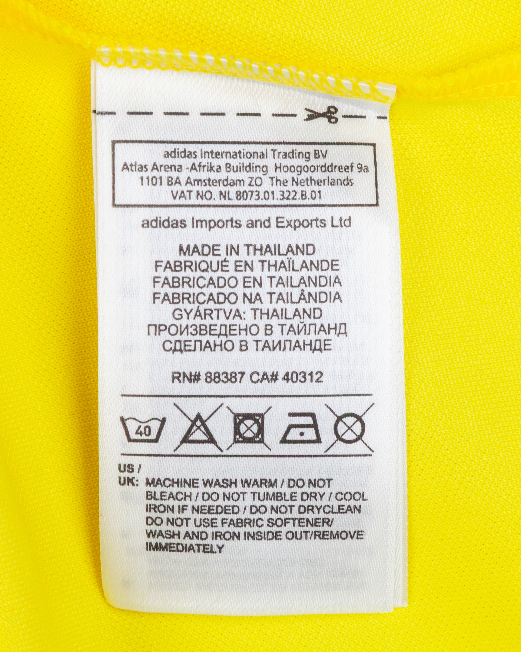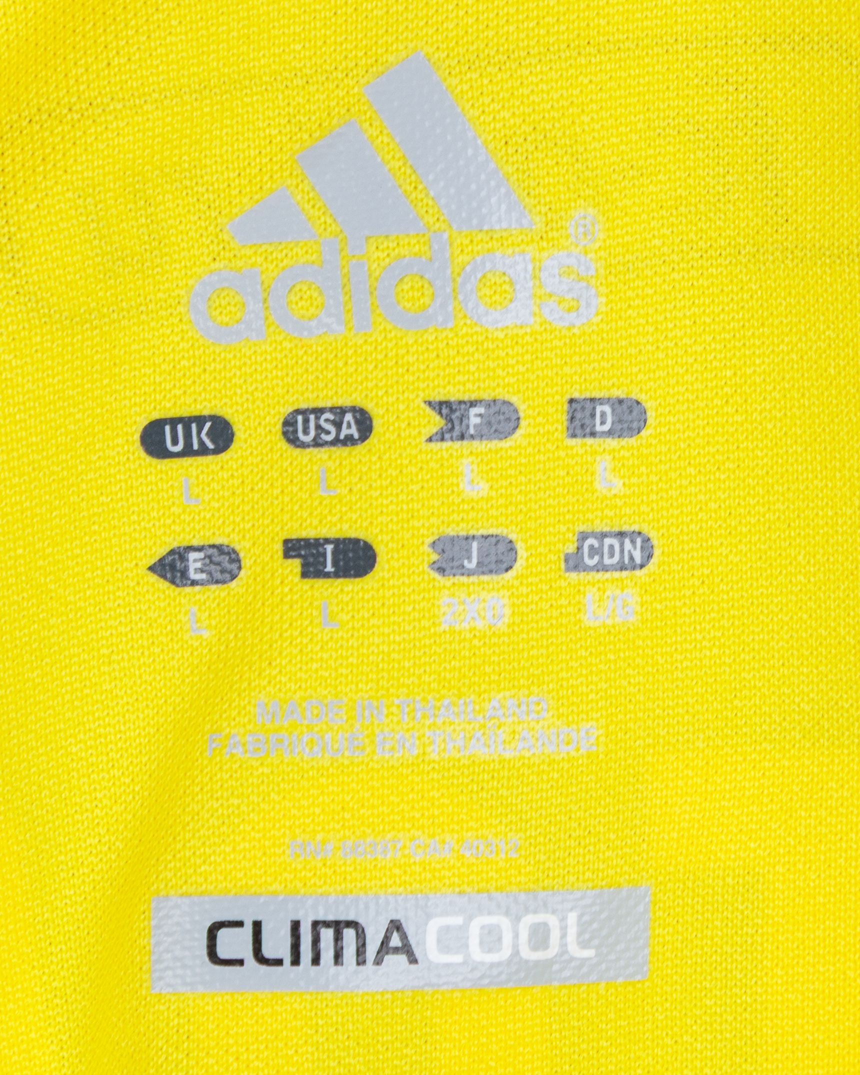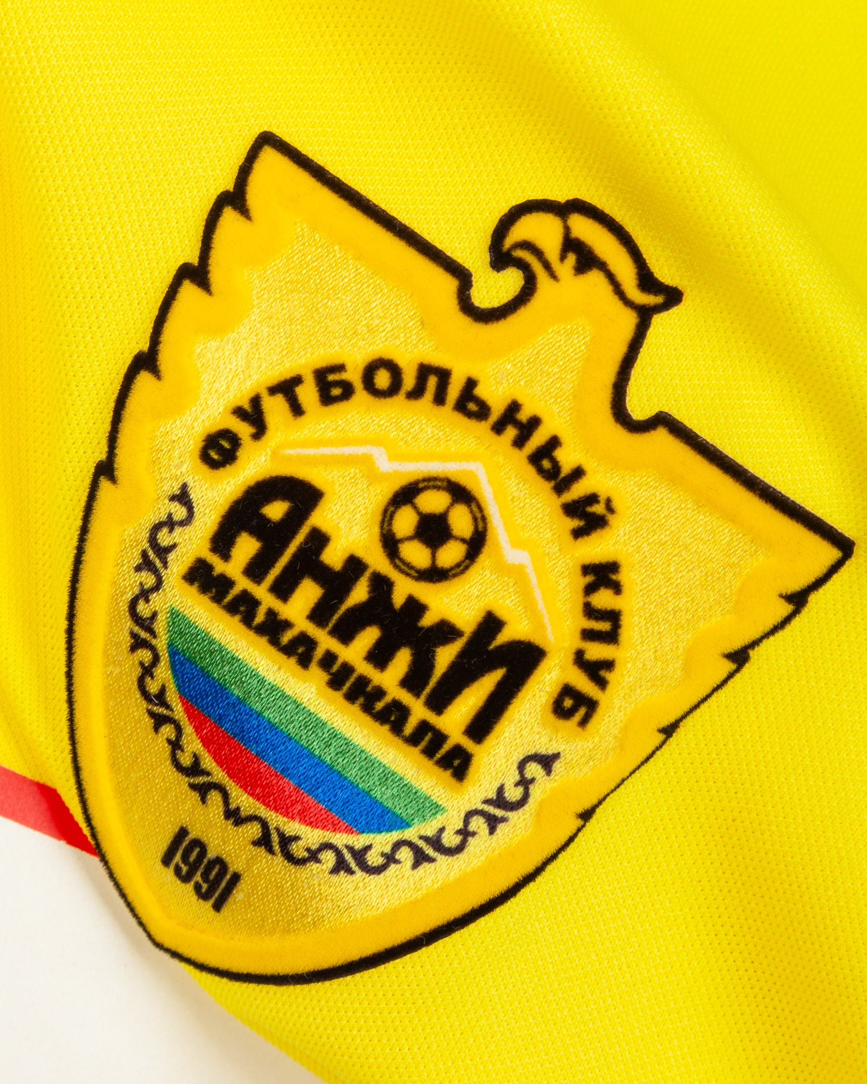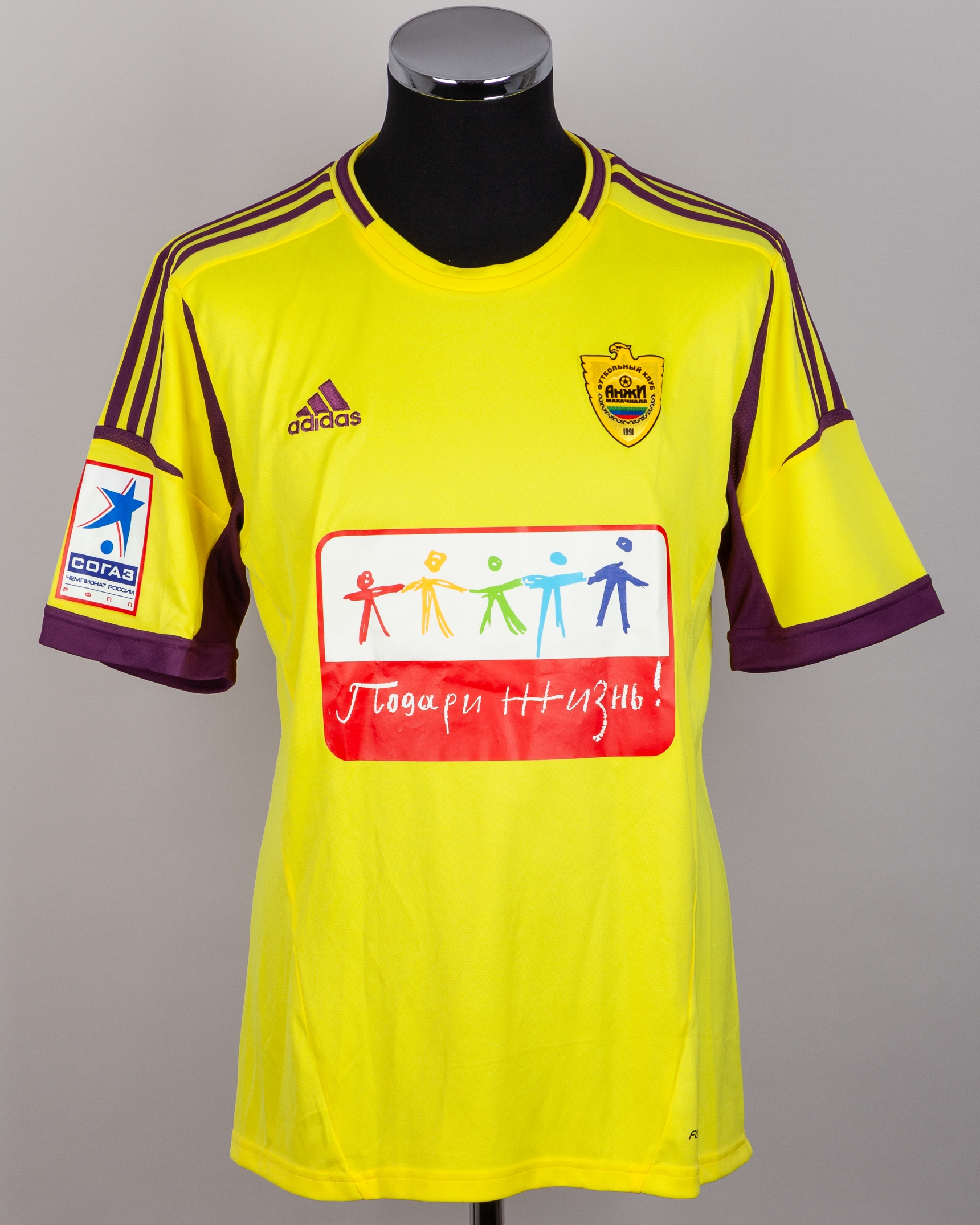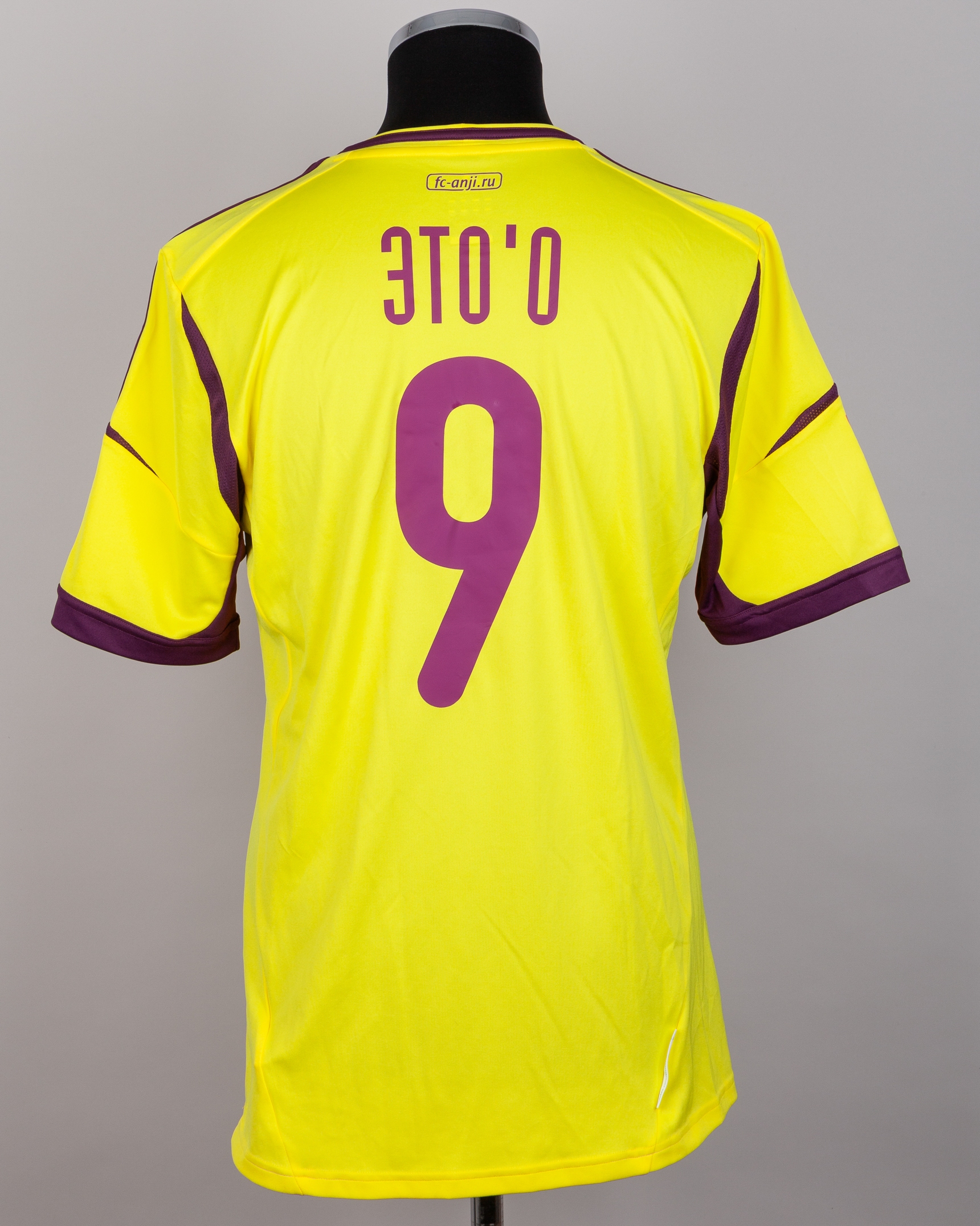 Samuel Eto'o yellow and purple No.9 Anzhi Makhatchkala short-sleeved shirt, 2012-13, Adidas, L, with crew-neck collar and felt badge, the reverse lettered ETO'O, the right sleeve with league flash