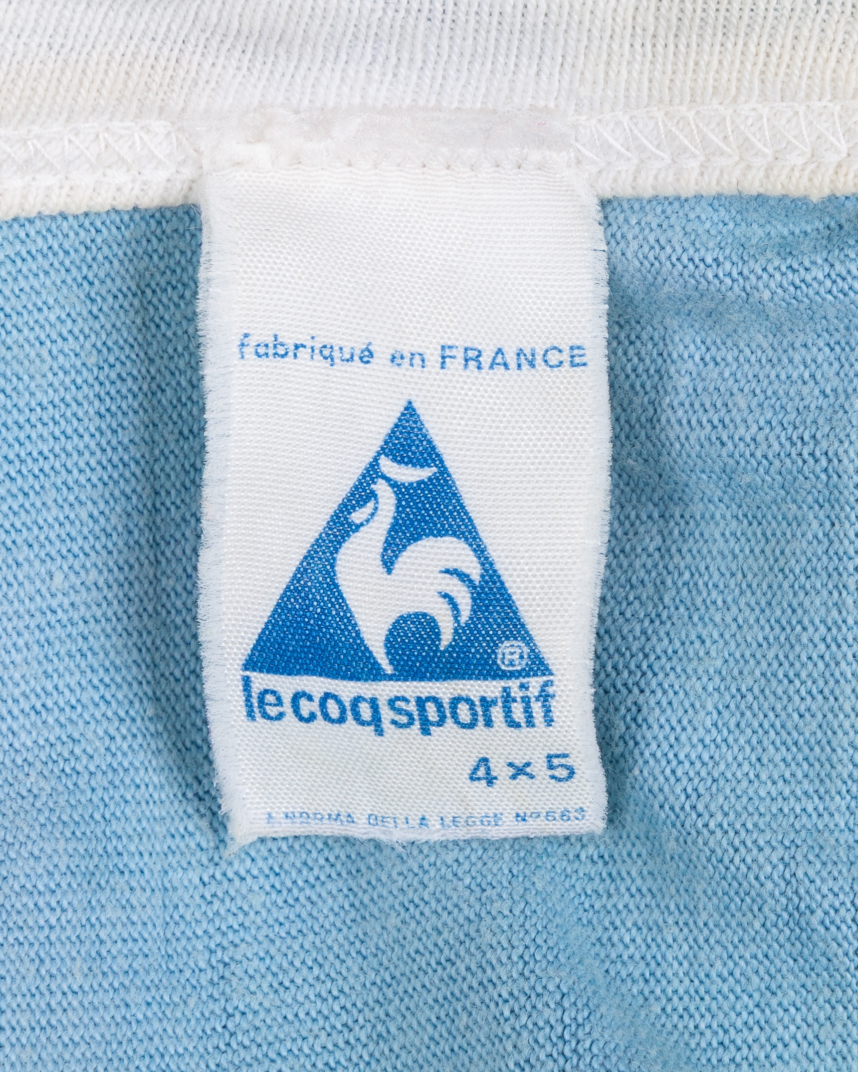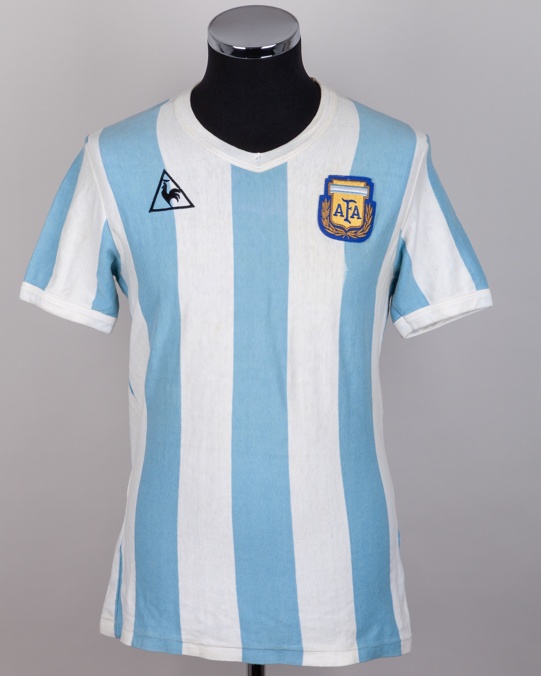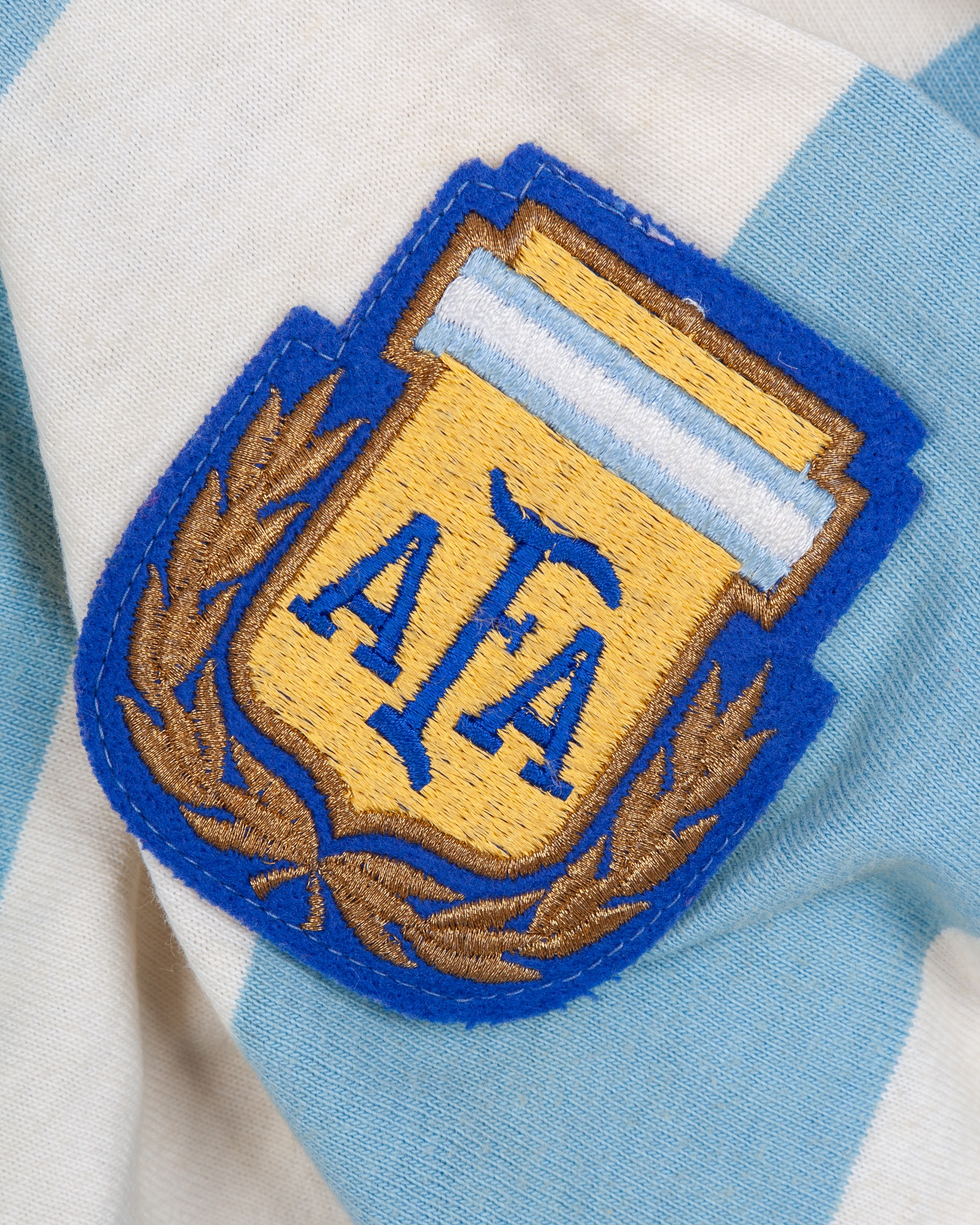 Blue and white No.7 Argentina shirt-sleeved shirt, 1982, Adidas, Le Coq Sportif, with v-neck collar and embroidered cloth badge inscribed AFA, staining and wear to collar