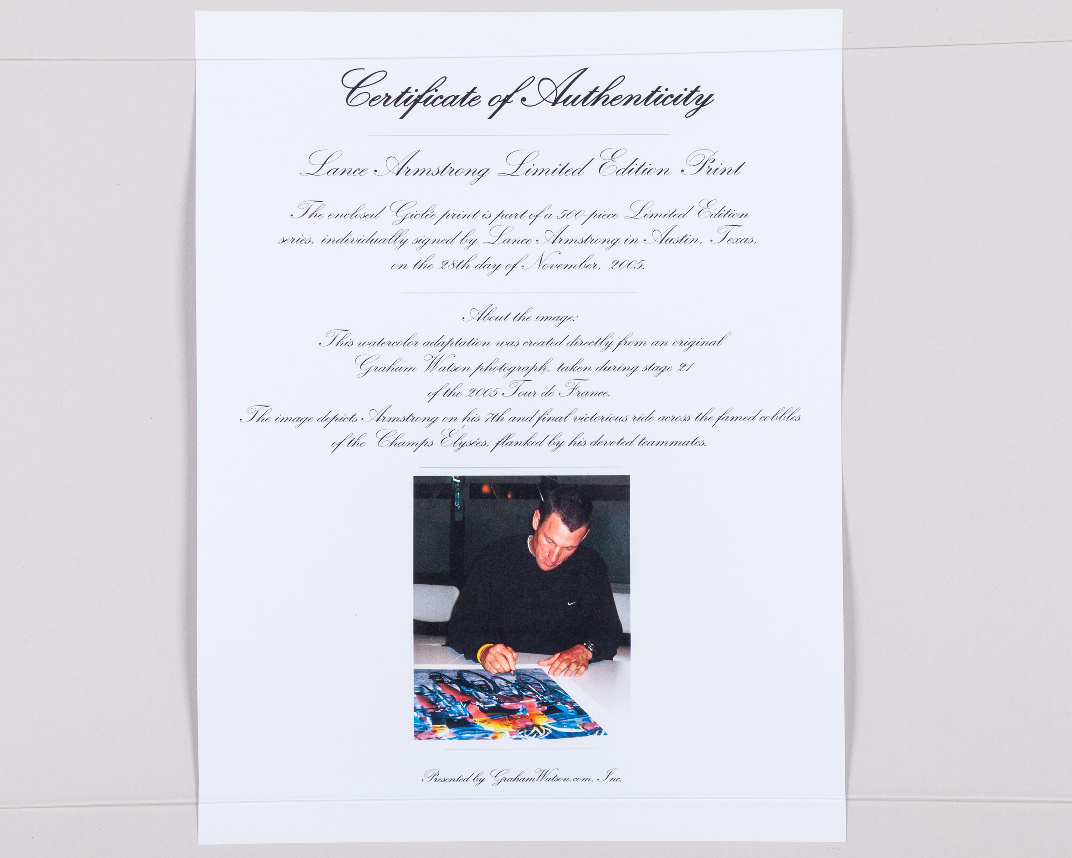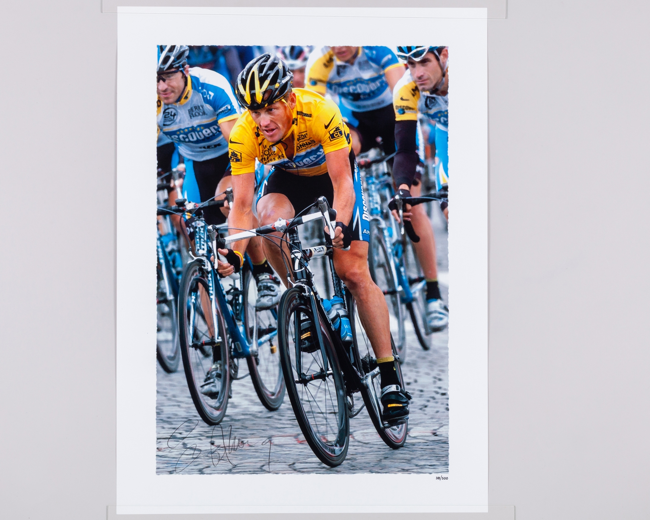 Lance Armstrong autographed limited edition print, 38/500, with COA, 50 x 69cm