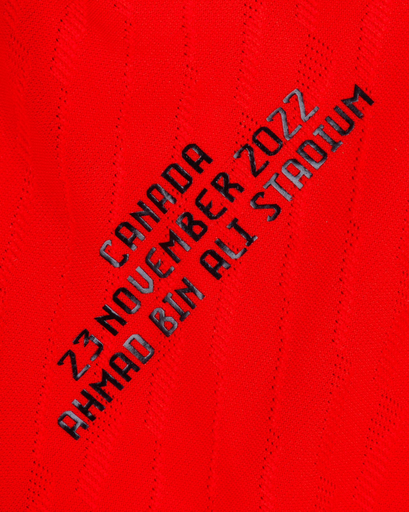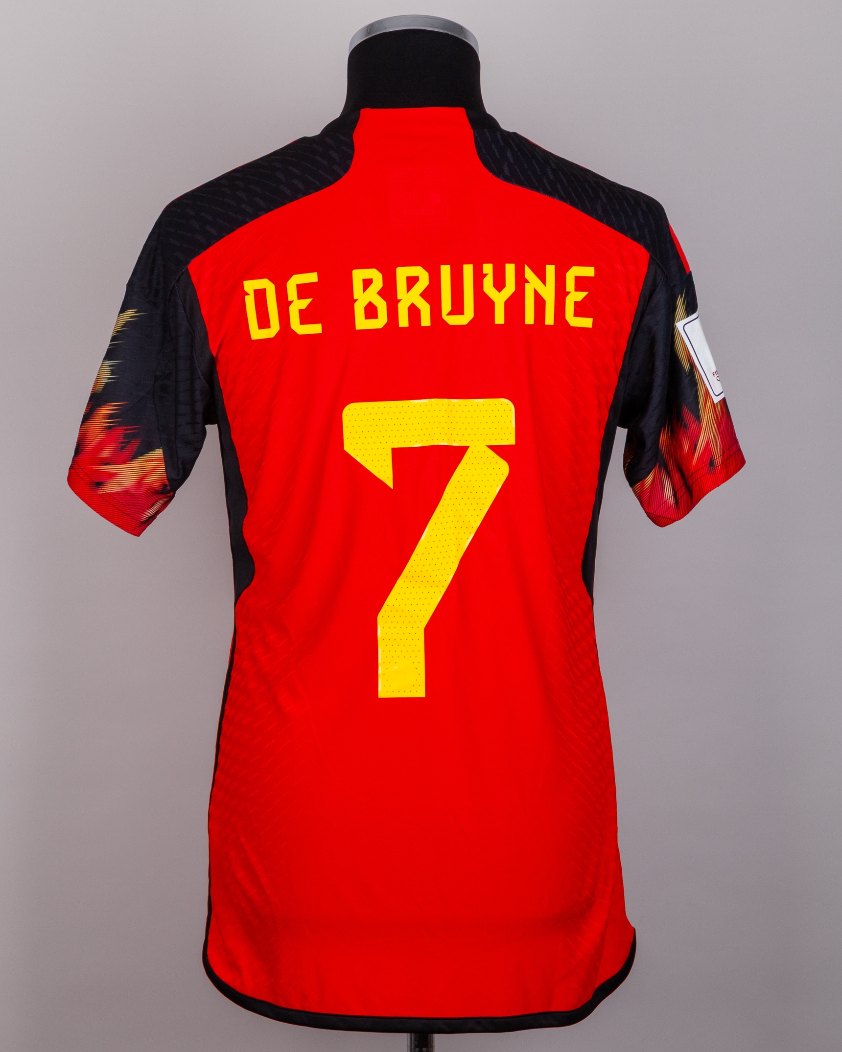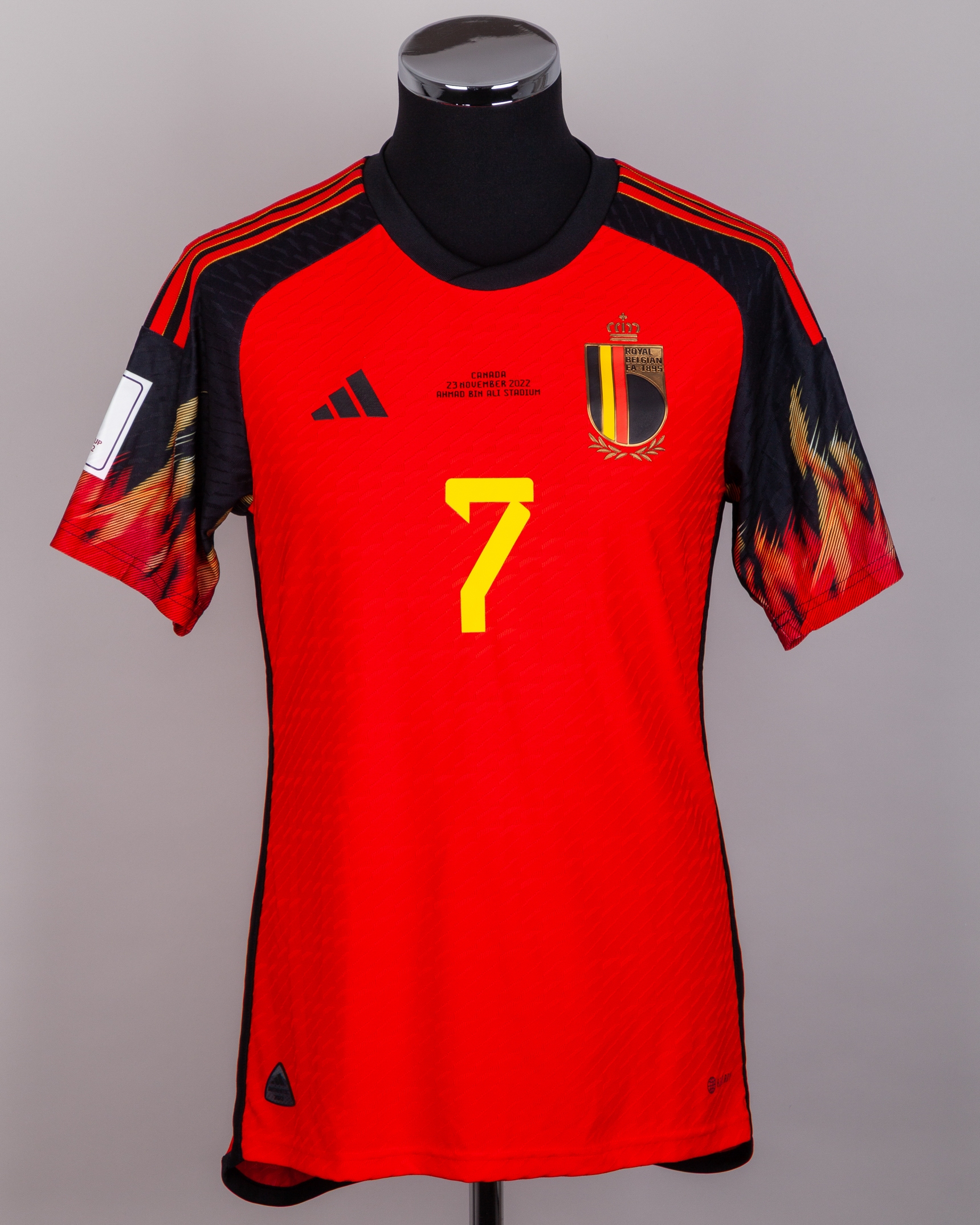 Kevin De Bruyne red and black No.7 Belgium v. Canada match issued short-sleeved shirt, 2022, Adidas, M, with crew-neck collar and printed badge, with CANADA 23 NOVEMBER 2022 AHMAD BIN ALI STADIUM decal, the reverse lettered DE BRUYNE, the right sleeve with FIFA World Cup Qatar 2022 flash and the left with Football Unites flash