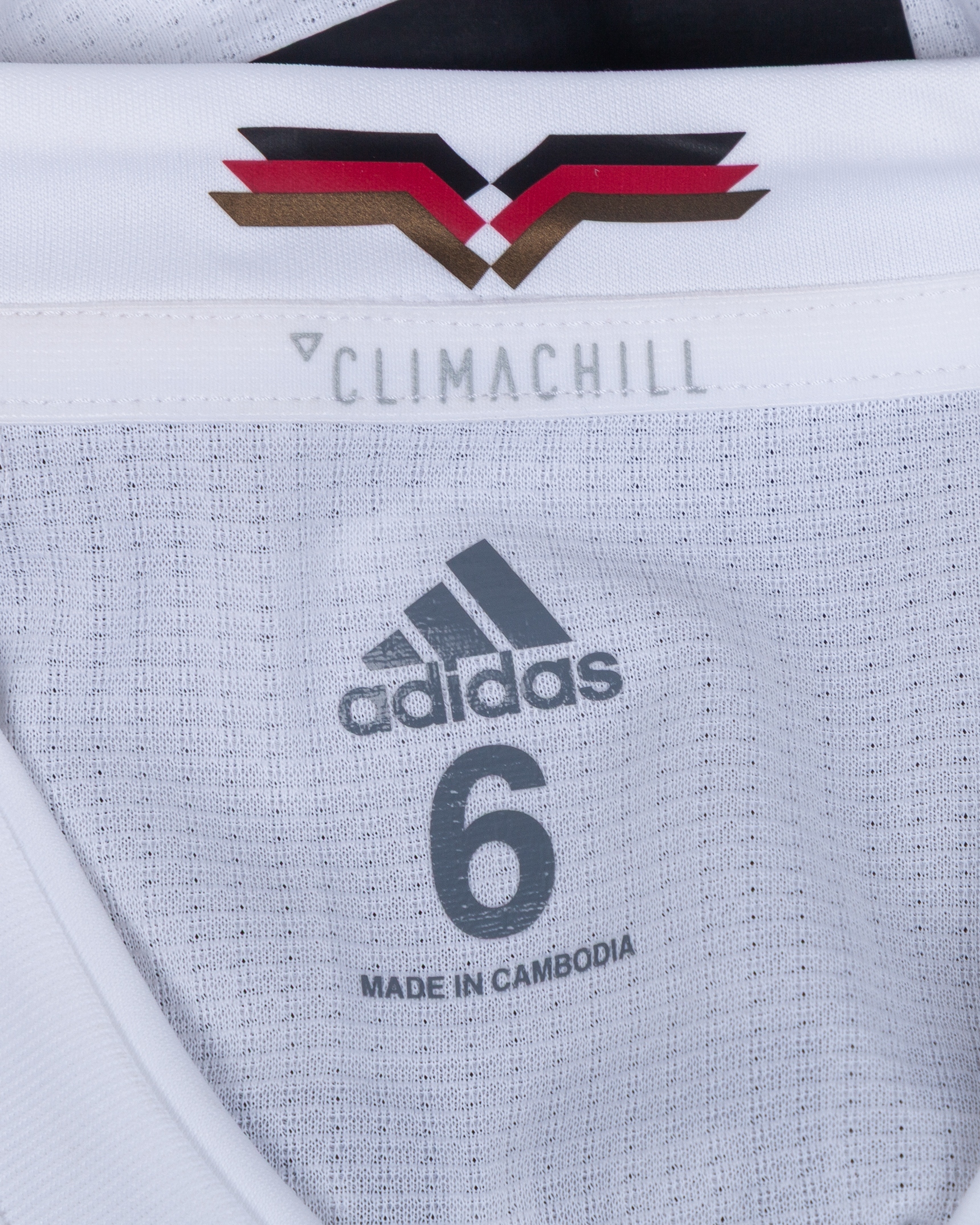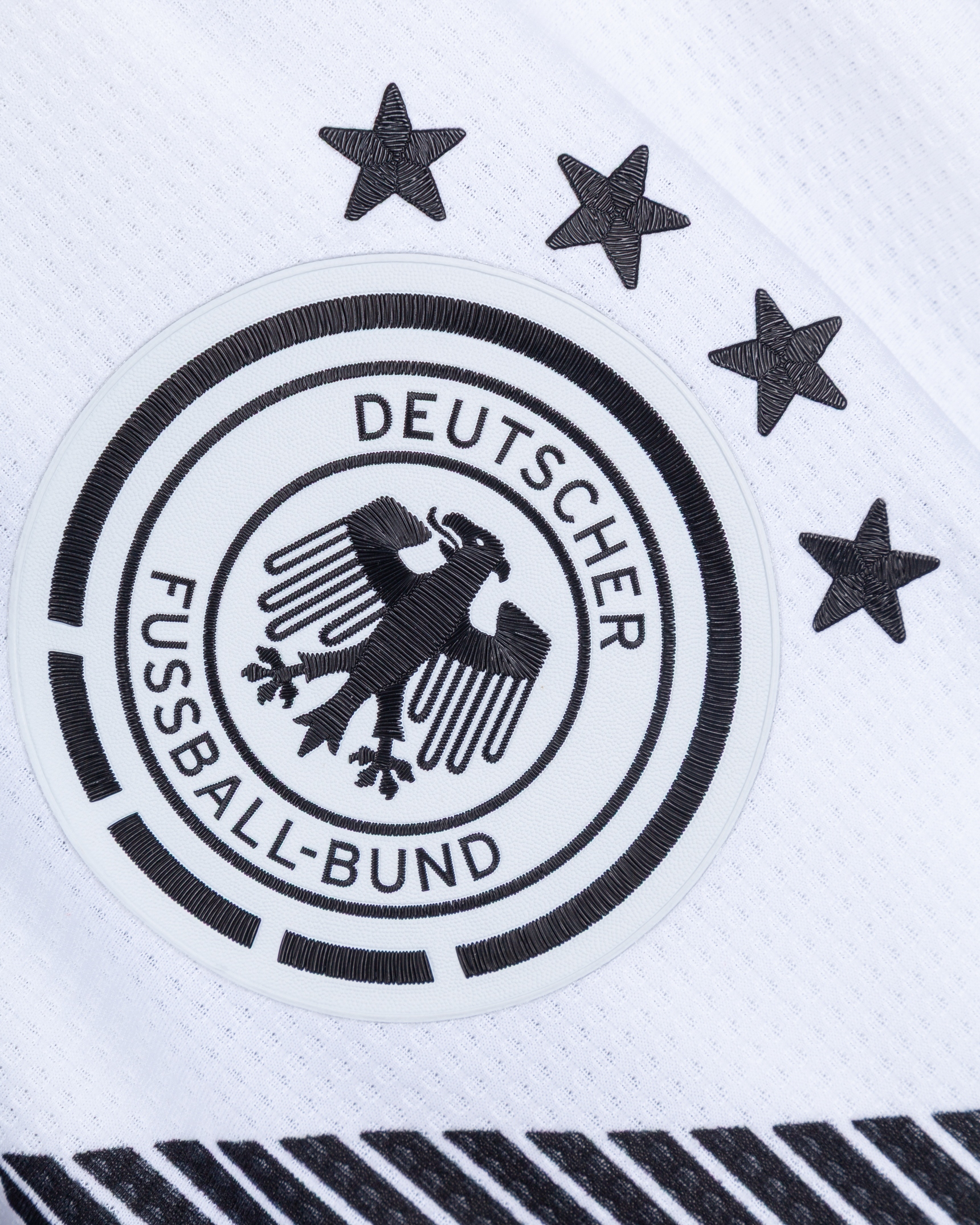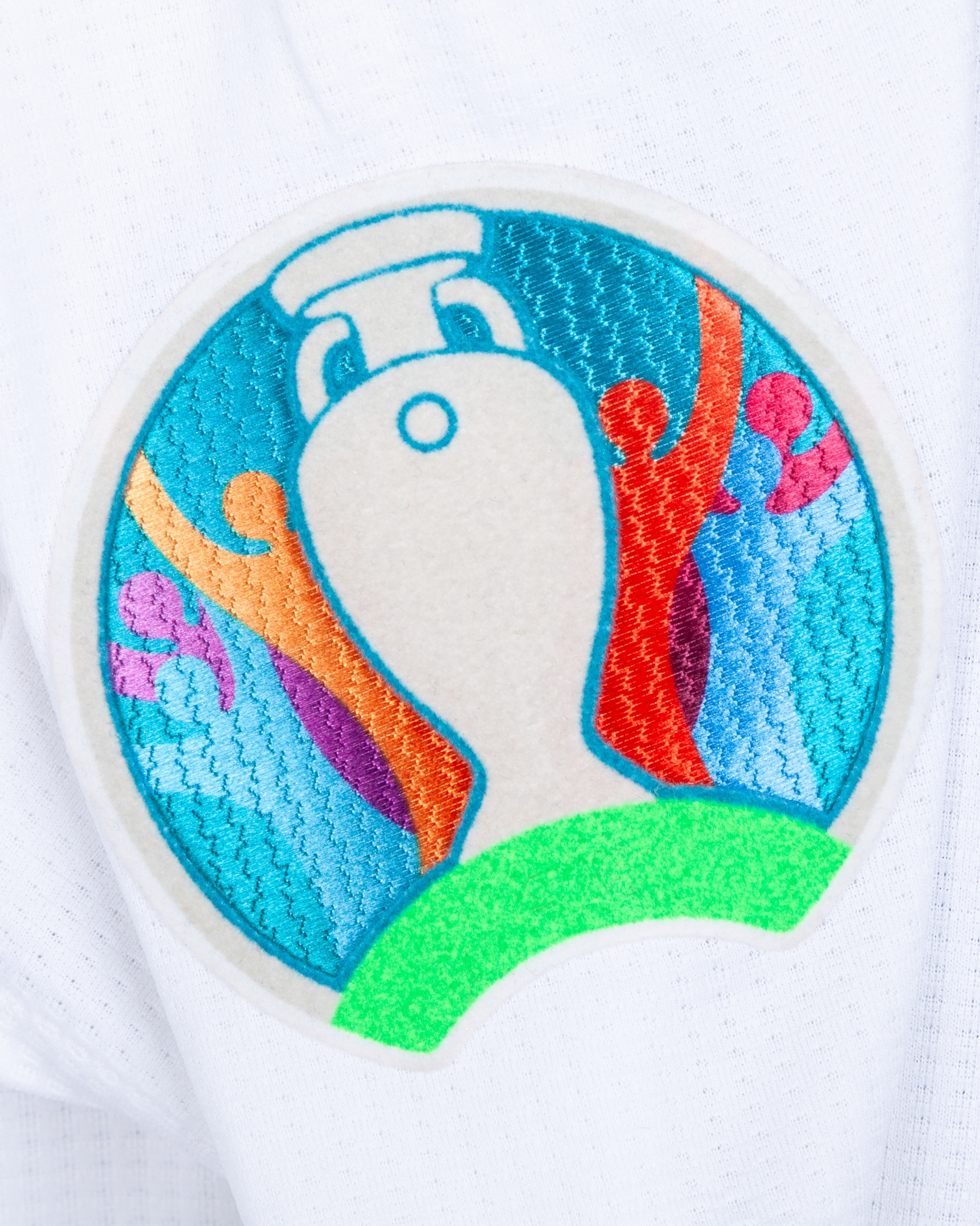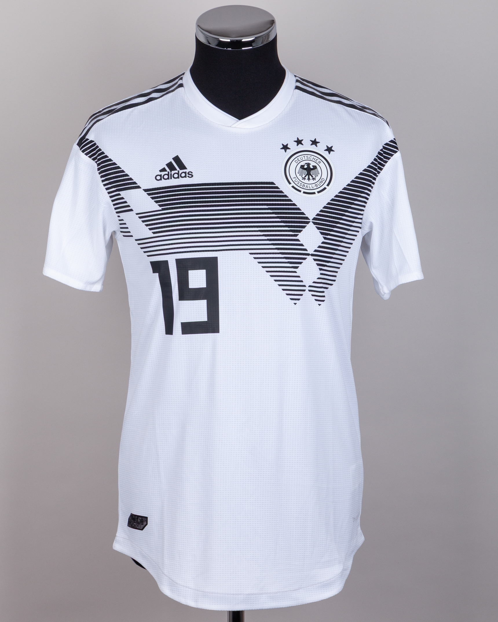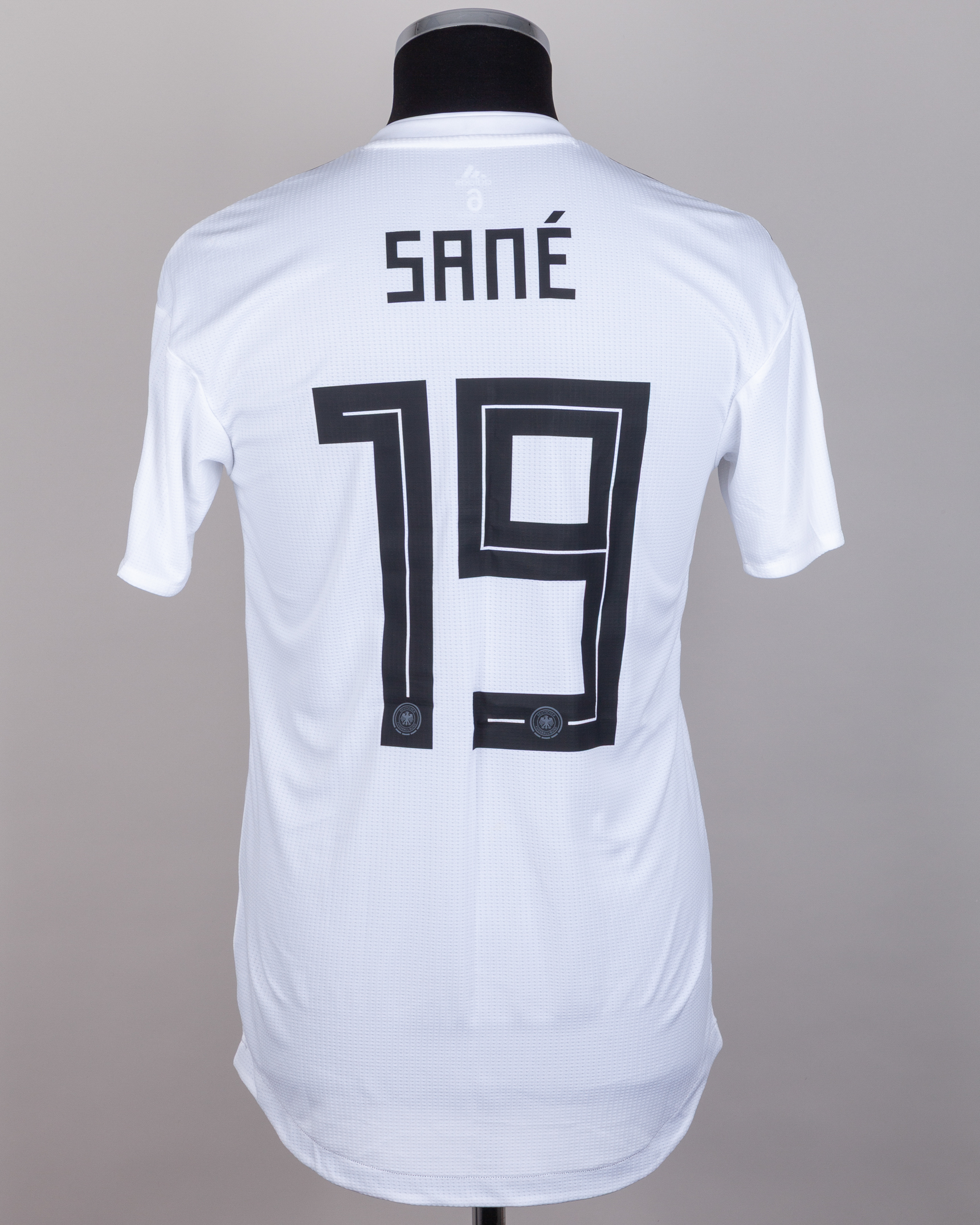Leroy Sane white and black No.19 Germany short-sleeved shirt, Adidas, 6, with v-neck collar and printed badge, the reverse lettered SANE, the right sleeve with Euros flash, the other with UEFA Respect flash