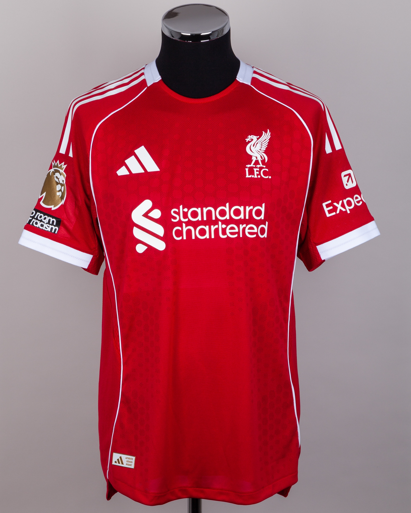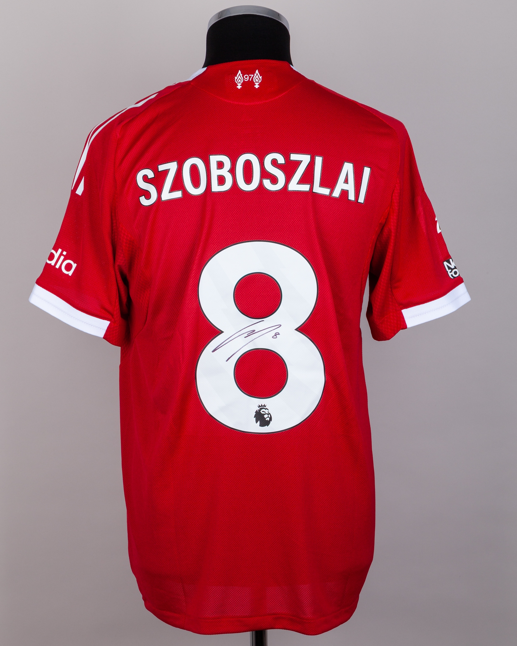 Dominik Szoboszlai red No.8 Liverpool autographed match issued short-sleeved shirt, Adidas, L, with crew-neck collar and printed badge, the reverse lettered SZOBOSZLAI, the number autographed, the right sleeve with Premier League Champions flash