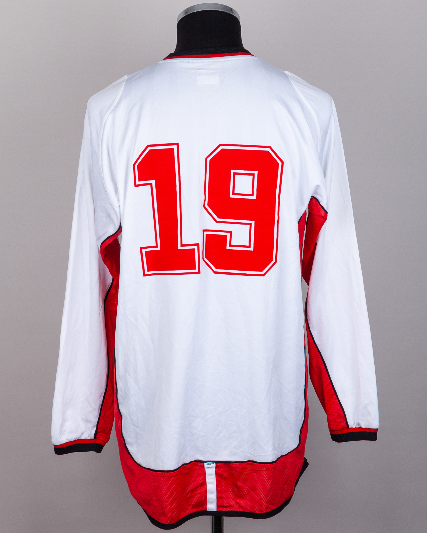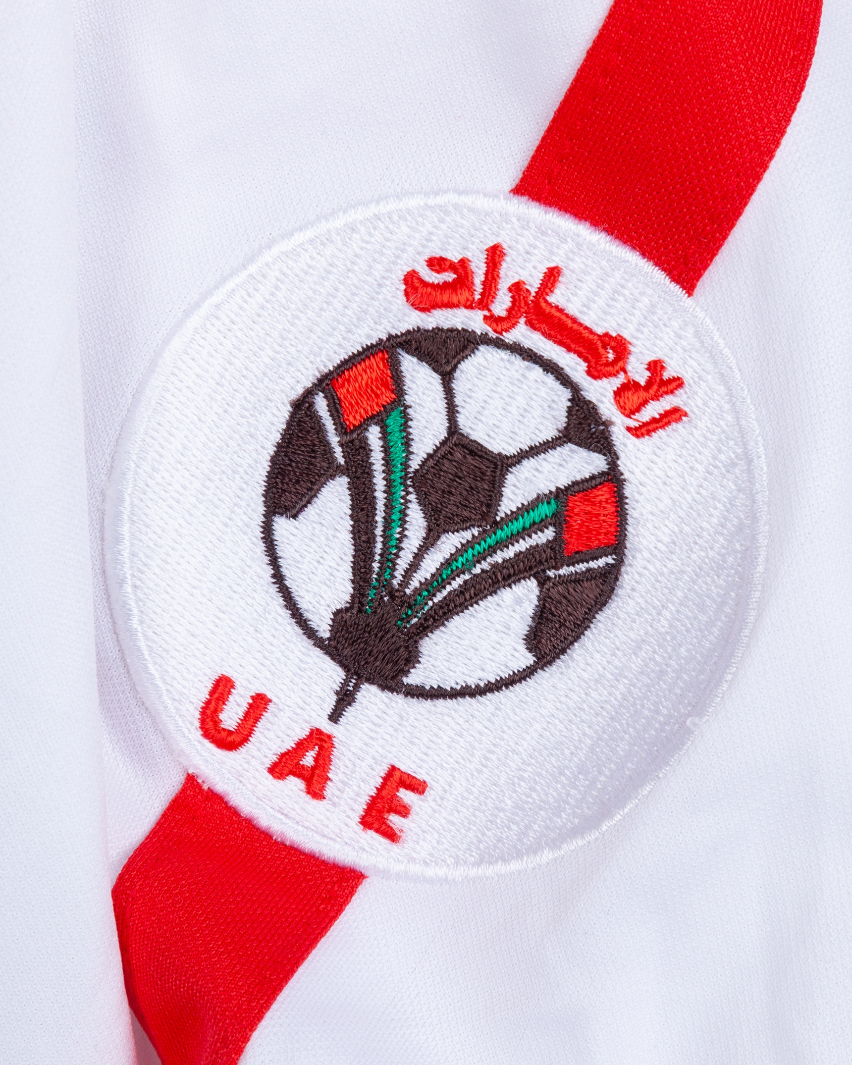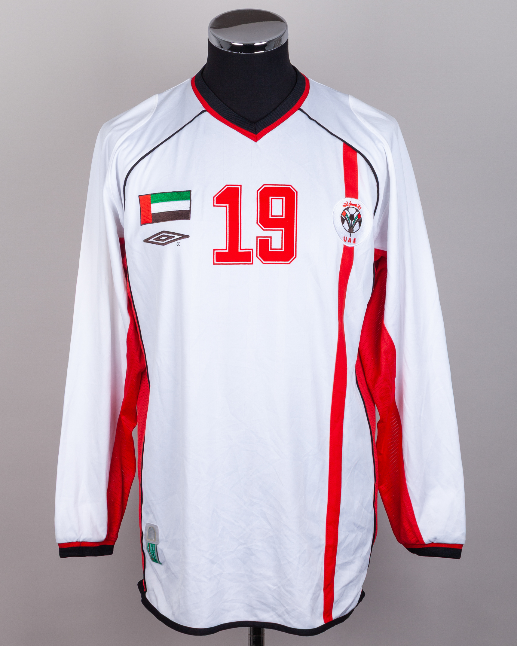 White and red No.19 United Arab Emirates long-sleeved shirt, Umbro, L, with v-neck collar and embroidered cloth badge inscribed UAE