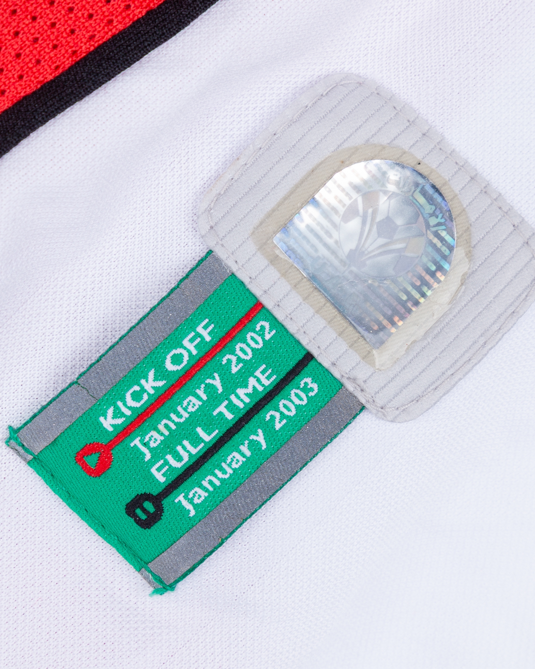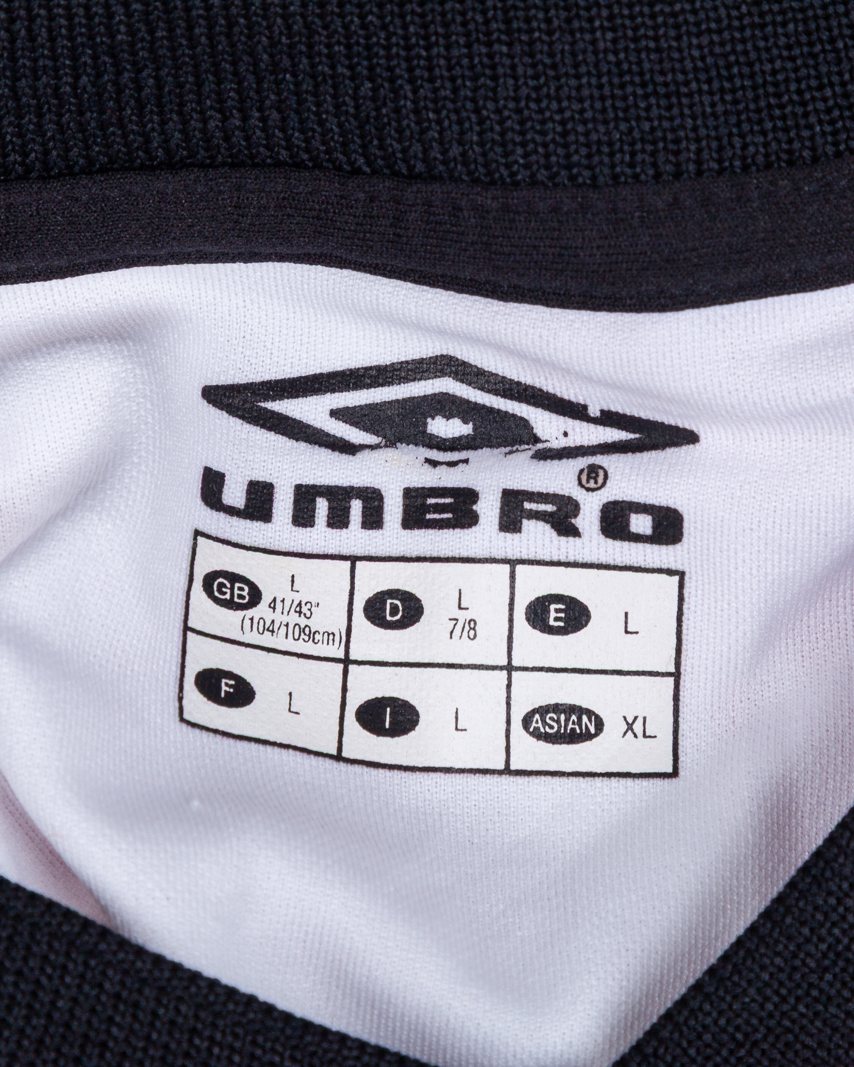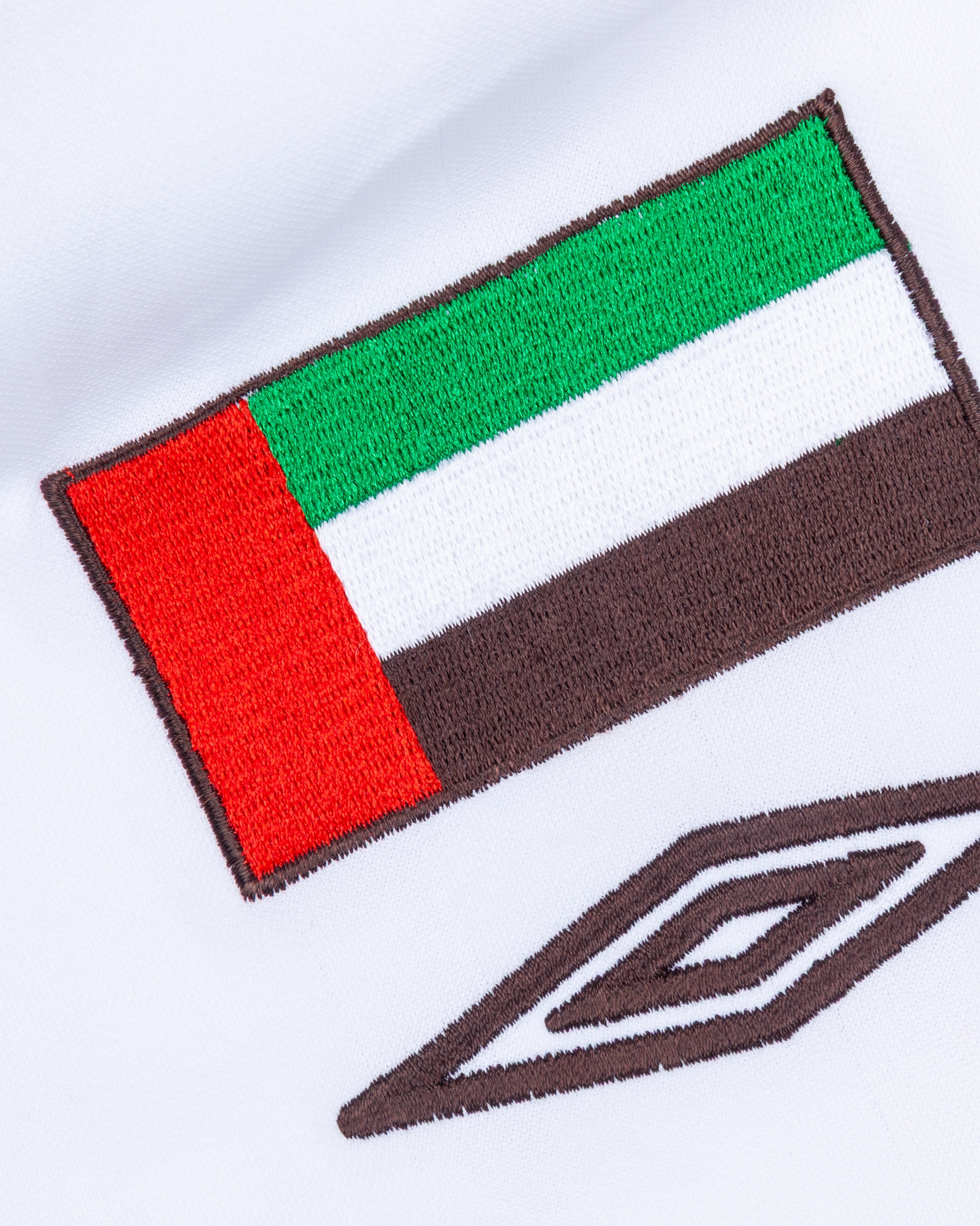 White and red No.19 United Arab Emirates long-sleeved shirt, Umbro, L, with v-neck collar and embroidered cloth badge inscribed UAE
