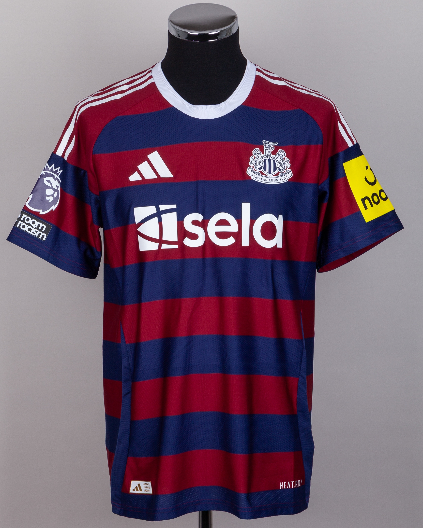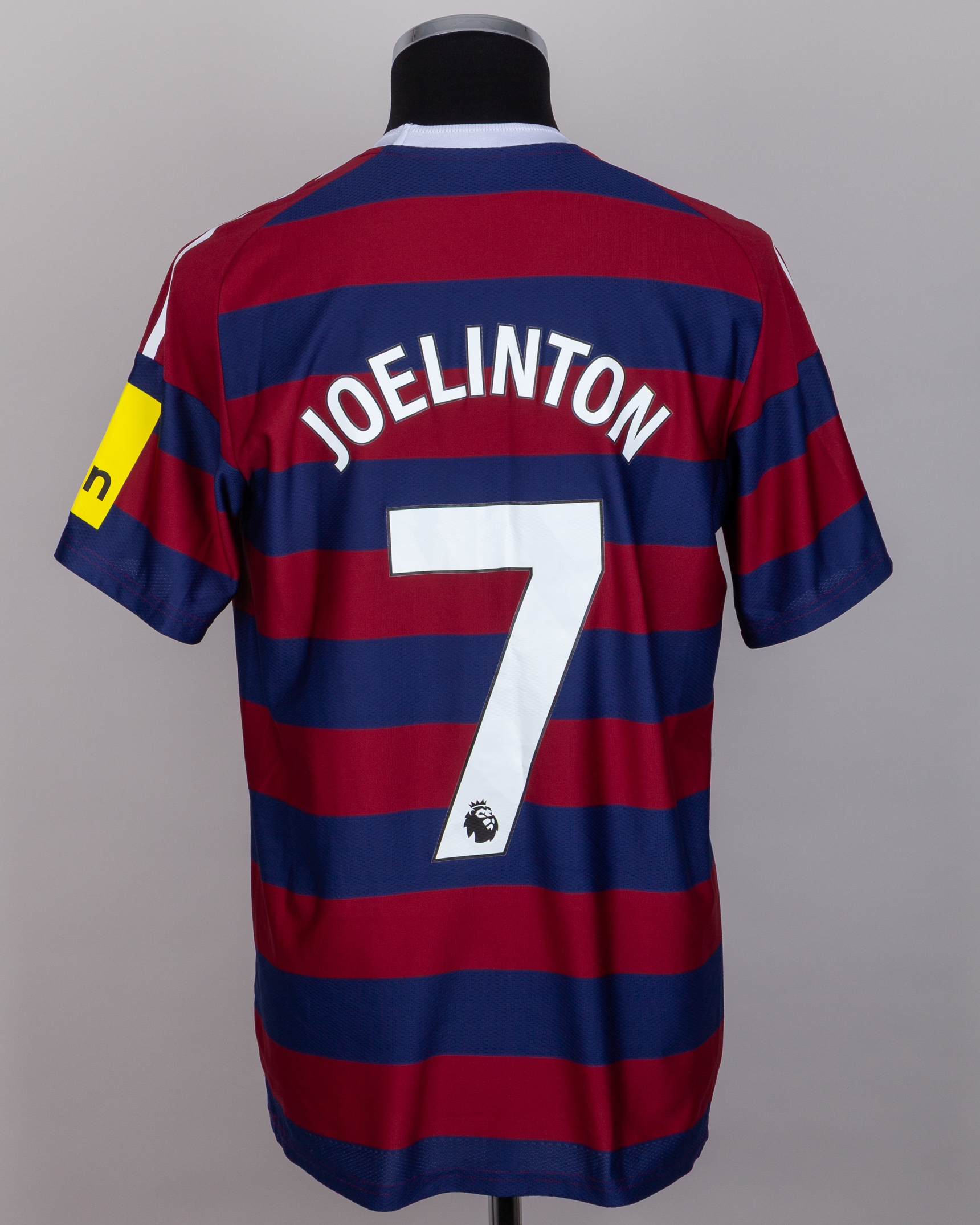 Joelinton maroon and blue No.7 Newcastle United short-sleeved shirt, 2024-25, Adidas, L, with crew-neck collar and printed badge, the reverse lettered Joelinton, the right sleeve with Premier League flash